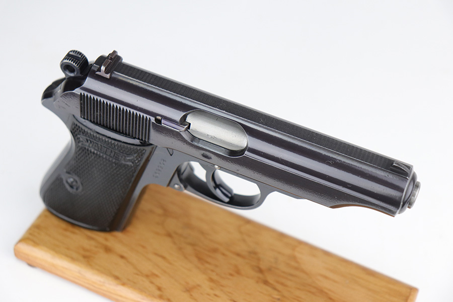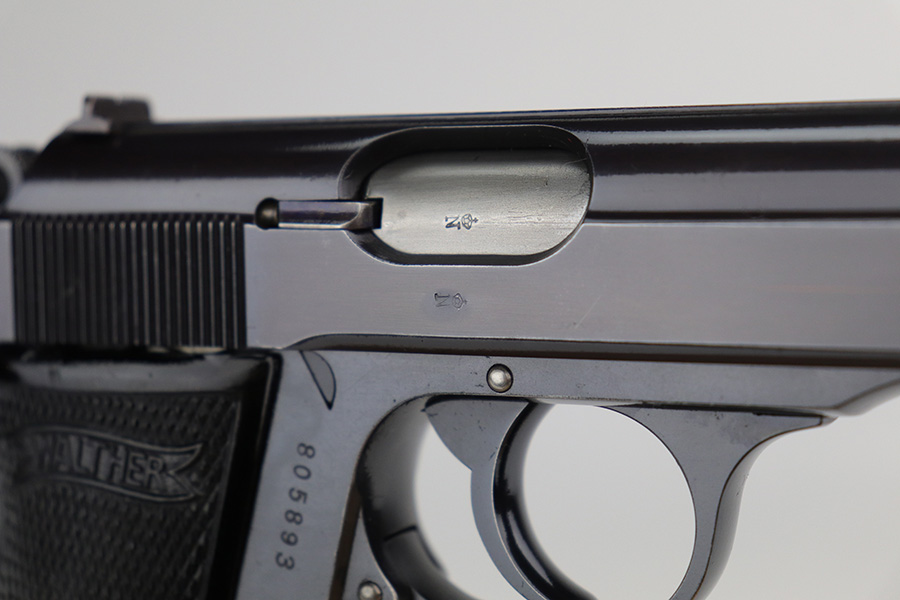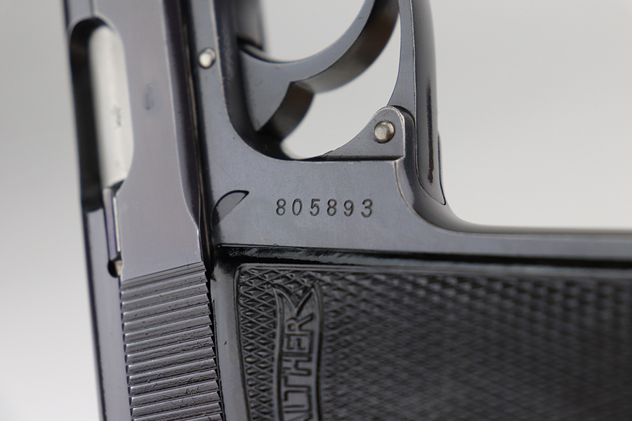 9/17/21 – This is an incredibly rare and nearly impossible-to-find Walther PP in 6.35mm from the Nazi era. There were only ~150 produced, and fewer than 20 recorded examples! It’s all original and in terrific condition, with about 96-97% of the high-polish blue remaining. Minor high edge wear on slide, and a small patch of finish loss on the bottom of the back strap. Beautiful bore, hardly looks used. Excellent grips with no cracks or chips.