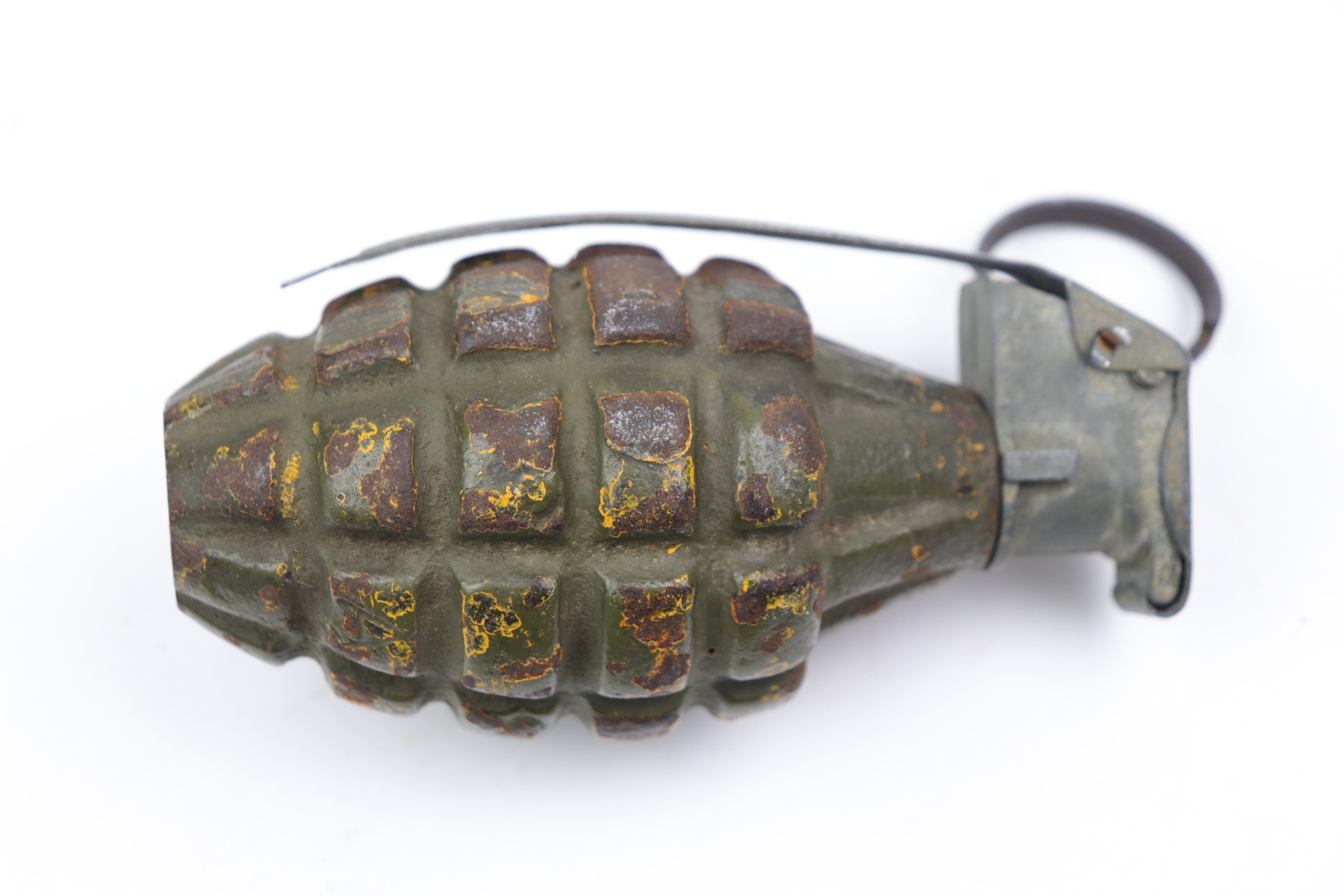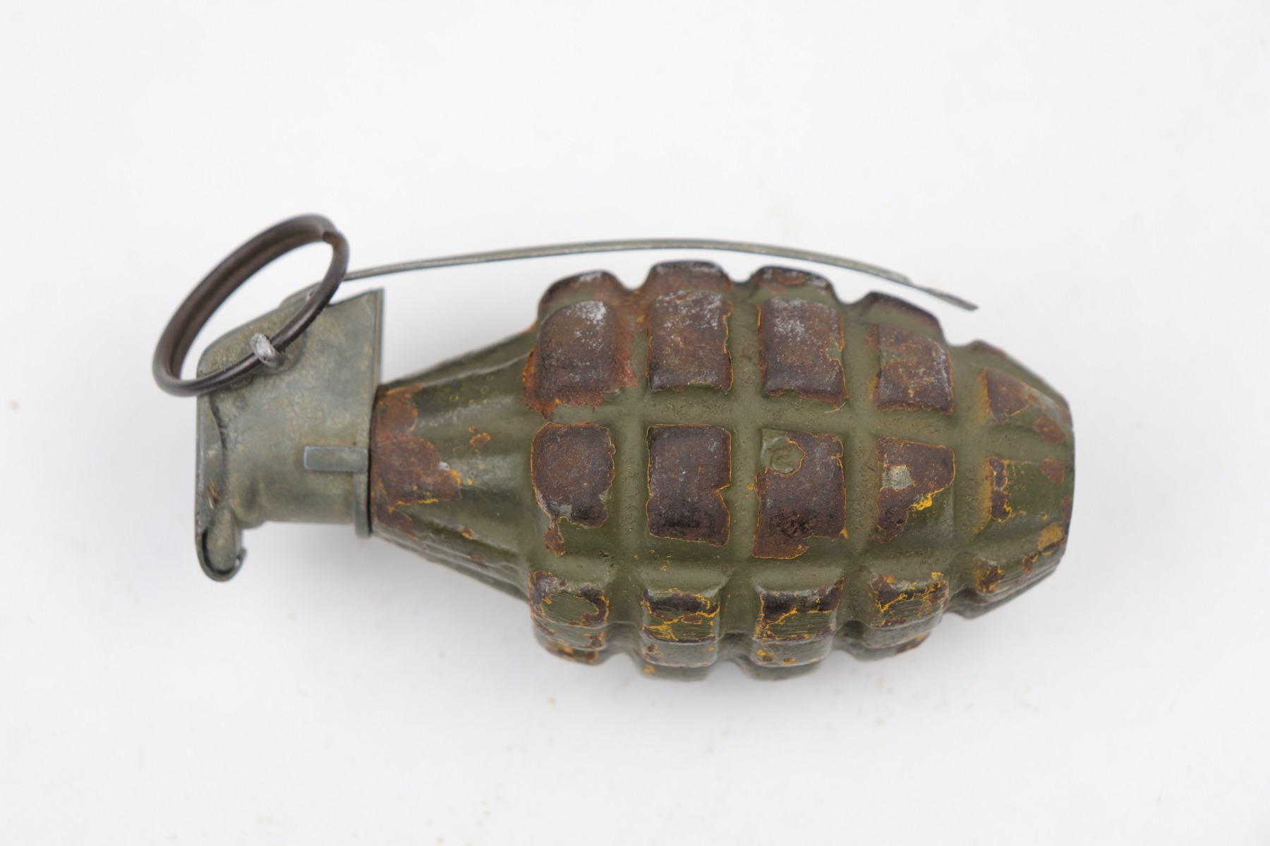 1/7/21 – This is an original US WW2 era grenade. The grenade is inert, and the top can unscrew from the body. Good condition with some patina throughout, as shown. A cool piece of US history.