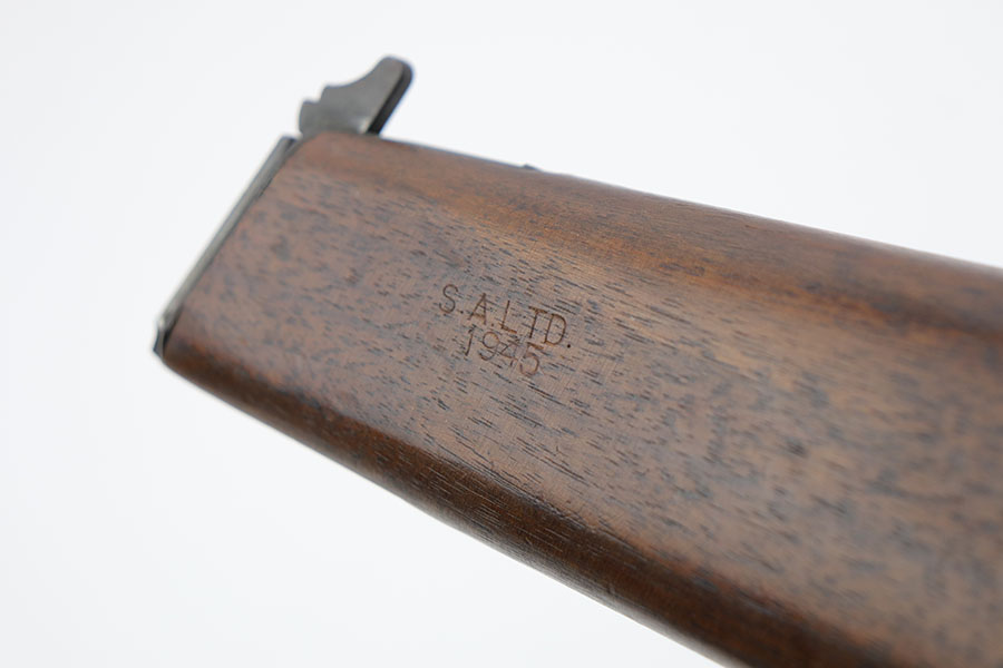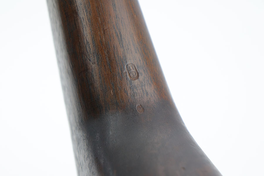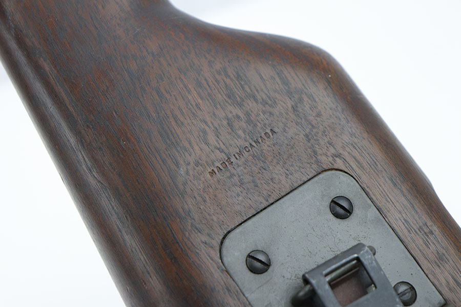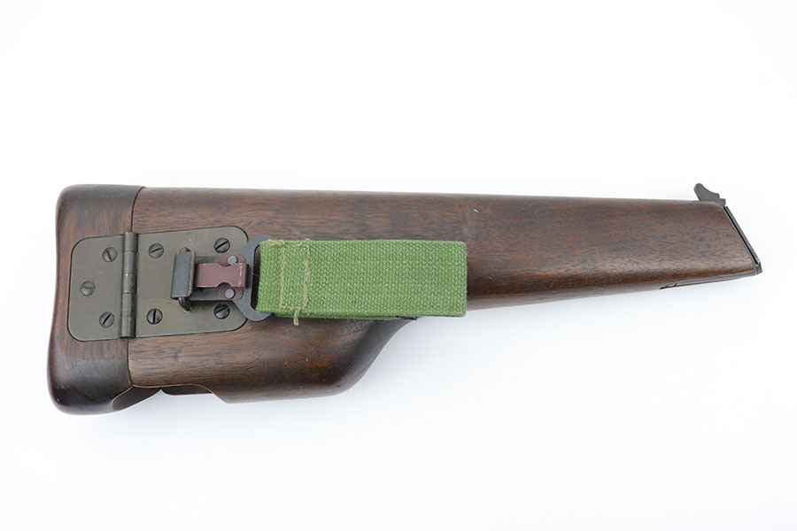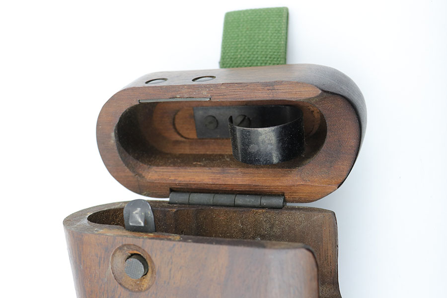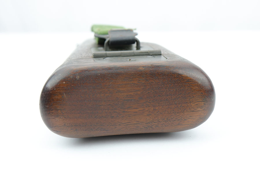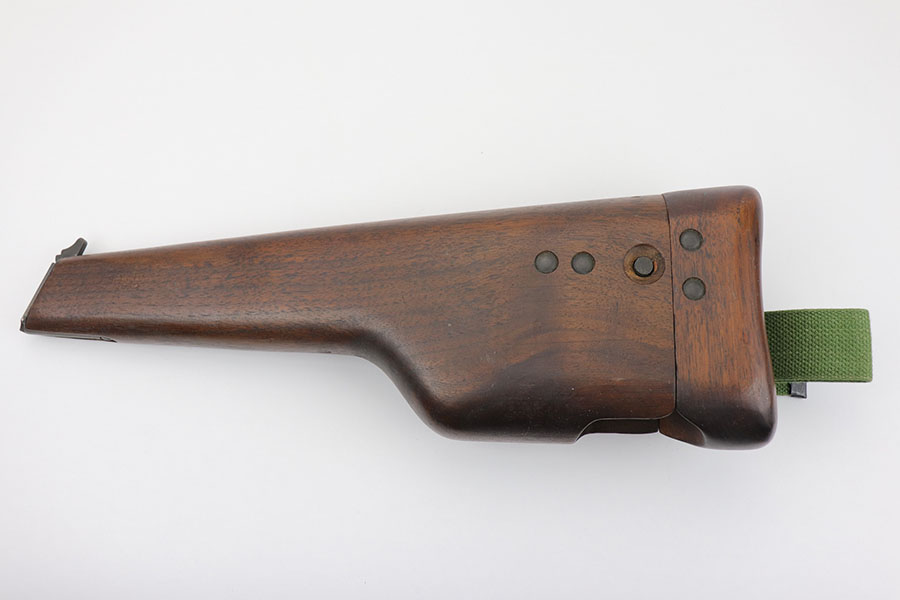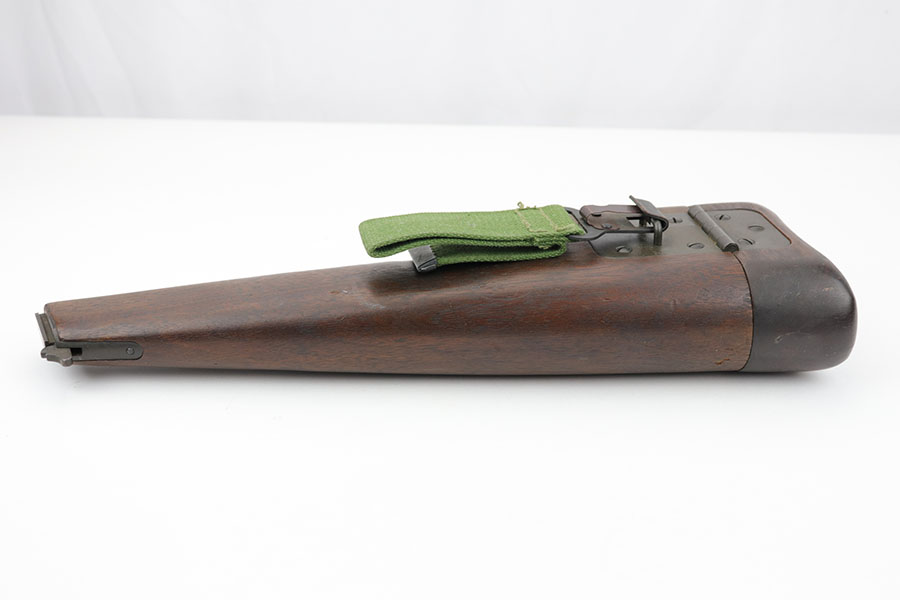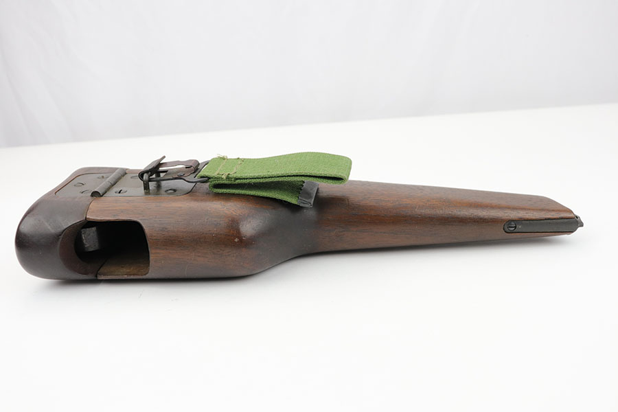 1/28/20 – This is a wood stock / holster for the Inglis made Hi Power. The stock is in excellent overall condition with no cracks or chips. Towards the toe-end is a maker stamp and date – 1945. This was made right at the end of WW2, and quite possibly was never issued. Comes with a detachable canvas belt loop.