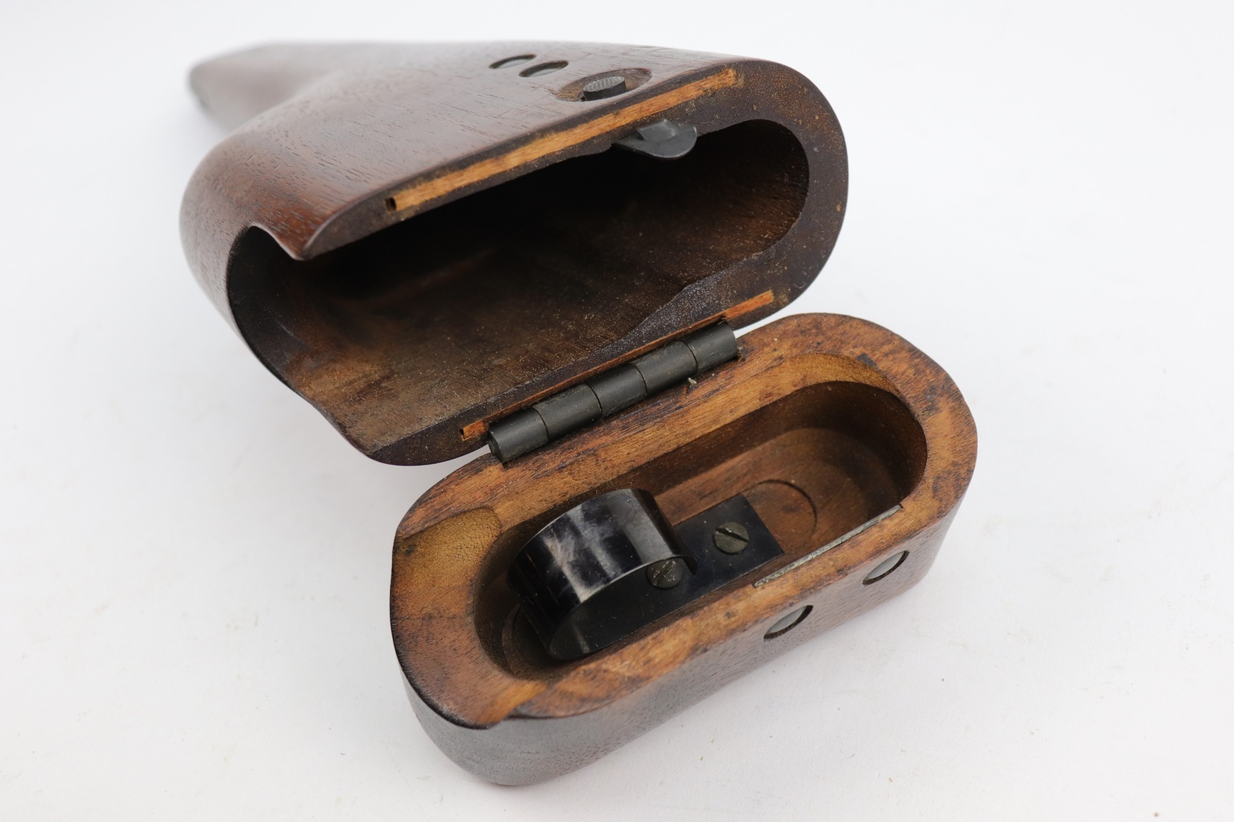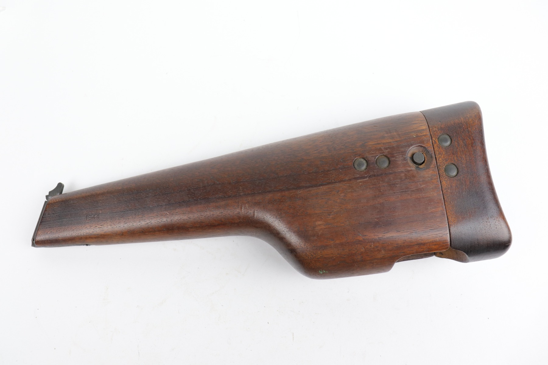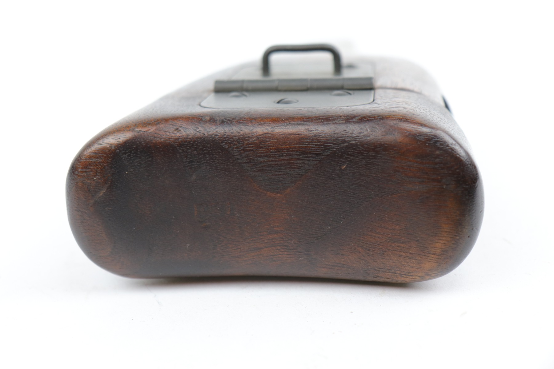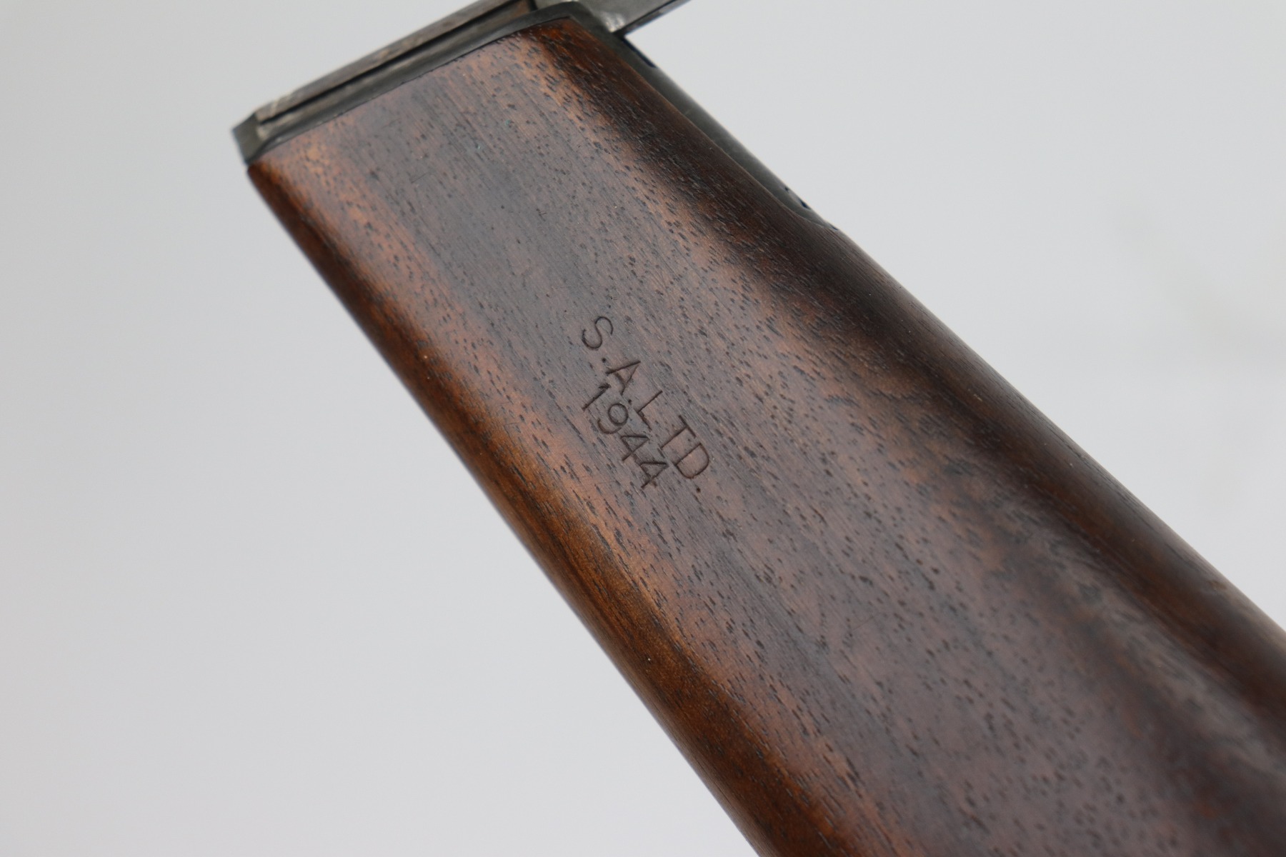 11/21/20 – This is an excellent shoulder stock for an Inglis Hi-Power 9mm pistol. The wood is in absolutely beautiful shape. The stock probably sat forgotten in a store room for decades until it found its way to us. It has not been sanded or numbered. Marked SA LTD, 1944.