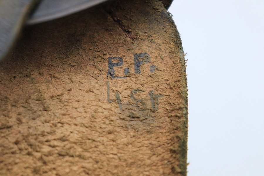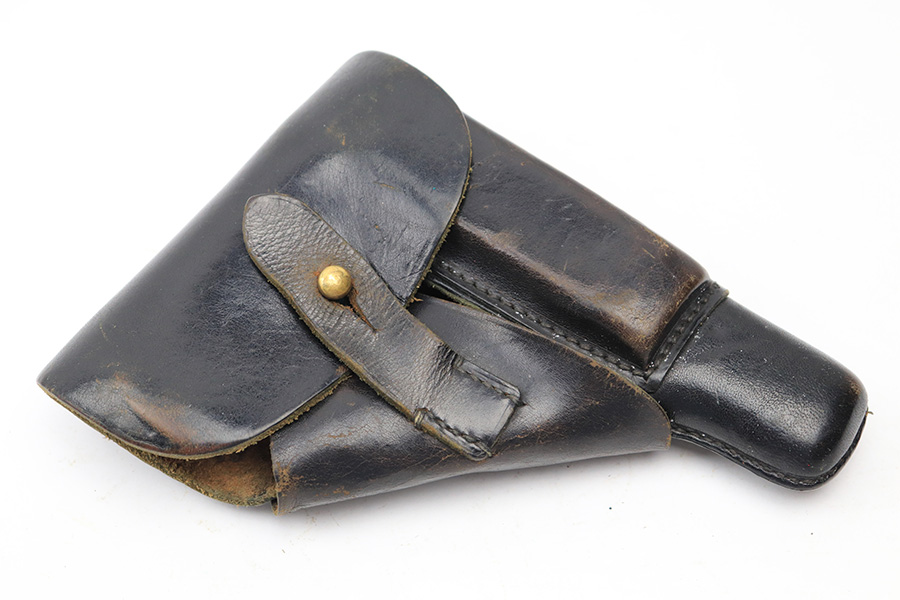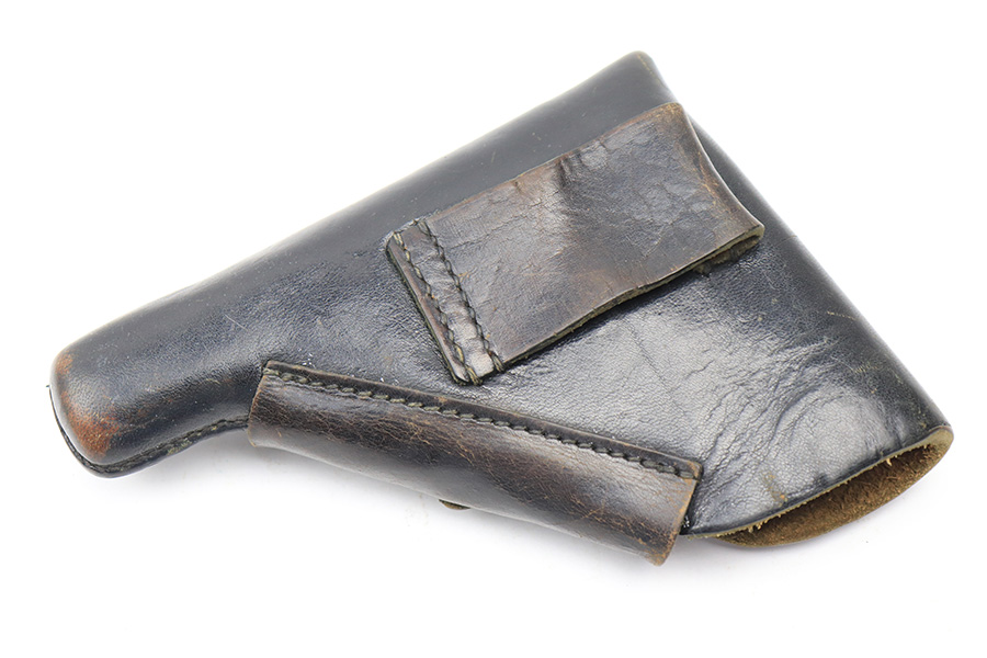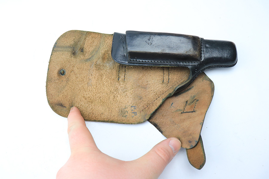 5/13/22 – This is a slightly unusual Walther PP holster. The holster features an upside down “P.P.” ink stamp on the interior leather. There are no other markings or stamps, other than what appears to be “4st” written underneath the ink stamp. The holster otherwise looks like a typical AKAH holster with nice black leather and black stitching and a brass closure knob.