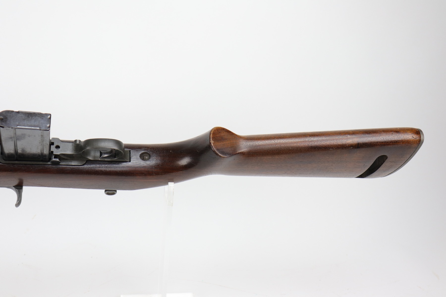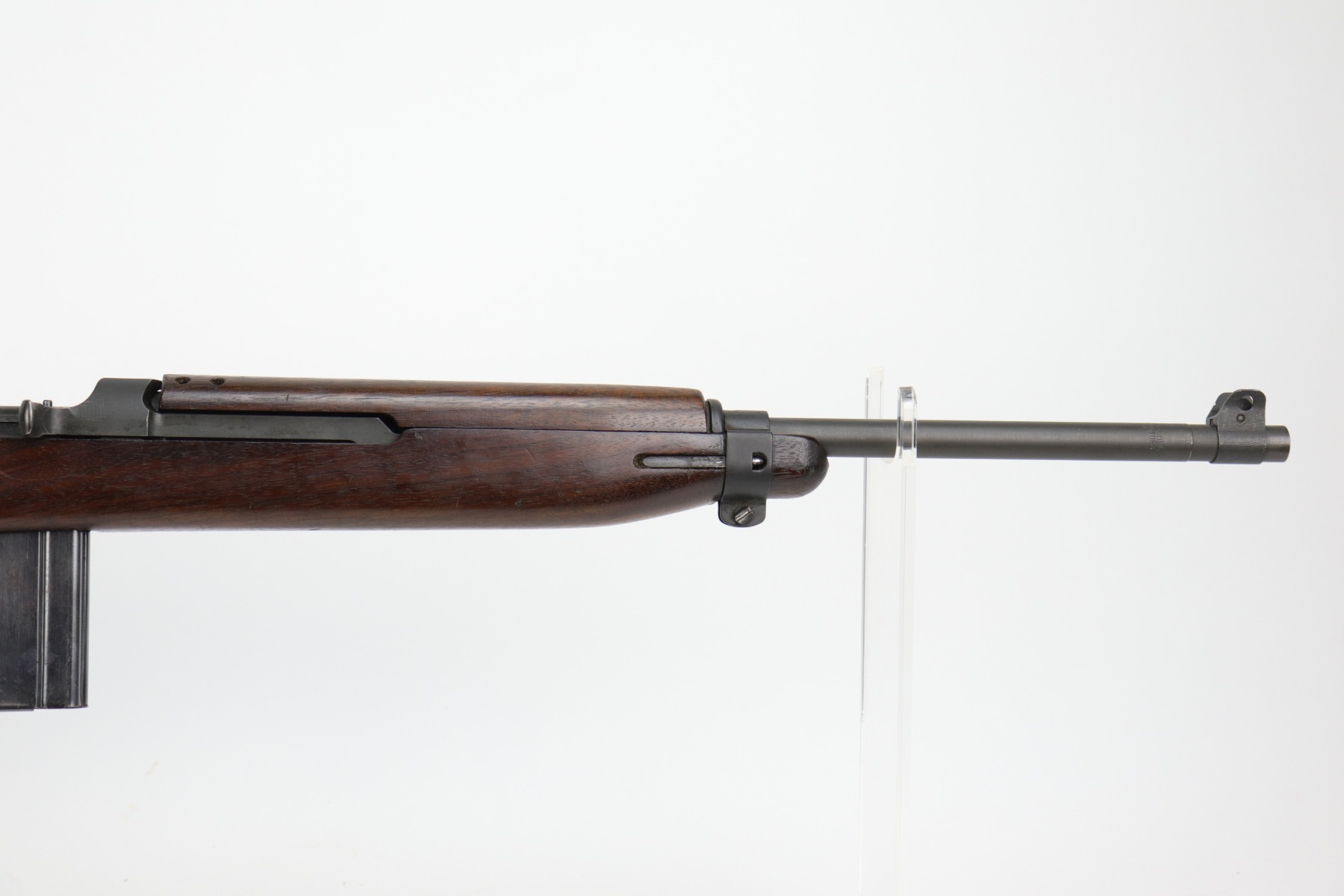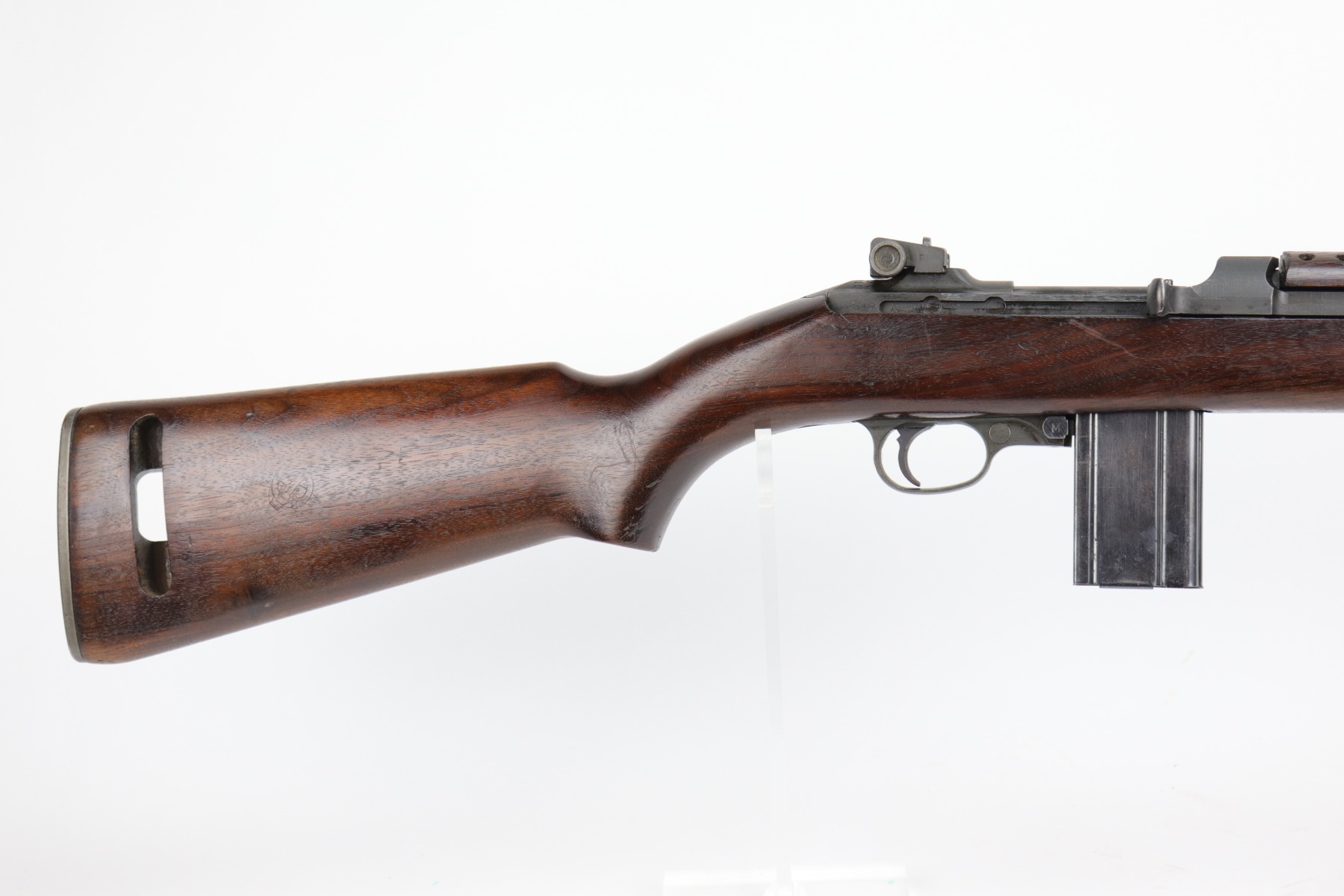 9/15/20 – This is an Inland M1 Carbine, manufactured in 1944. The serial on the receiver dates to 1944, and the barrel is dated October of 1944. The gun has an adjustable rear sight and the internal parts have mixed manufacturers. The stock is marked “IH” and there is a cross-canon military cartouche on the right side. Overall, the gun is in excellent condition – just a few light handling marks here and there. There are light scratches and dings on the stock throughout. There are circular dents near the front barrel band. The gun is fully functional and the action is smooth. Comes with a period-correct magazine. The bore is minty.