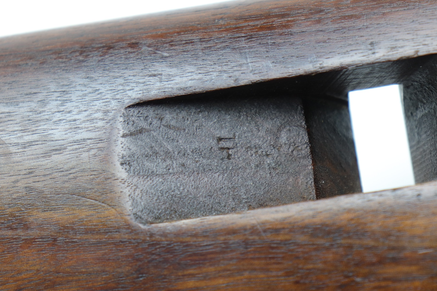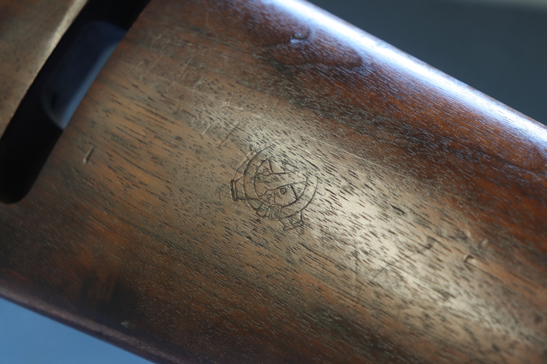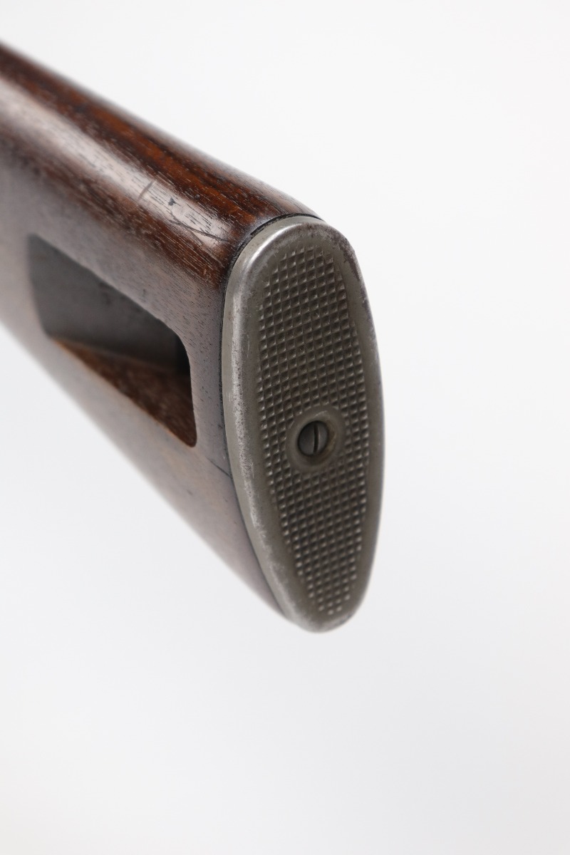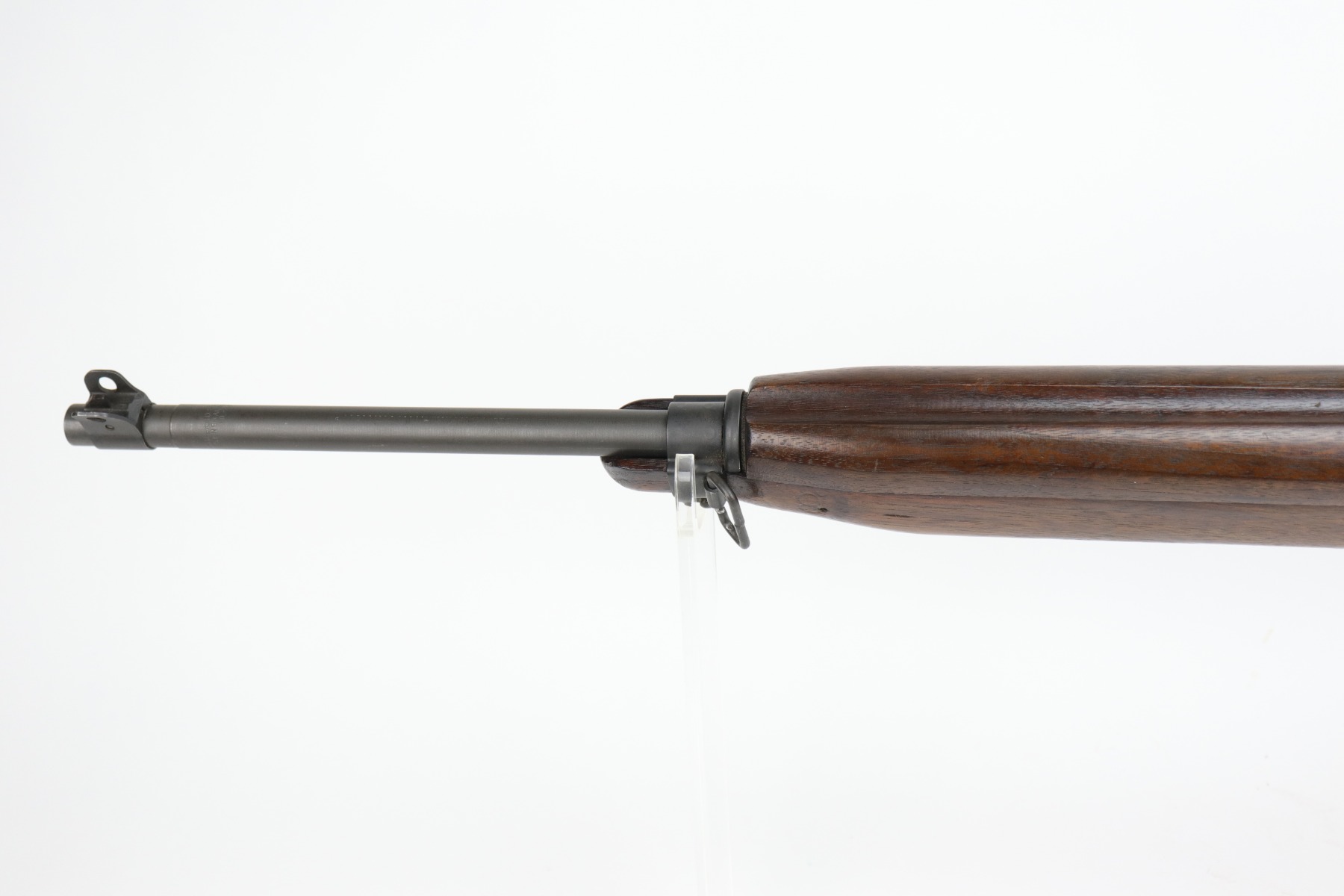 9/15/20 – This is an Inland M1 Carbine, manufactured in 1944. The serial on the receiver dates to 1944, and the barrel is dated October of 1944. The gun has an adjustable rear sight and the internal parts have mixed manufacturers. The stock is marked “IH” and there is a cross-canon military cartouche on the right side. Overall, the gun is in excellent condition – just a few light handling marks here and there. There are light scratches and dings on the stock throughout. There are circular dents near the front barrel band. The gun is fully functional and the action is smooth. Comes with a period-correct magazine. The bore is minty.