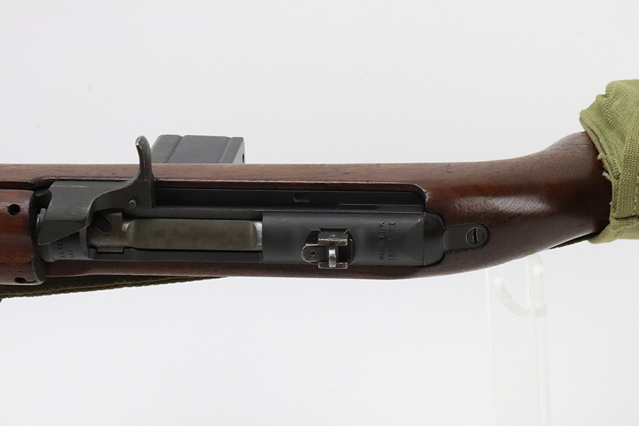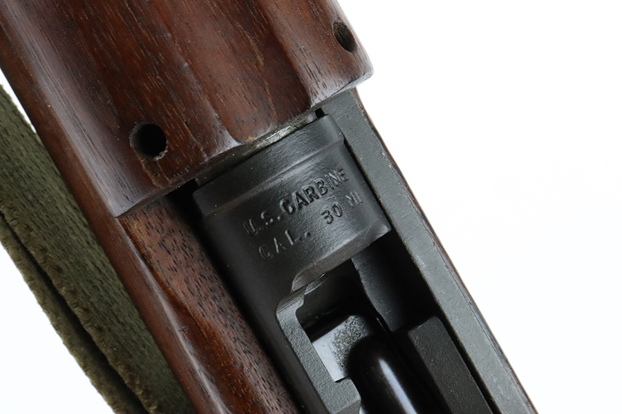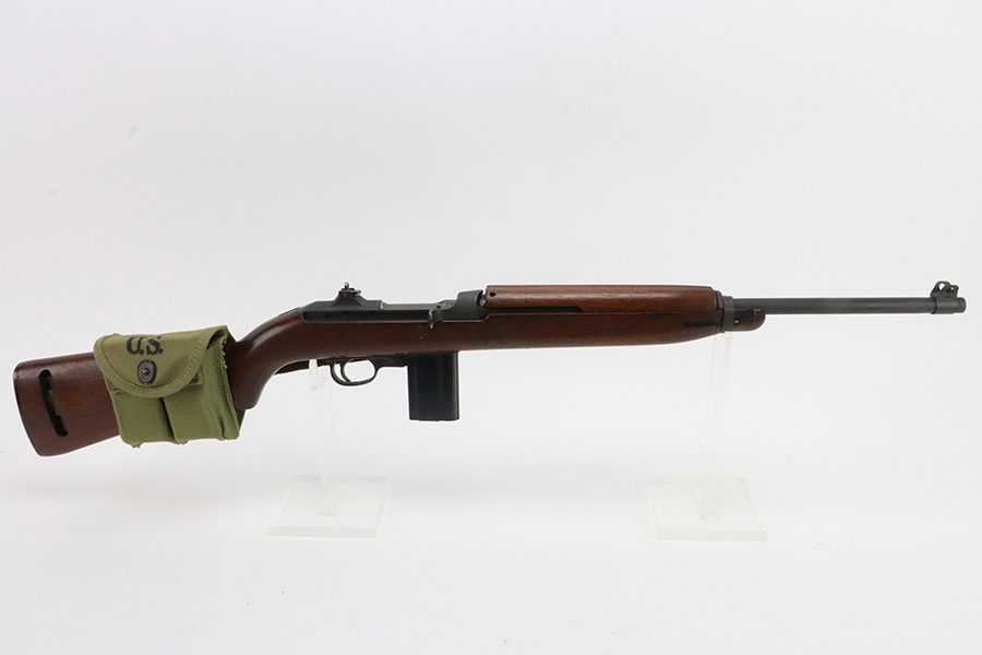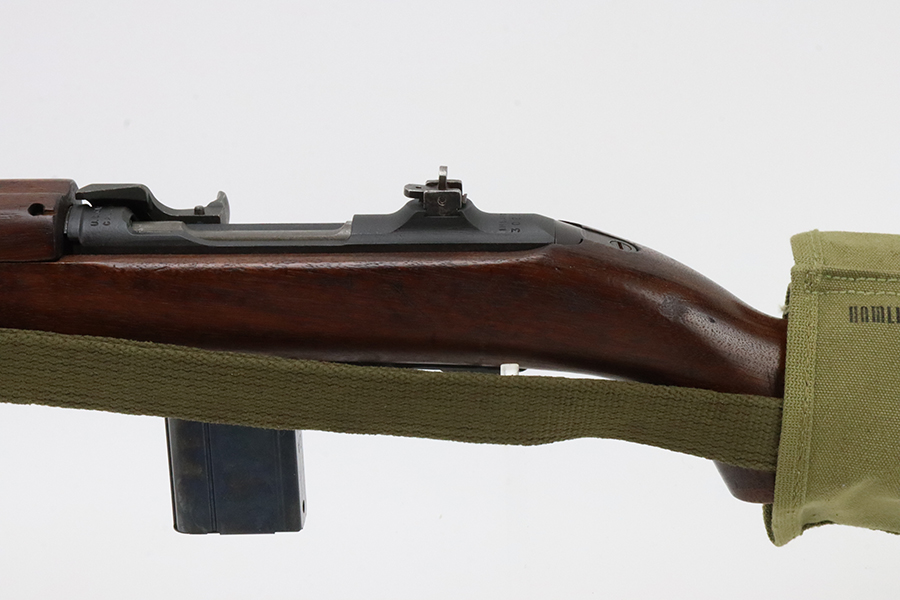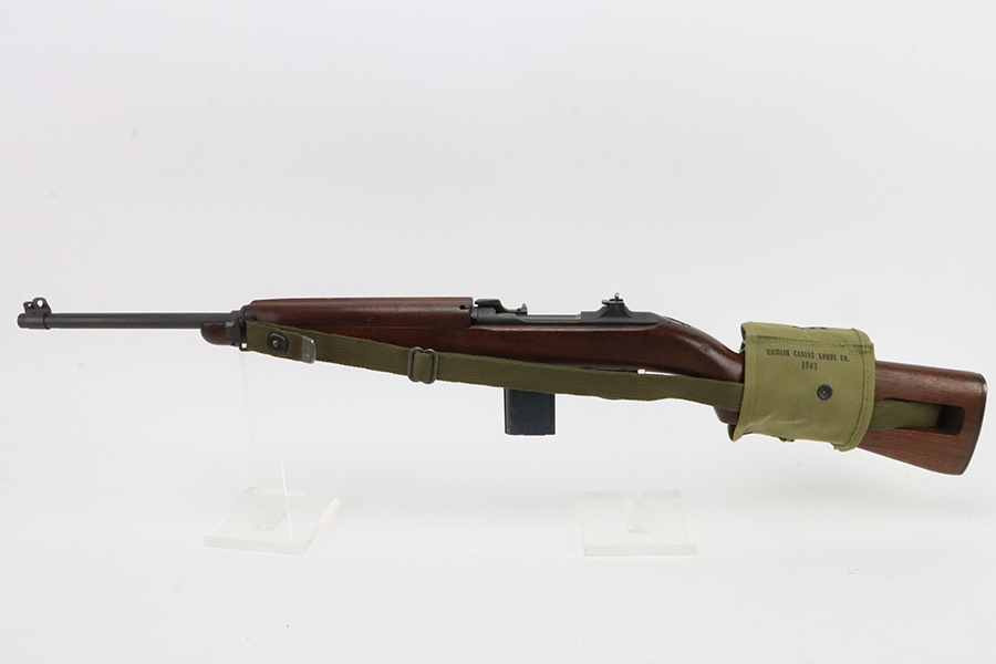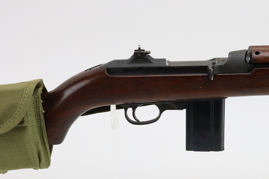 5/17/24 – This is an excellent example of an Inland M1 Carbine issued to the US military in 1943. A complete list of parts and markings is included in the photos. The parts are almost entirely correct, but we believe the rear sight was replaced. Cross canon cartouche on the right side of the butt stock. It has been refinished, so there is almost no finish loss on the metal parts. Excellent wood stock. Mint bore. Comes with three magazines, a sling, and a repro magazine pouch.
