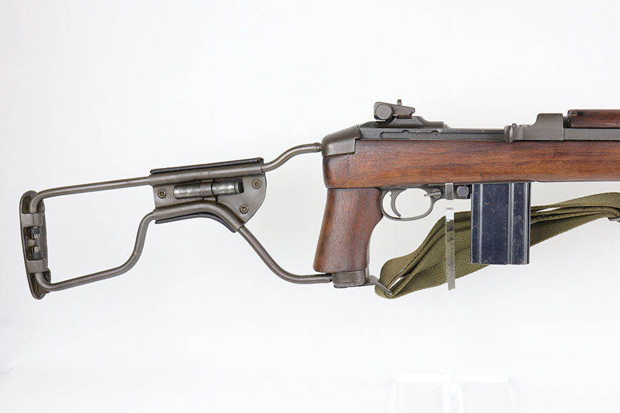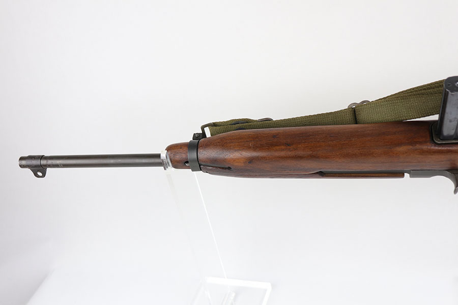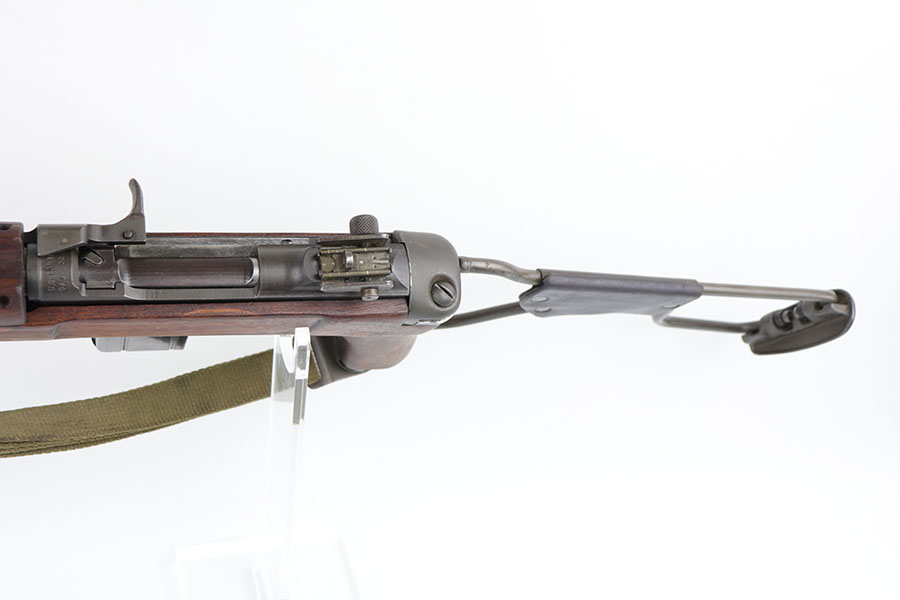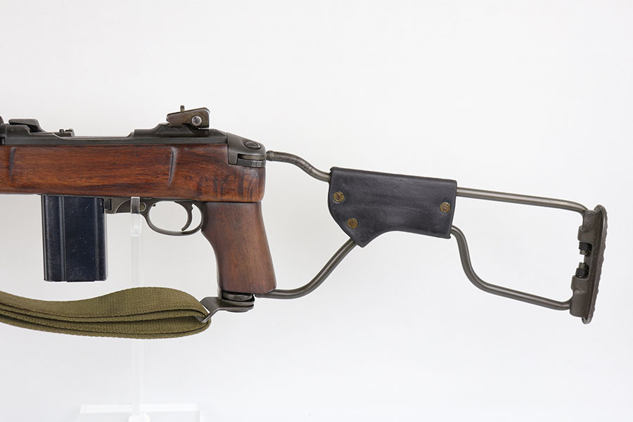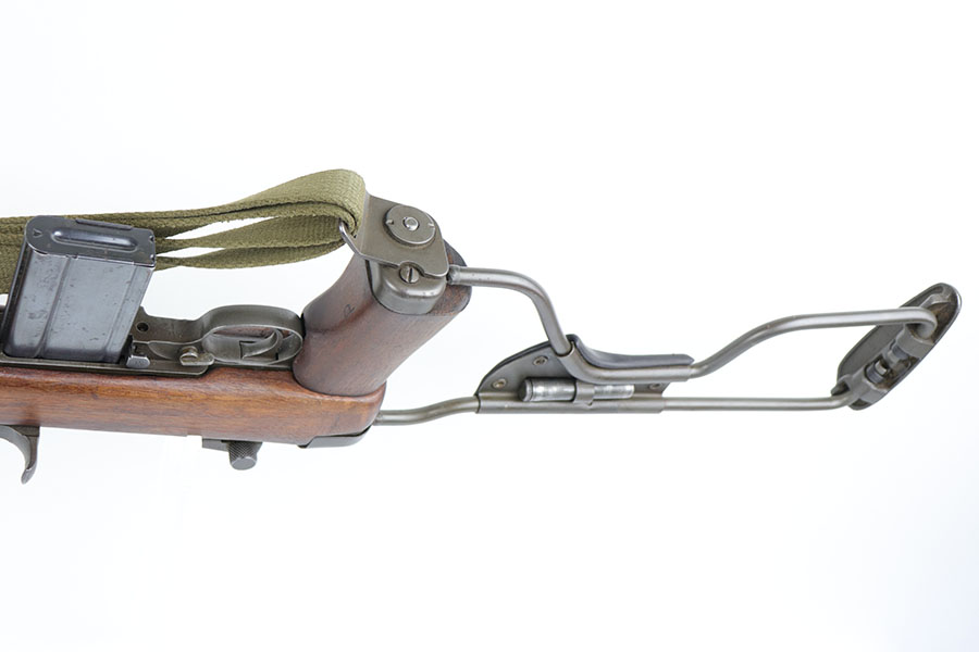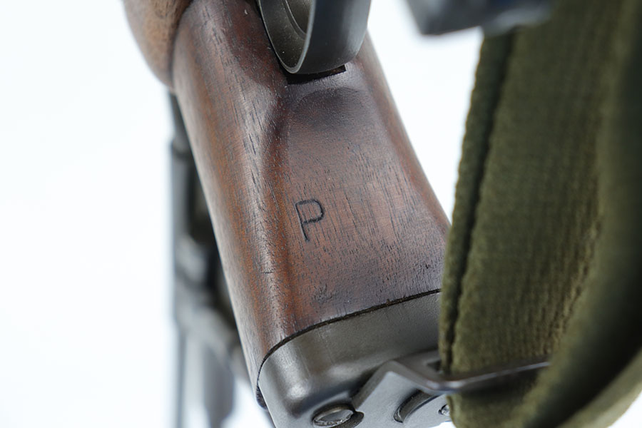 6/10/20 – This is a terrific example of a second run M1A1 paratrooper carbine as produced by Inland in late 1944. The rifle appears all correct for a second run example, with about 98% of the original blue remaining. There’s very little finish loss on the metal parts but there is some freckling on the barrel and muzzle. Barrel is dated to November of 1944. P proof on the front of the pistol grip is common for second run rifles. It’s also marked RI/3, which is also correct. Rear sight is the adjustable variant. Folding stock is original, including the buttplate and the cheekpad. Bore is mint and hardly looks used. The wood stock is in excellent condition aside from the very common indents where the folded stock presses against the left side.
