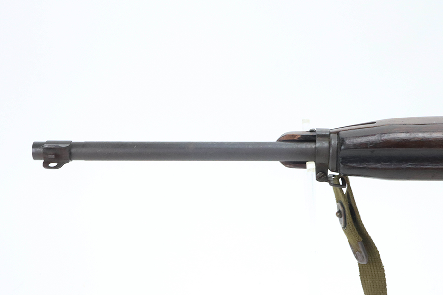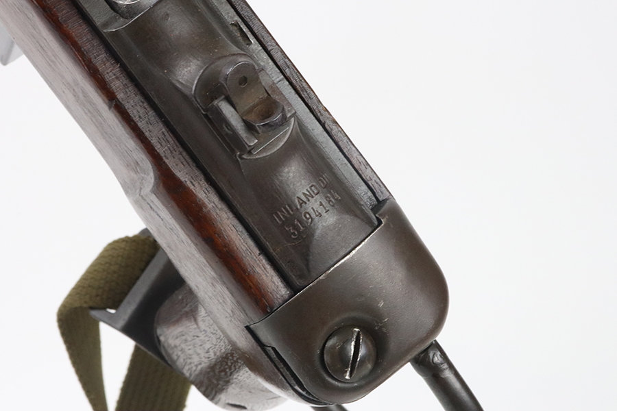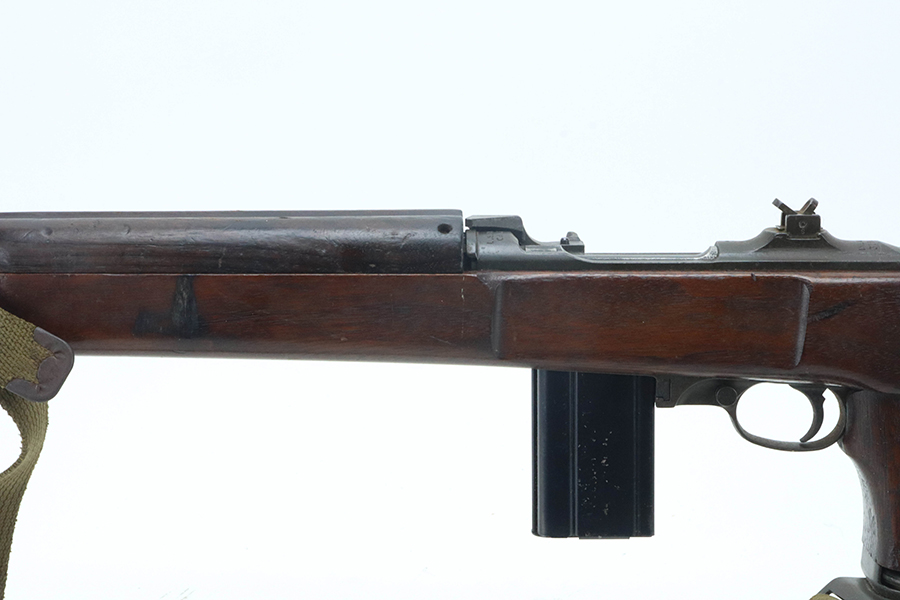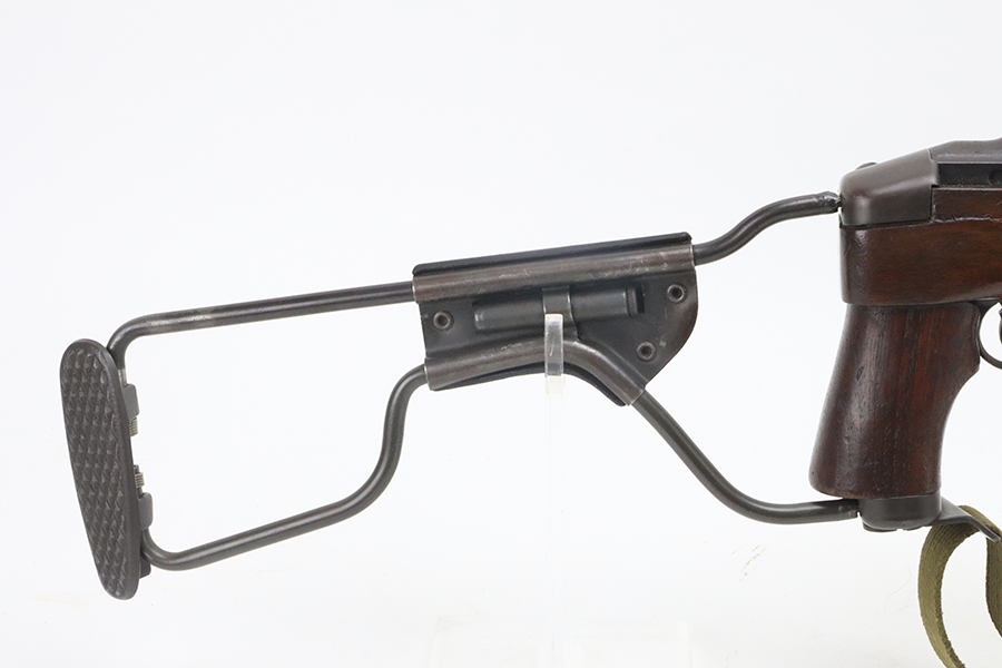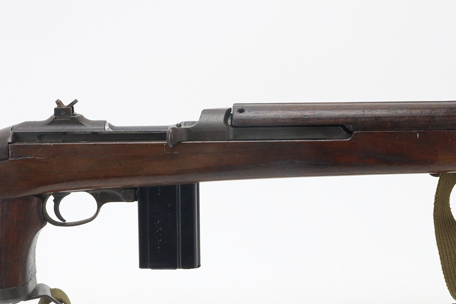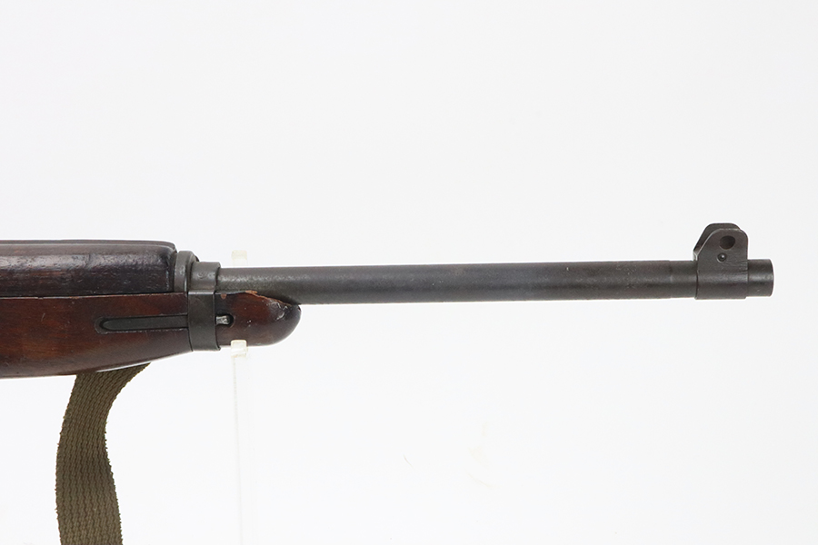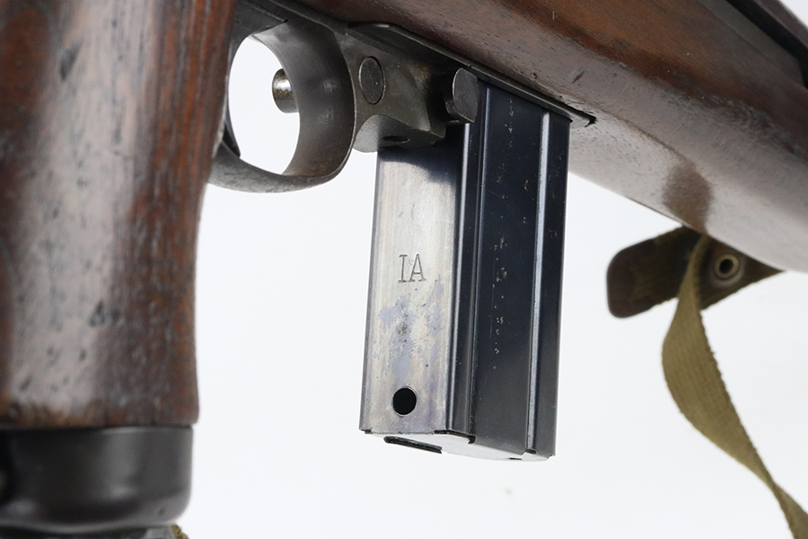 7/25/24 – This is a nice example of a Inland M1A1 Paratrooper Carbine from 1943-44. It is in a Type I configuration, but the serial number on the receiver puts it in the Type II range. All period-correct parts. A detailed parts list with markings is included in the photos. Comes with a proper canvas sling and one magazine. There is very little actual finish loss on the metal parts, but there is noticeable spotty surface oxidation along the barrel. Very nice wood furniture with a few bruises and tiny scratches. The bore is shiny with strong rifling, but there is some very light pin-pricking around the muzzle end. The spring on the butt plate is a little worn.