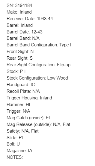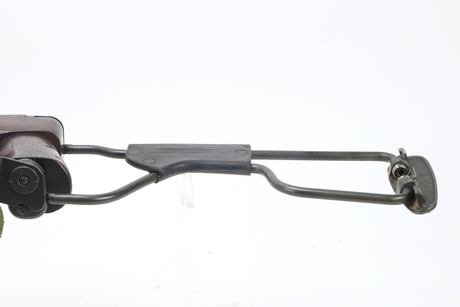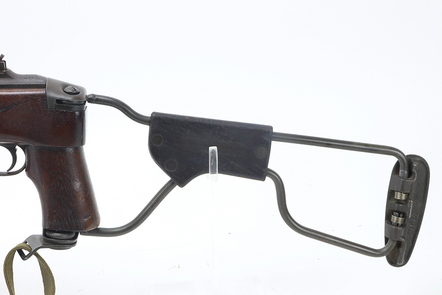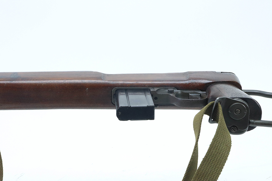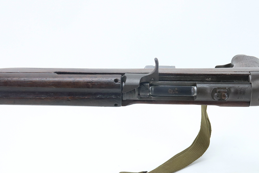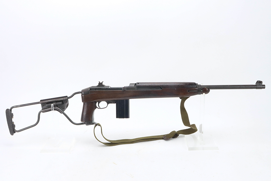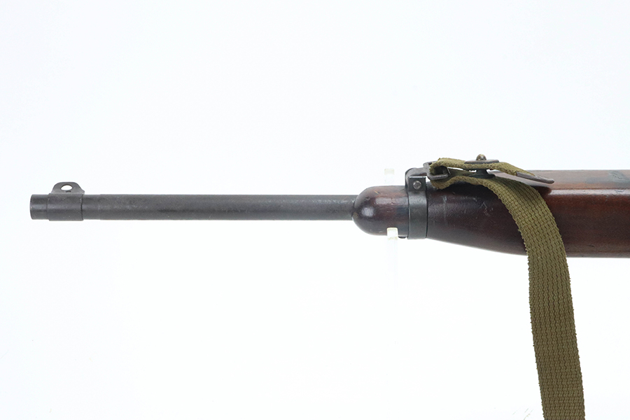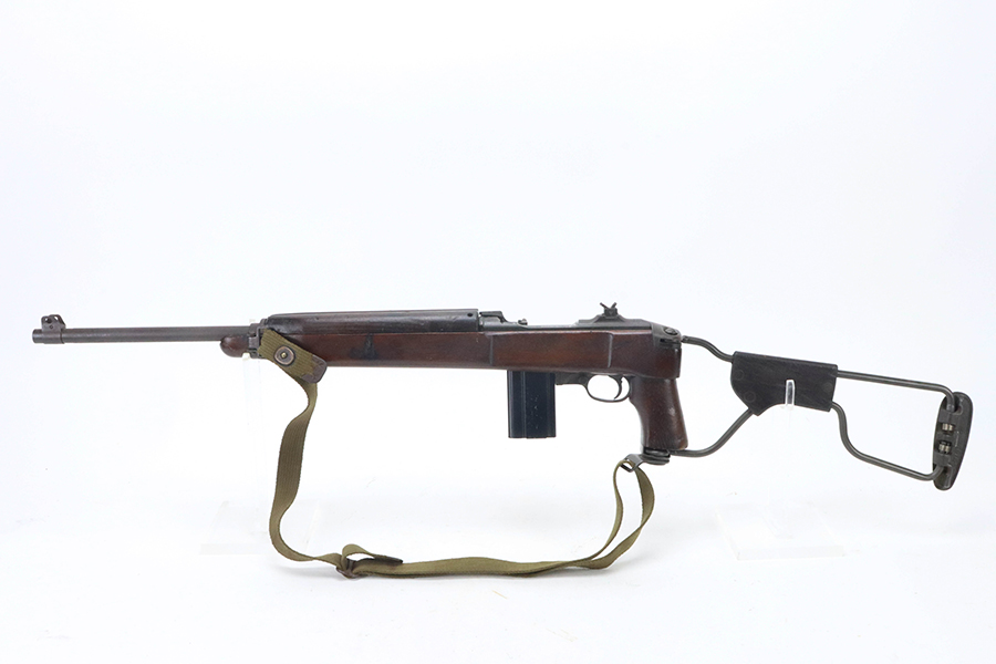 7/25/24 – This is a nice example of a Inland M1A1 Paratrooper Carbine from 1943-44. It is in a Type I configuration, but the serial number on the receiver puts it in the Type II range. All period-correct parts. A detailed parts list with markings is included in the photos. Comes with a proper canvas sling and one magazine. There is very little actual finish loss on the metal parts, but there is noticeable spotty surface oxidation along the barrel. Very nice wood furniture with a few bruises and tiny scratches. The bore is shiny with strong rifling, but there is some very light pin-pricking around the muzzle end. The spring on the butt plate is a little worn.