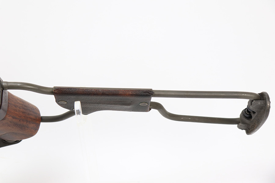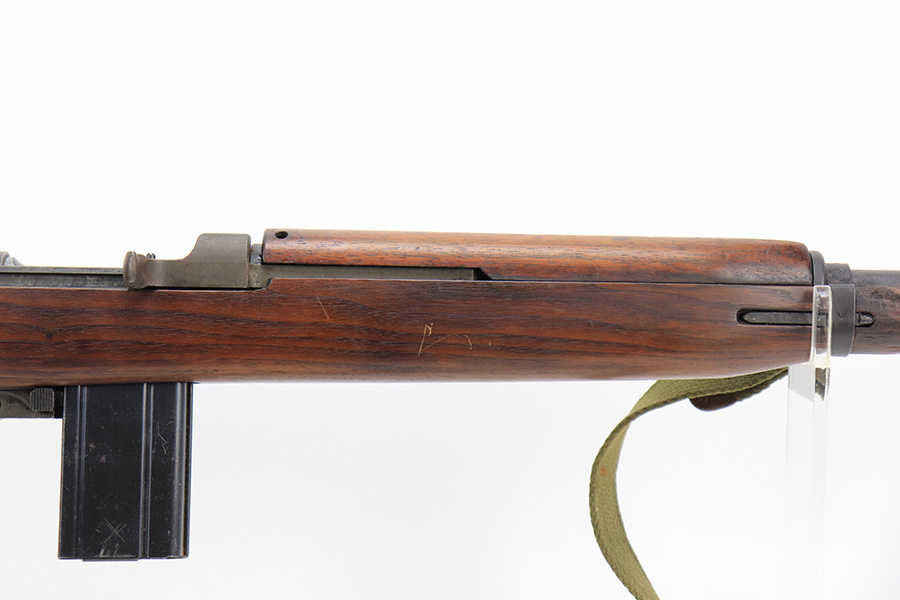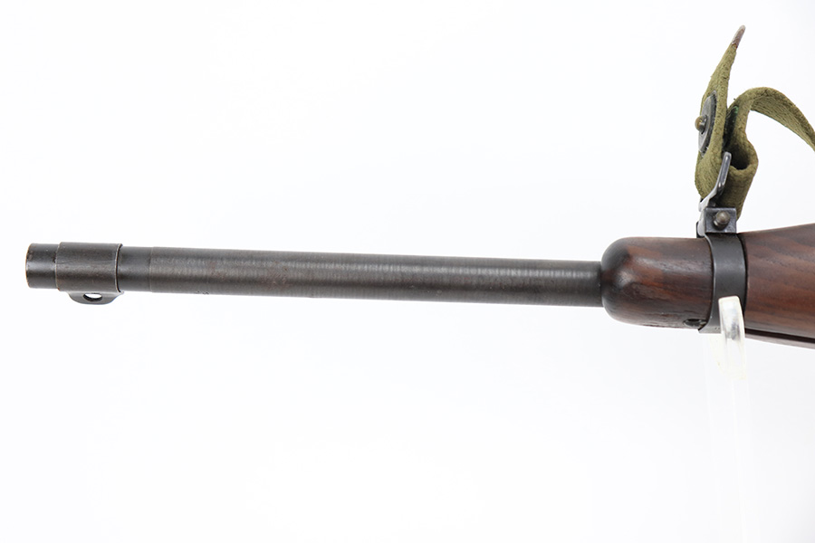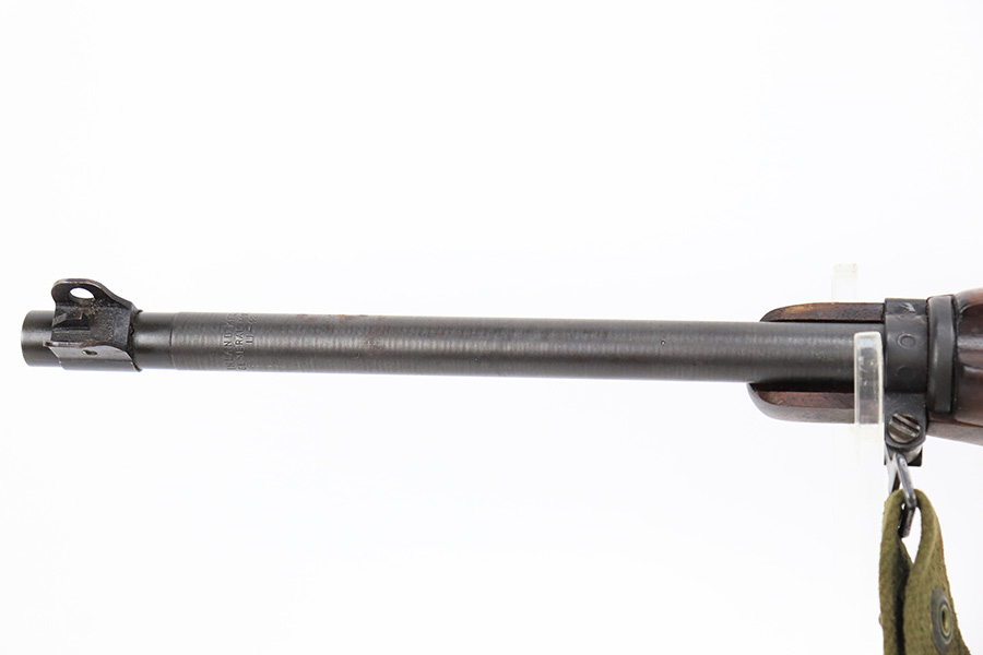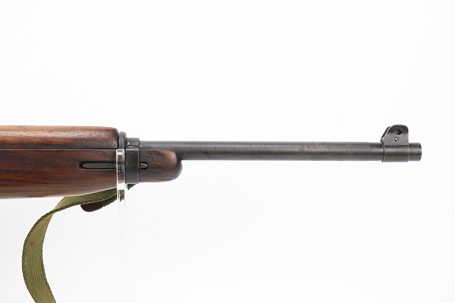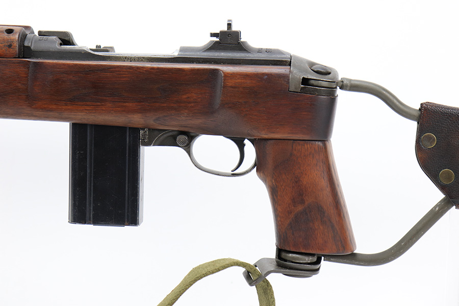 7/25/24 – This is a minty example of a Type I Inland M1A1 Paratrooper Carbine from 1942. A detailed parts list with markings is included in the photos. This one appears to be fitted with a period-correct metal wire stock, metal butt plate, and leather cheek pad. However, we believe the wood stock is a very high quality reproduction. Comes with a proper canvas sling and one magazine. The metal parts are minty, retaining nearly all of their finish. One small spot with a few pits on the left side of the receiver. The wood furniture is excellent. Near-mint bore.