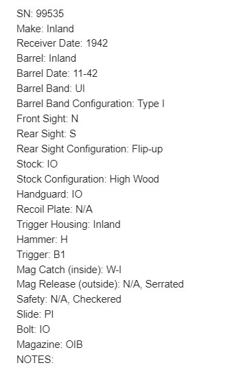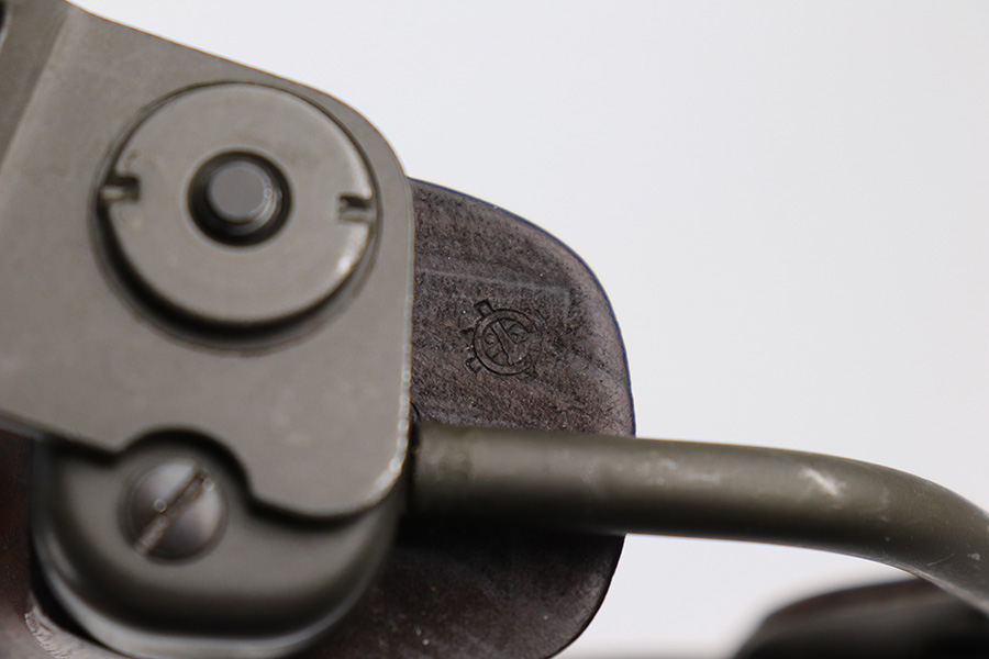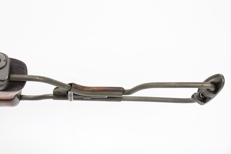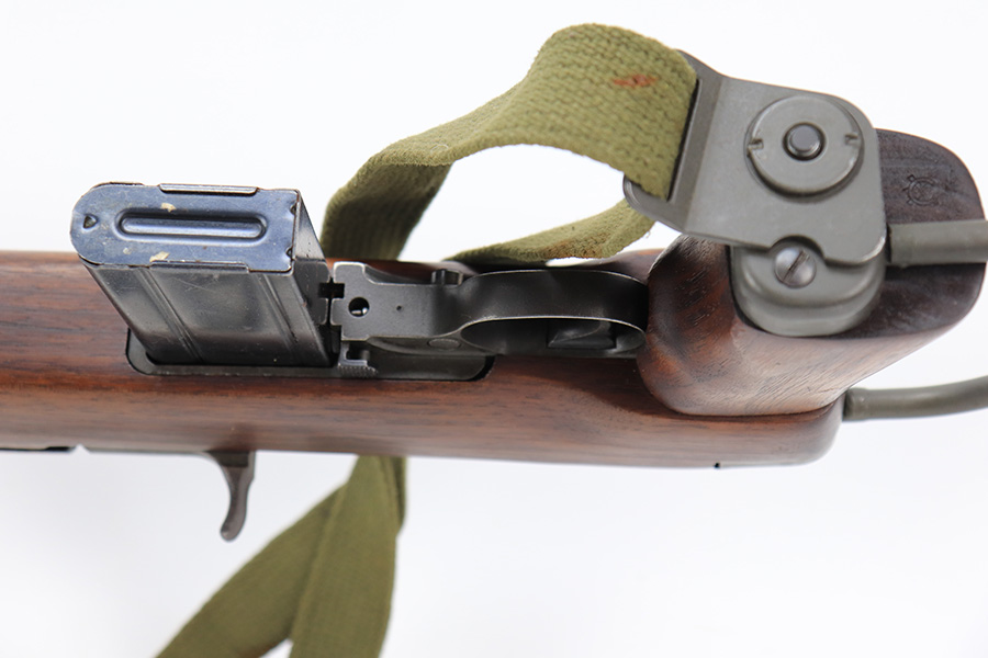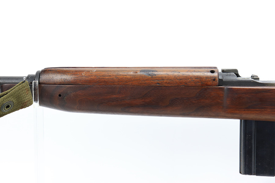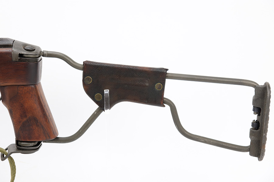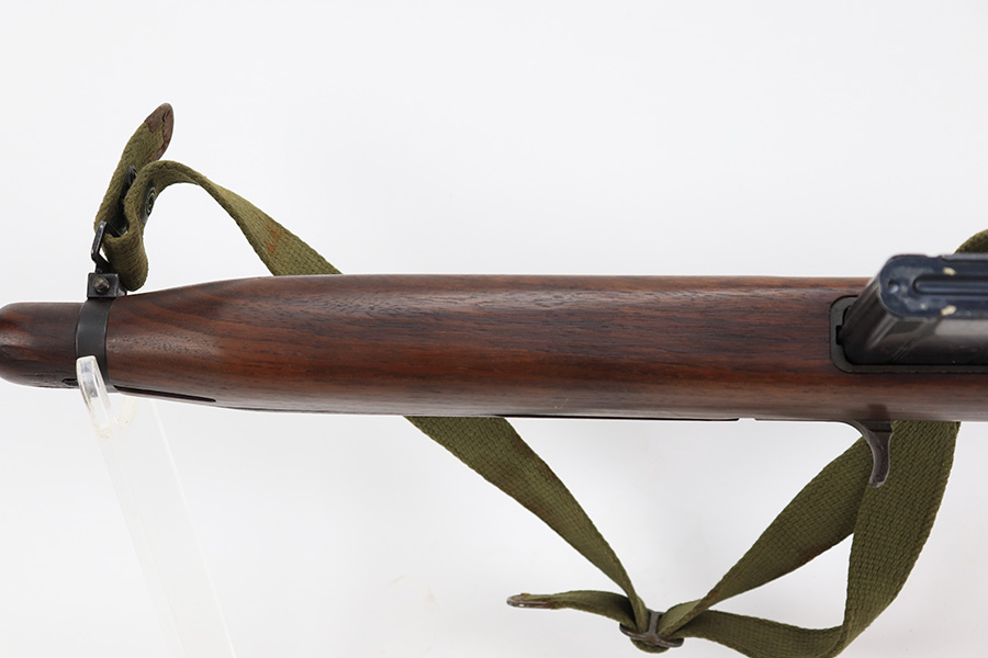 7/25/24 – This is a minty example of a Type I Inland M1A1 Paratrooper Carbine from 1942. A detailed parts list with markings is included in the photos. This one appears to be fitted with a period-correct metal wire stock, metal butt plate, and leather cheek pad. However, we believe the wood stock is a very high quality reproduction. Comes with a proper canvas sling and one magazine. The metal parts are minty, retaining nearly all of their finish. One small spot with a few pits on the left side of the receiver. The wood furniture is excellent. Near-mint bore.