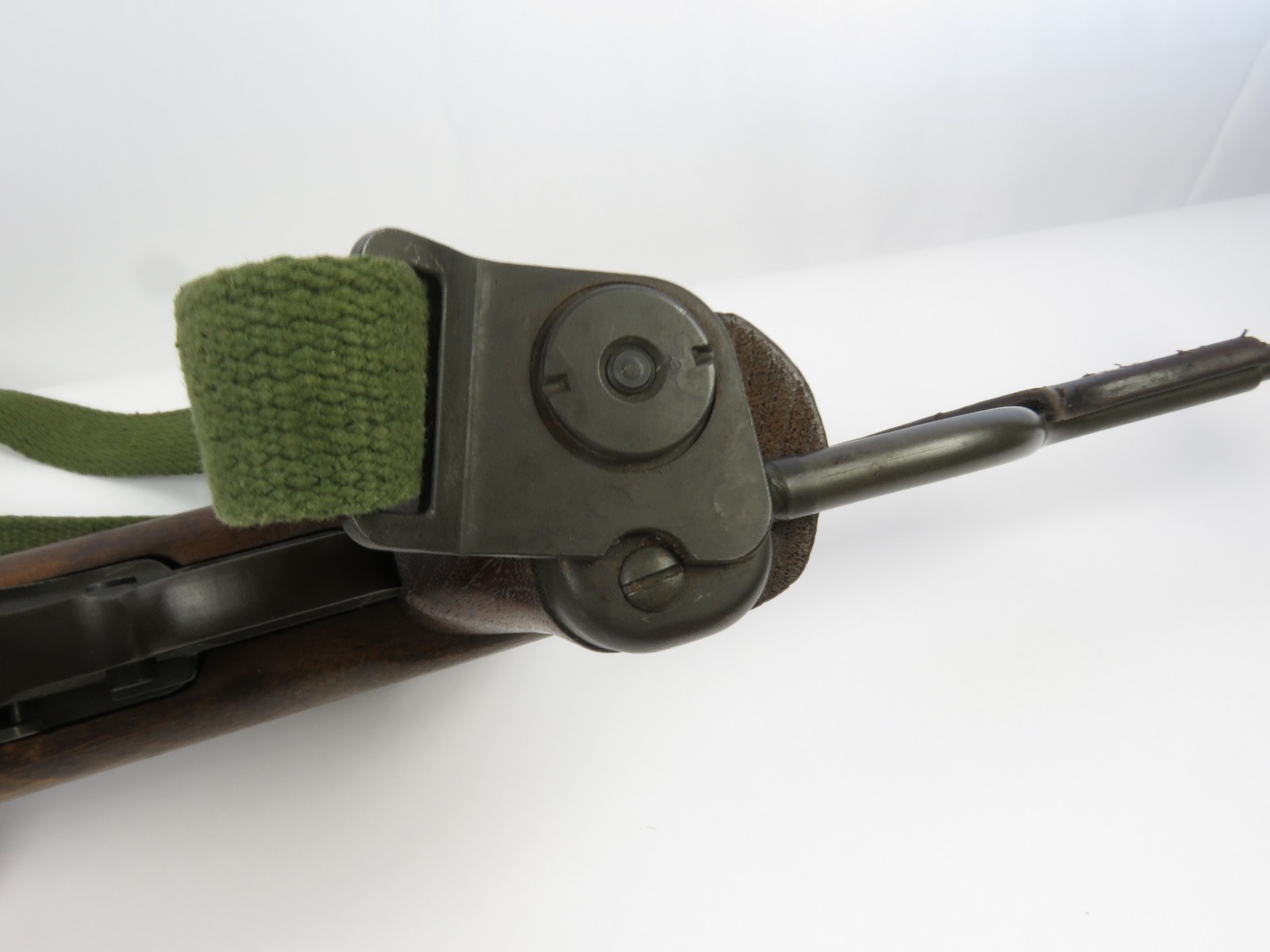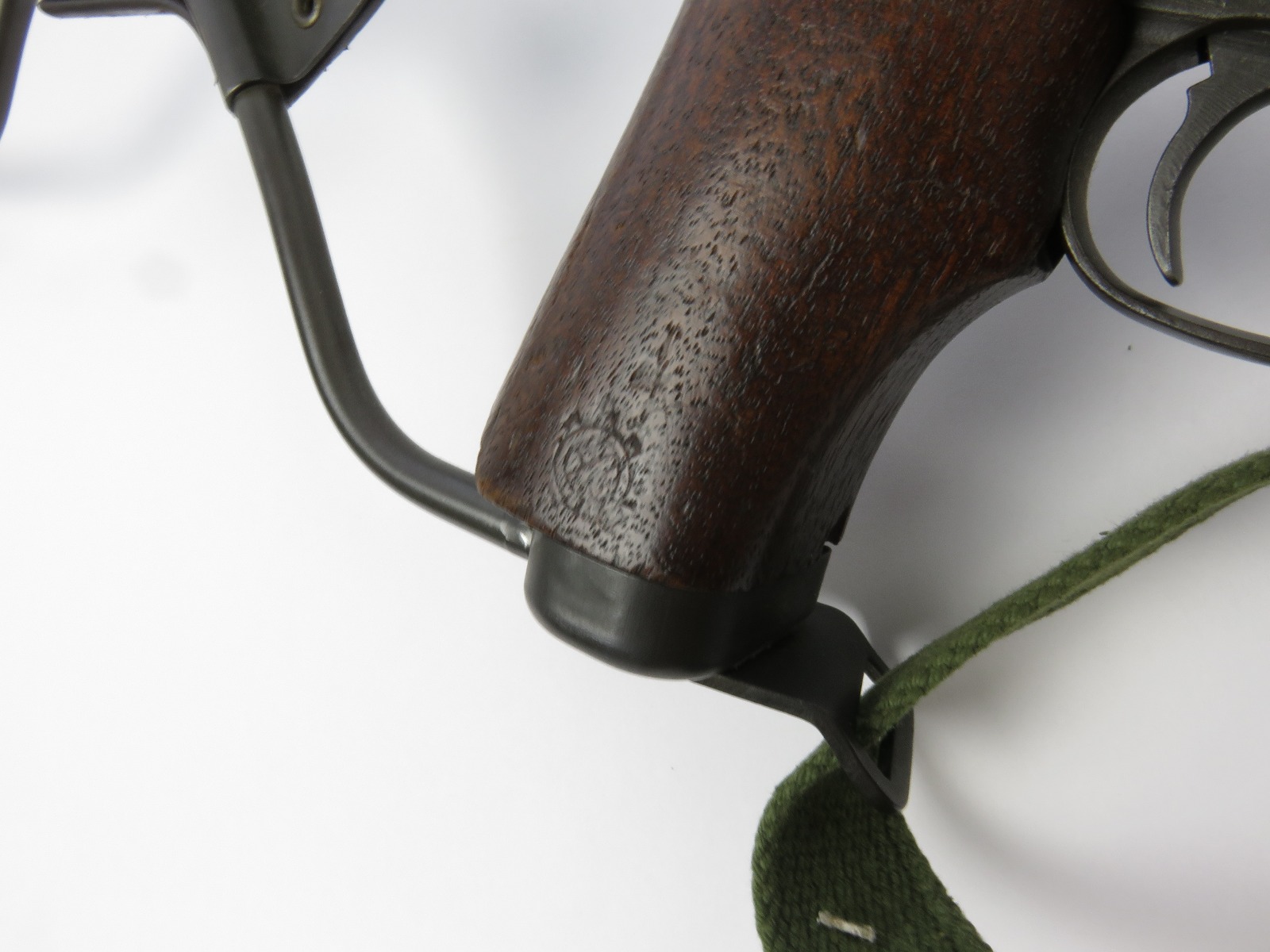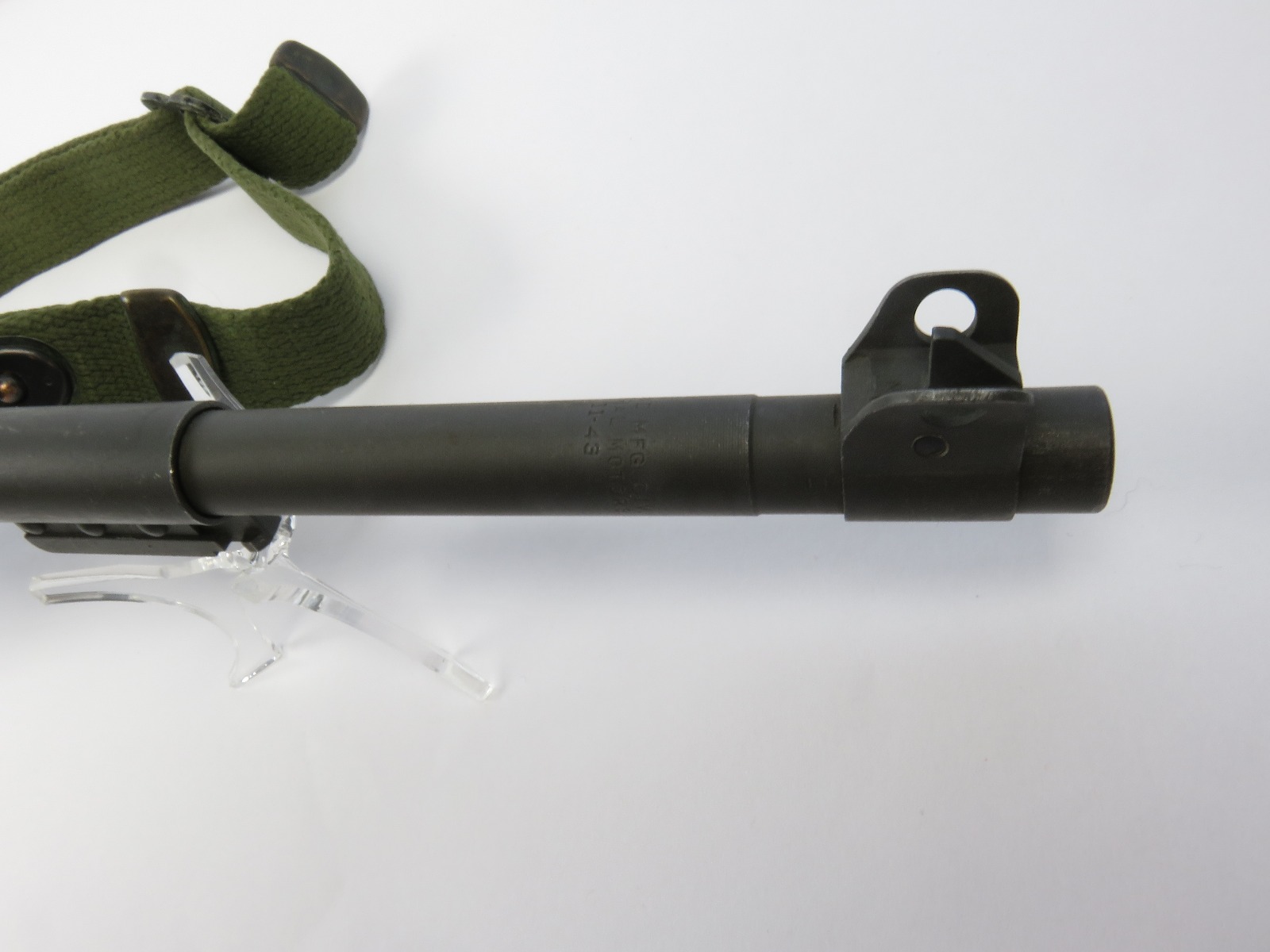 7/12/17 – This is a WW2 rebuilt M1A1 Carbine rifle, also known as a partrooper M1 Carbine. The parts are all original, however the serial number of this carbine indicates this was part of the “second run” of M1A1 carbines. These were produced beginning in April of 1944. This carbine however, has a 1943 dated barrel, which indicates that this was perhaps a late 1944, or 1945 arsenal rebuild. There is a bayonet lug and adjustable rear sight. The metal parts are all in excellent conditoin with a clean phosphate finish. The receiver and barrel are proper inland parts. The rear sight is also properly stamped “PI” from inland. The barrel band is stamped “AMCO”. The wood stock is original and in excellent condition with no major issues. Ther is the typical indent from the folding stock on the left side of the wood. The right side of the wood has a faint, yet unaltered cartouche stamp. The bore is excellent and shiny with very little to no wear. The shoulder strap is post war, as it doesn’t have the “C” shaped metal ends. The magazine is stamped “O SG”.