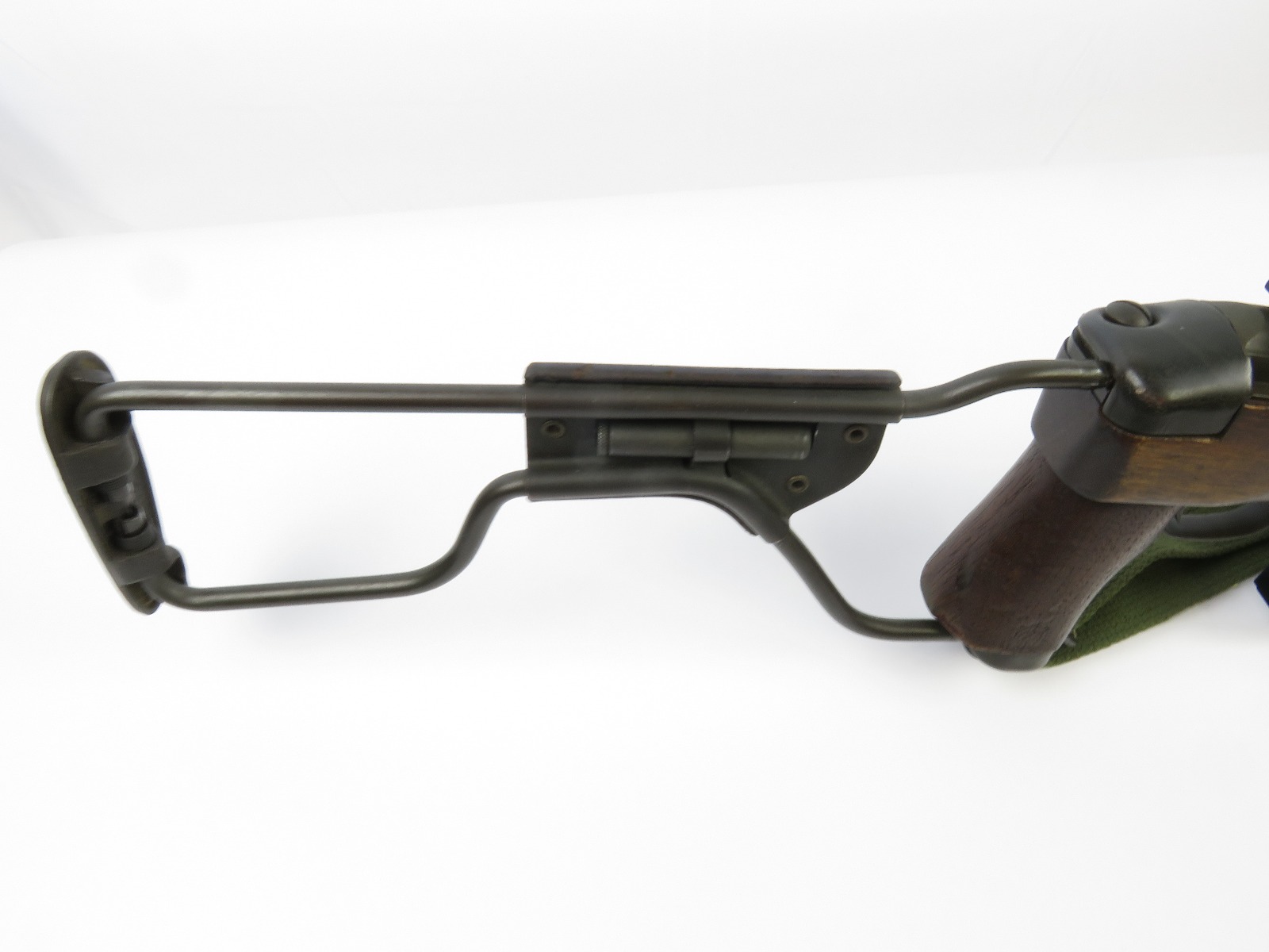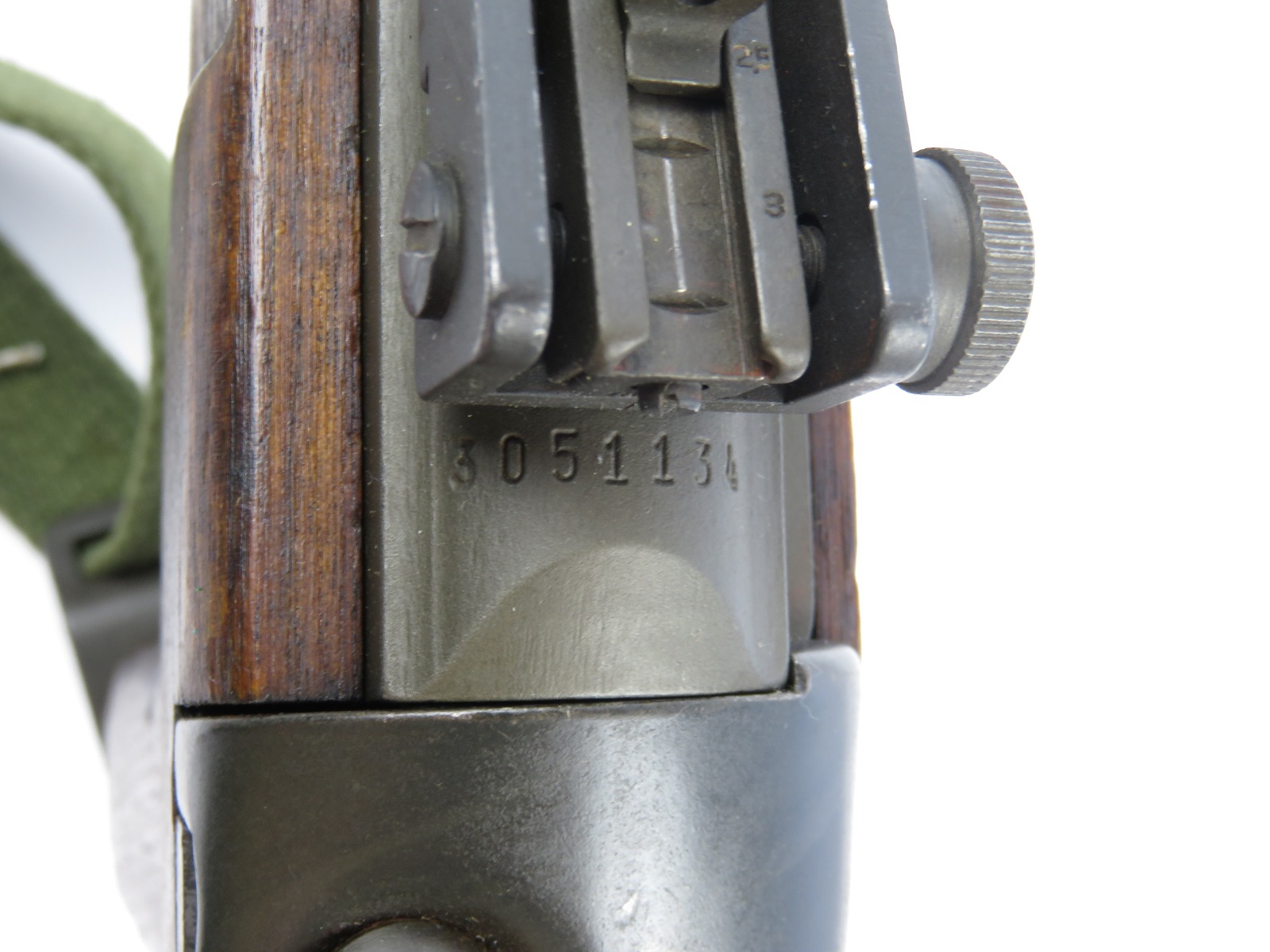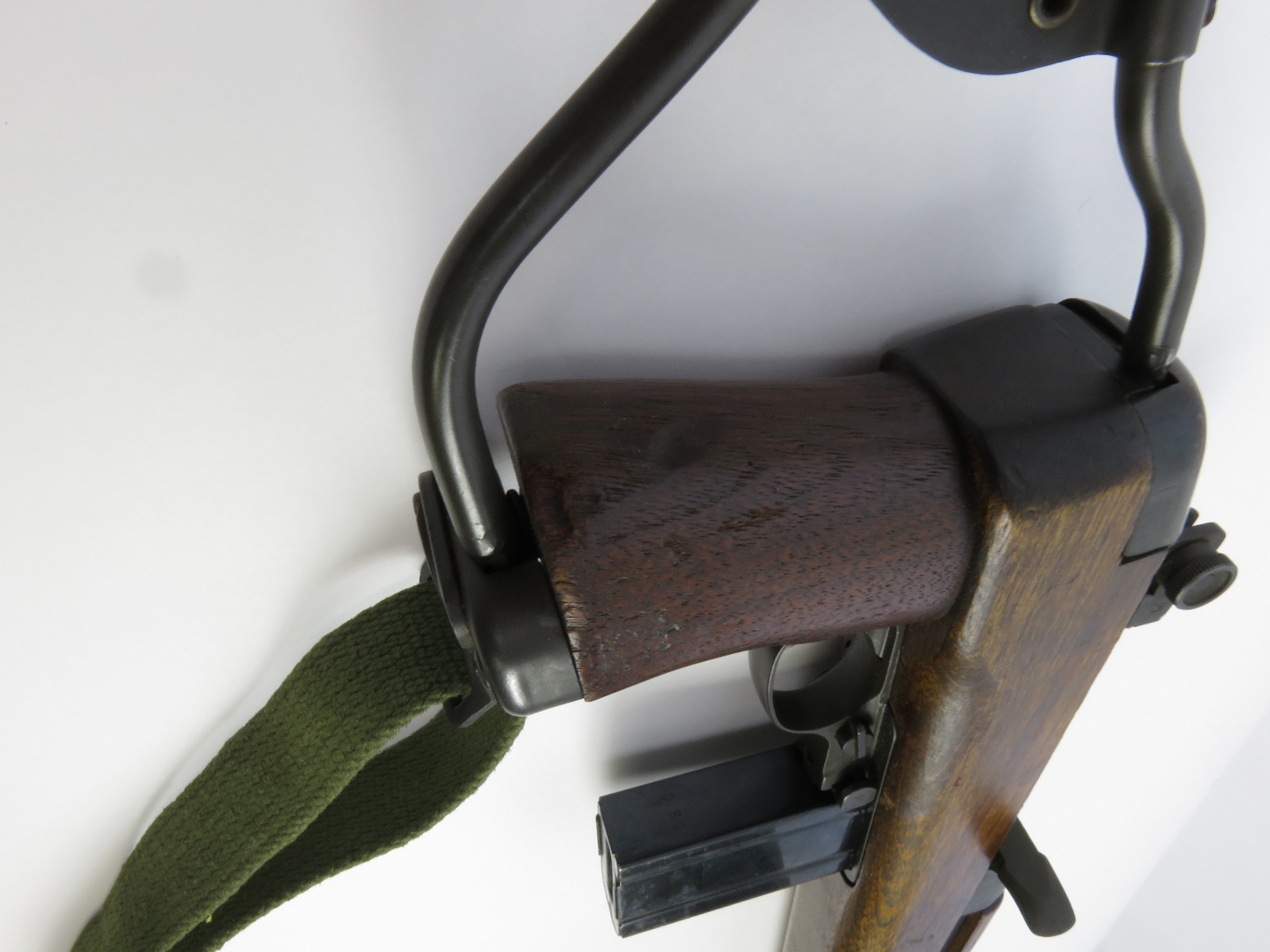7/12/17 – This is a WW2 rebuilt M1A1 Carbine rifle, also known as a partrooper M1 Carbine. The parts are all original, however the serial number of this carbine indicates this was part of the “second run” of M1A1 carbines. These were produced beginning in April of 1944. This carbine however, has a 1943 dated barrel, which indicates that this was perhaps a late 1944, or 1945 arsenal rebuild. There is a bayonet lug and adjustable rear sight. The metal parts are all in excellent conditoin with a clean phosphate finish. The receiver and barrel are proper inland parts. The rear sight is also properly stamped “PI” from inland. The barrel band is stamped “AMCO”. The wood stock is original and in excellent condition with no major issues. Ther is the typical indent from the folding stock on the left side of the wood. The right side of the wood has a faint, yet unaltered cartouche stamp. The bore is excellent and shiny with very little to no wear. The shoulder strap is post war, as it doesn’t have the “C” shaped metal ends. The magazine is stamped “O SG”.