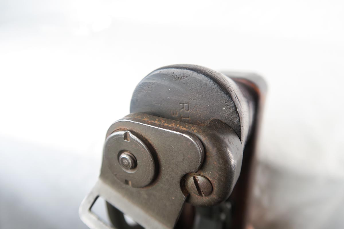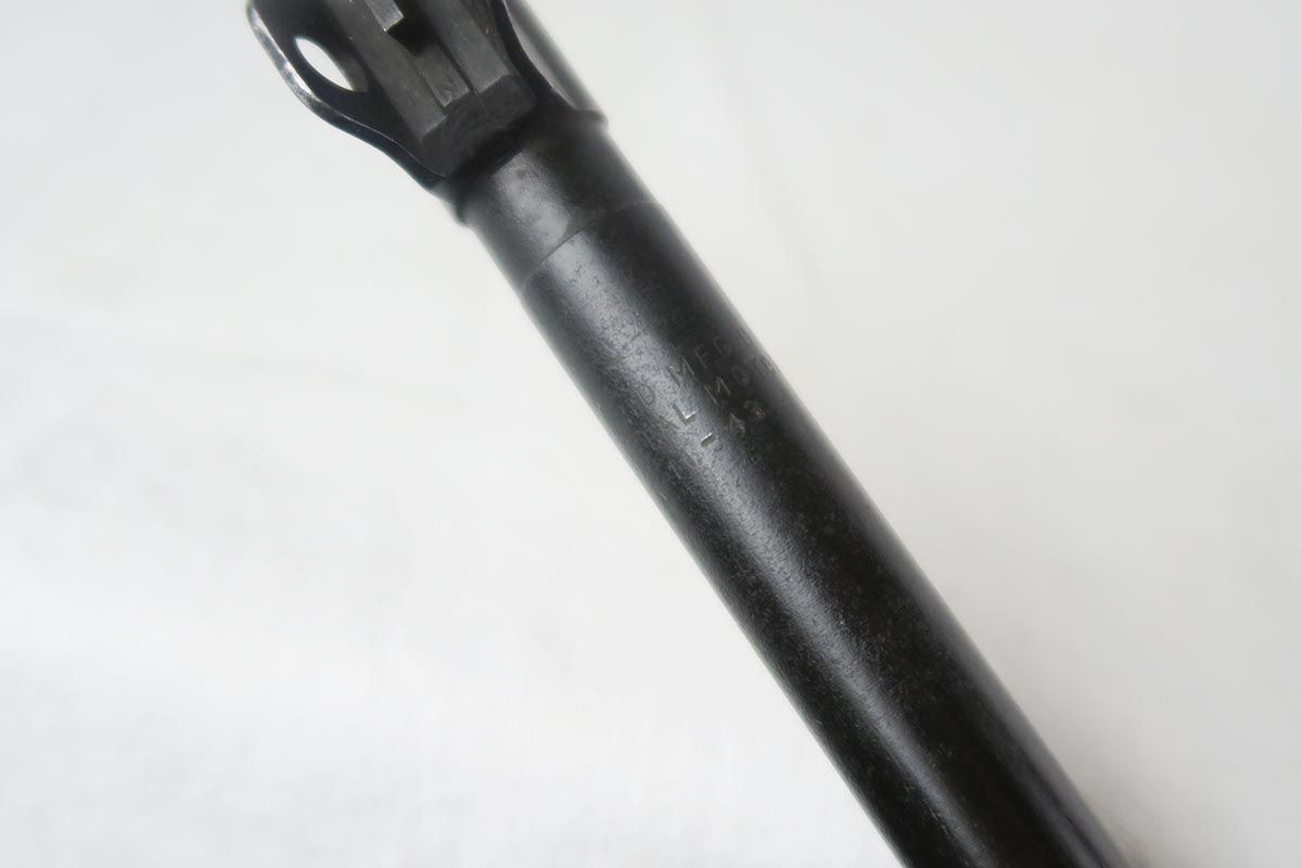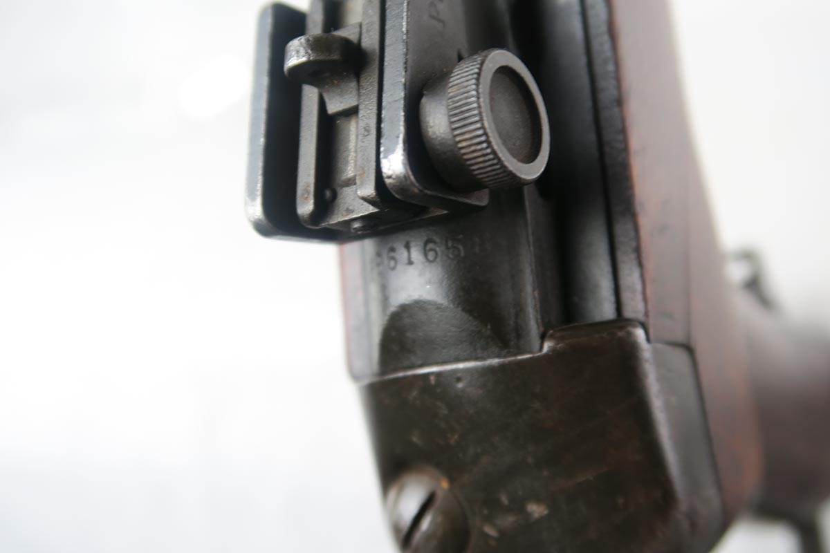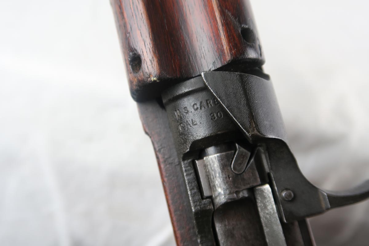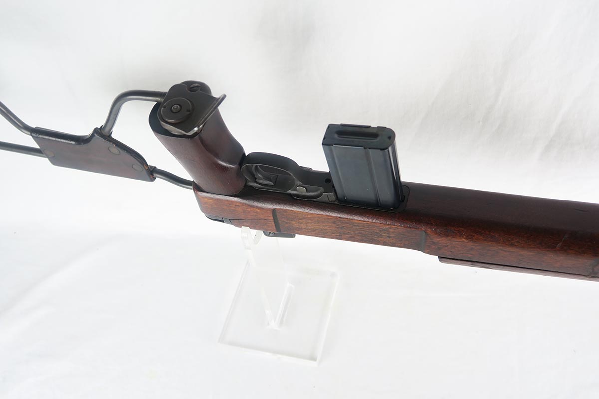 1/30/18 – This is an original paratrooper M1 Carbine.  It was made for WW2 but most likely reworked for the Korean war.  The folding stock is original WW2 era.  Cheek leather and rivets in excellent condition.  The stock itself is marked on the bottom of handle with RI over 3.  Low wood, no belly.  Back of the stock has a crack on both sides that runs about 2-3 inches.  Handguard is IO marked (Inland).  The rifle barrel is General Motors marked with the date 11-43.  Serial is in the 2,961,xxx range.  Bayo lug and wider barrel band were added postwar as was the adjustable rear site.  Rear site is marked with PI.  Bore is clean with no rust or pitting.   WW2 era 15 round magazine is marked IU (Inland).  Excellent example of a war time Paratrooper.