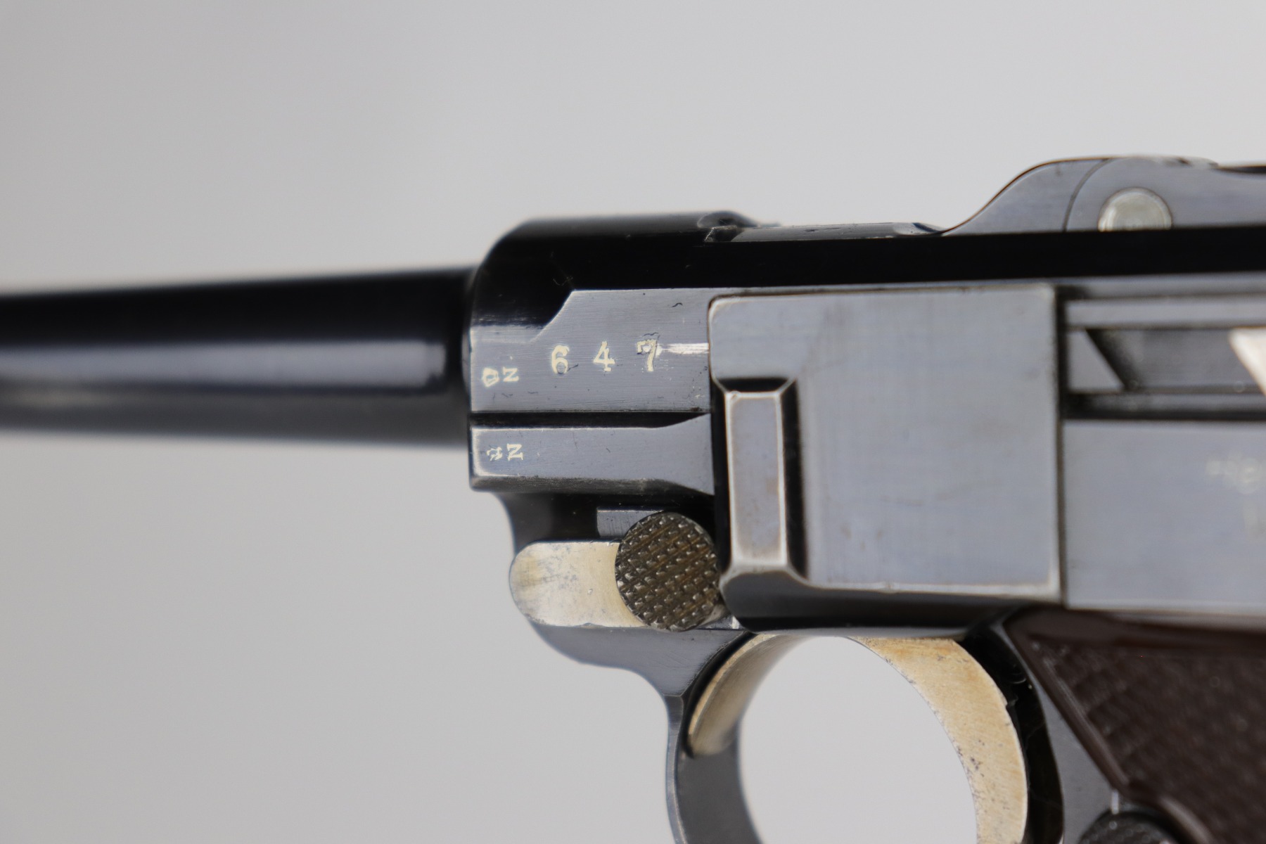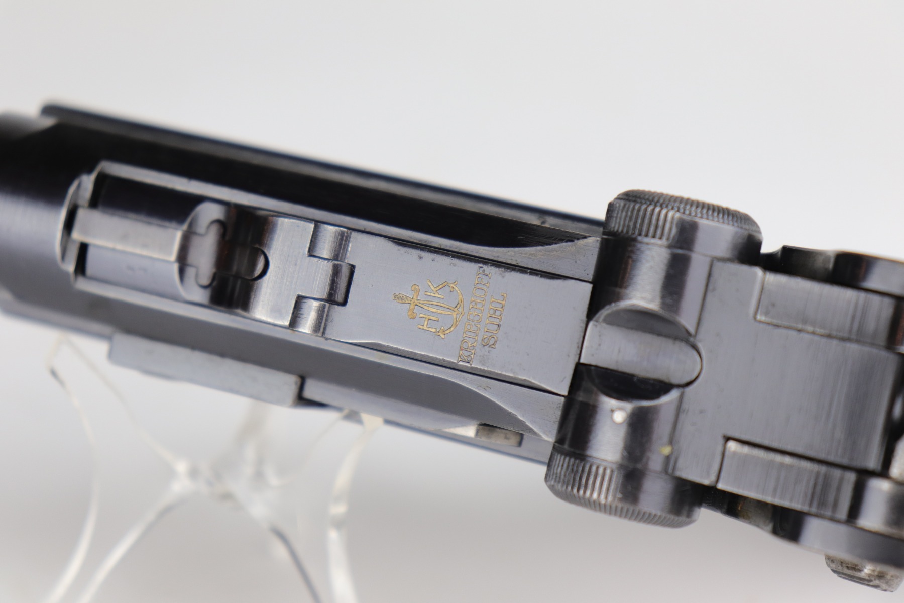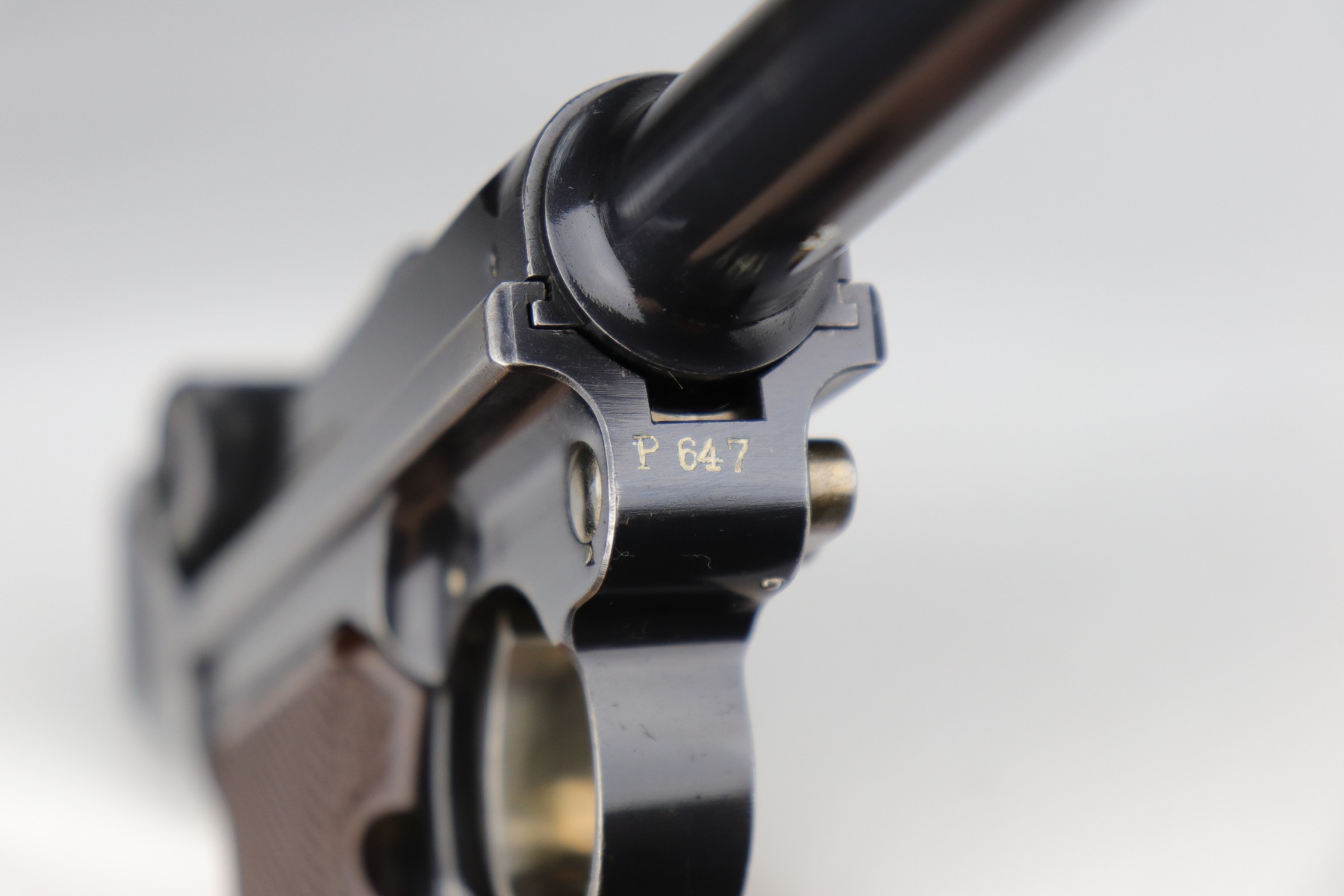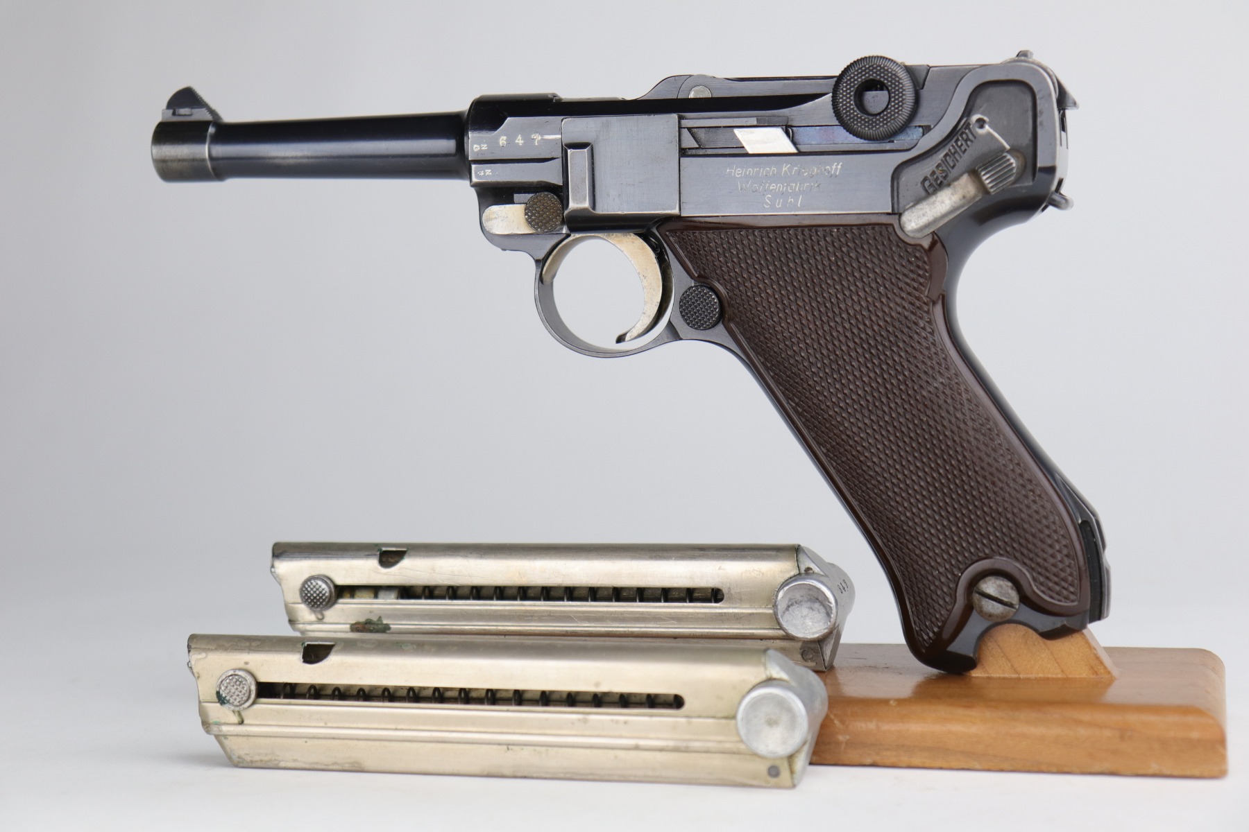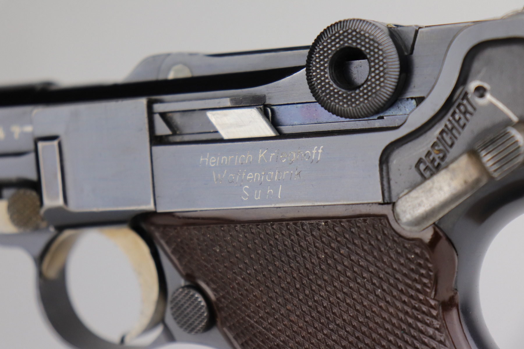 10/30/20 – This is an excellent example of an Inscribed Krieghoff Luger P.08, likely manufactured in 1936. The gun is all matching and has “Crown N” proofs. The inscription on the left side of the frame reads “Heinrich Krieghoff Waffenfabrik Suhl”. This is a private purchase commercial gun, likely presented to a German military officer during WW2. This particular gun is actually featured in “The Krieghoff Parabellum” Book on Page 194. It comes with two matching numbered magazines – one is definitely original and authentic. The duller magazine we are not so sure about – the spacing between the numbers looks different. The gun is in excellent condition, retaining about 95% of its original finish. There are areas of minor wear around the muzzle, on the side plate, on the stock lug, and a small area on the barrel. There is also minor high edge wear on the frame. Minor handling marks on the front strap. It comes with excellent original Krieghoff grips. The bore is excellent – shiny with strong rifling and just very minor freckling here and there.