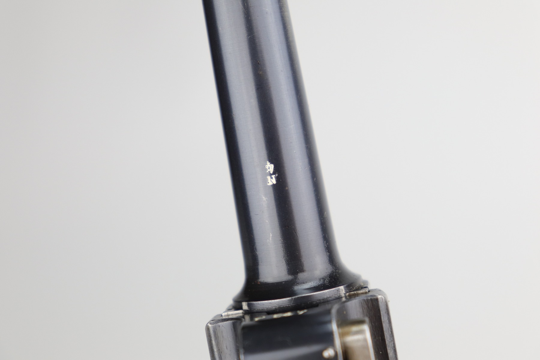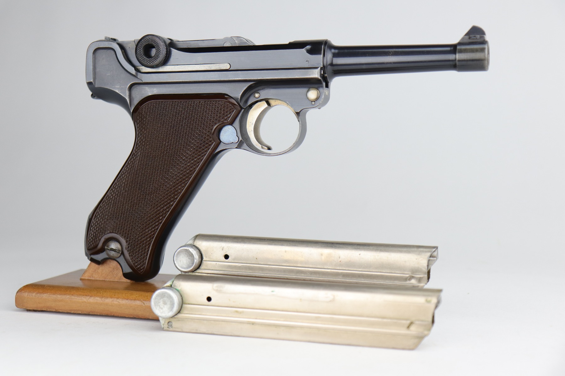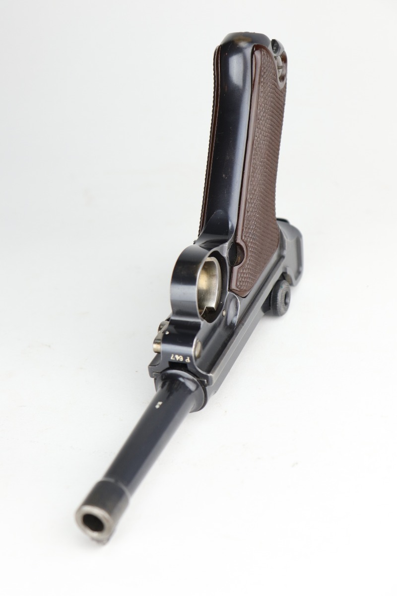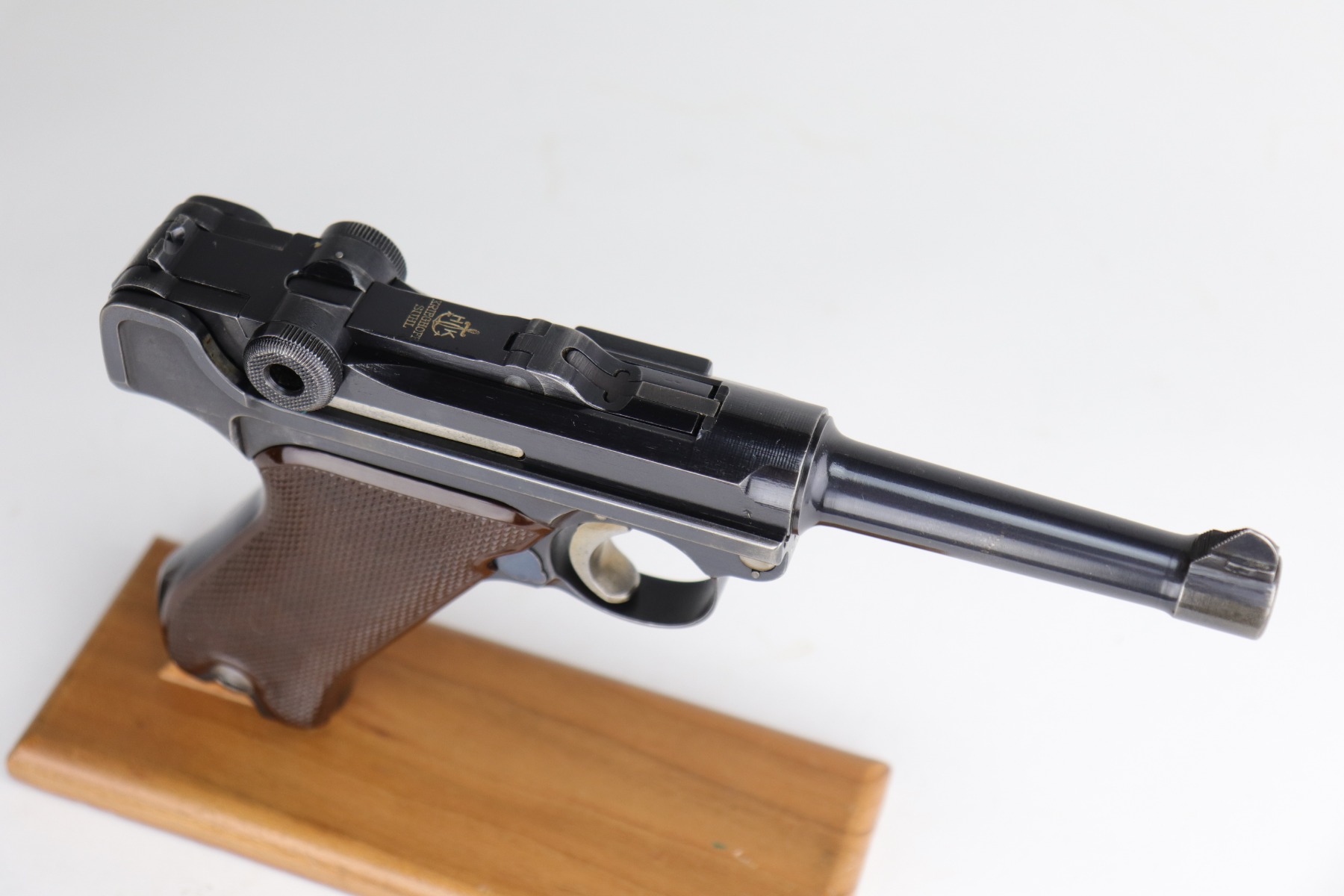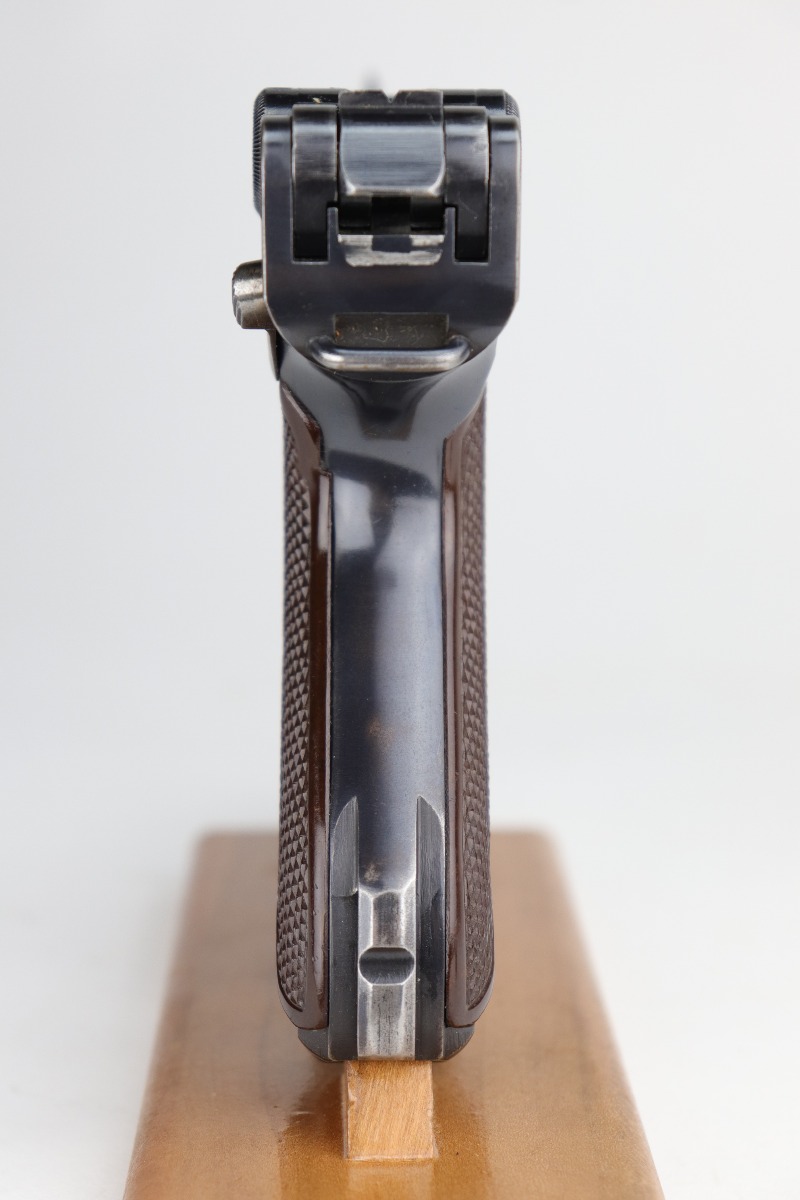 10/30/20 – This is an excellent example of an Inscribed Krieghoff Luger P.08, likely manufactured in 1936. The gun is all matching and has “Crown N” proofs. The inscription on the left side of the frame reads “Heinrich Krieghoff Waffenfabrik Suhl”. This is a private purchase commercial gun, likely presented to a German military officer during WW2. This particular gun is actually featured in “The Krieghoff Parabellum” Book on Page 194. It comes with two matching numbered magazines – one is definitely original and authentic. The duller magazine we are not so sure about – the spacing between the numbers looks different. The gun is in excellent condition, retaining about 95% of its original finish. There are areas of minor wear around the muzzle, on the side plate, on the stock lug, and a small area on the barrel. There is also minor high edge wear on the frame. Minor handling marks on the front strap. It comes with excellent original Krieghoff grips. The bore is excellent – shiny with strong rifling and just very minor freckling here and there.