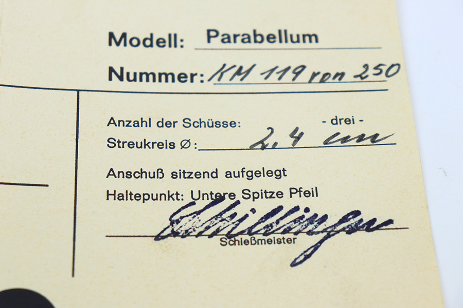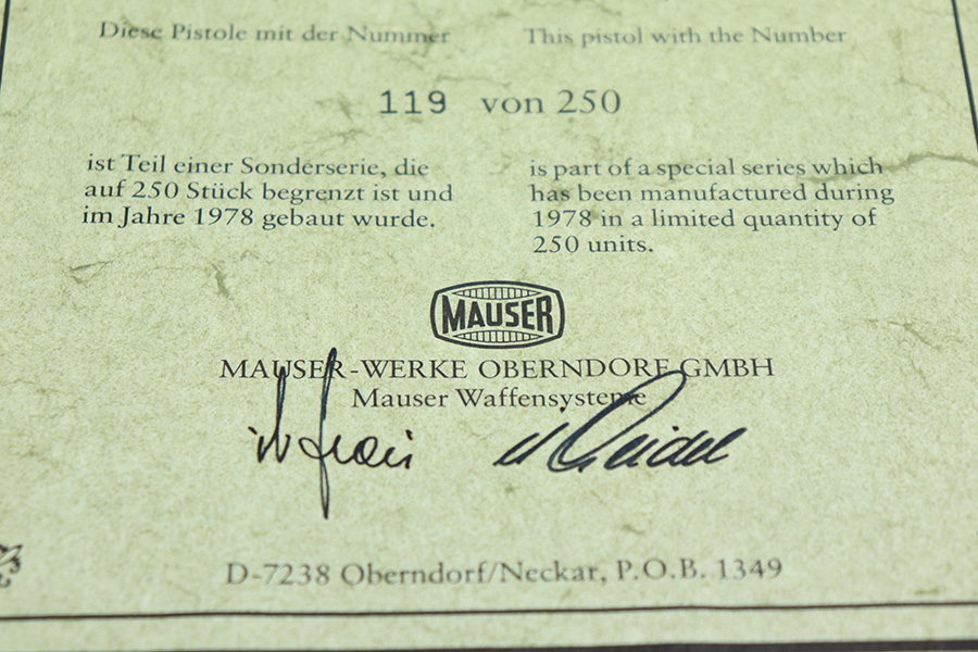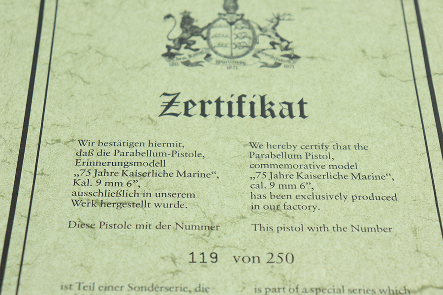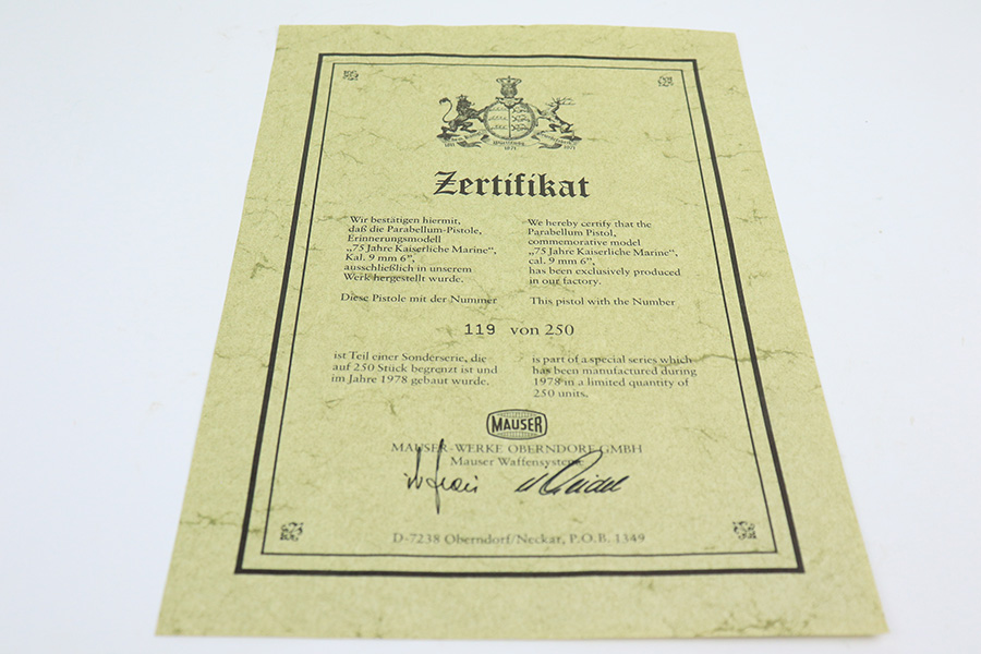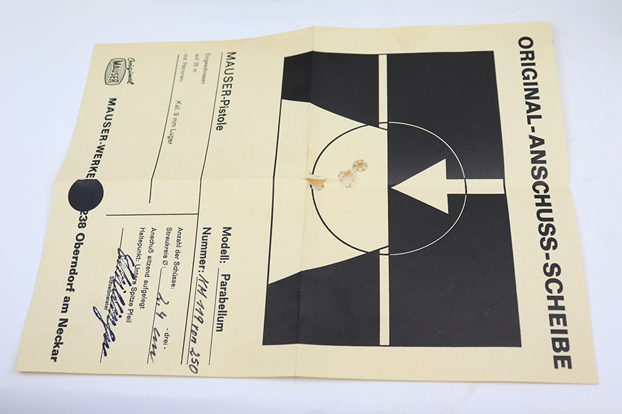 8/26/22 – This is an unfired example of a Mauser Navy Luger that was produced to commemorate the 75th Anniversary and imported by Interarms. The pistol appears untouched, and comes with the original presentation case. The case retains the matching test target, manual, a total of two mags, the cleaning rod, takedown tool and Mauser’s certificate of authenticity. Can’t be upgraded.