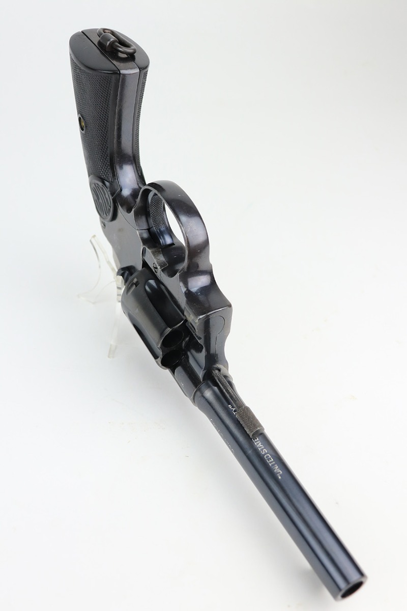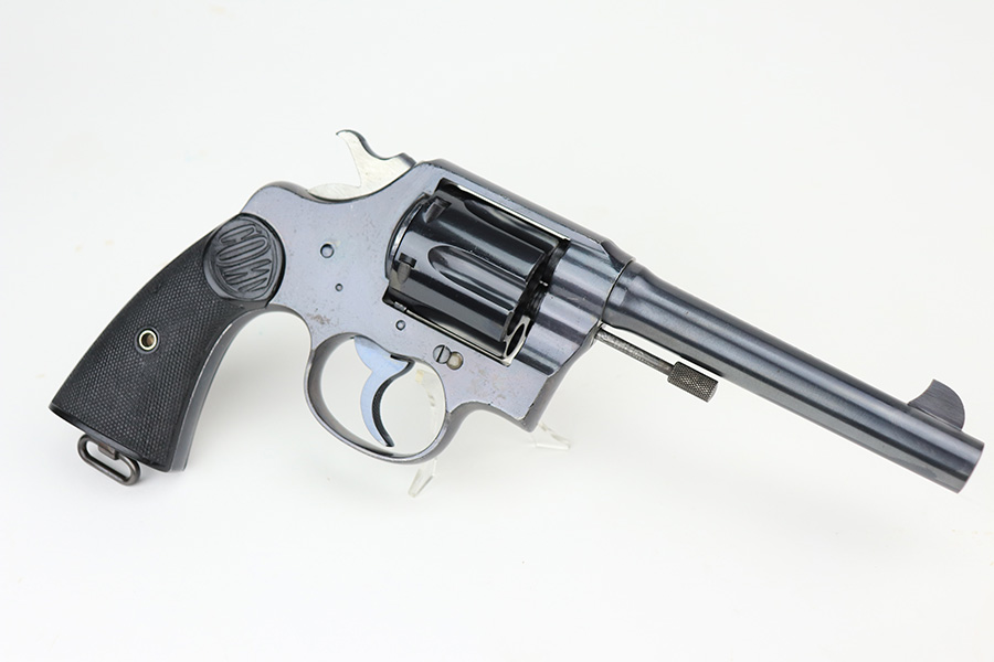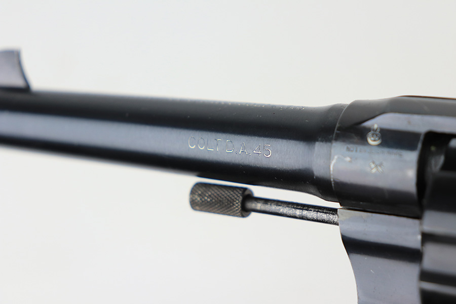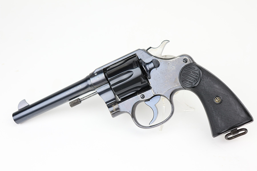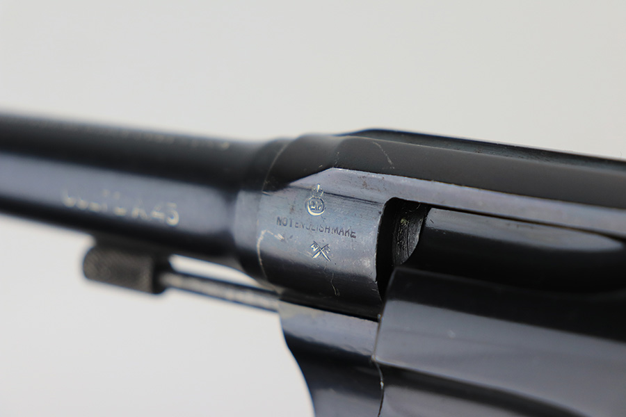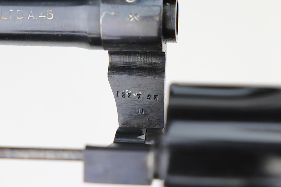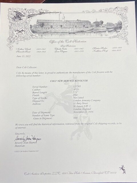 9/6/22 – This is an interesting Colt New Service revolver with a rich history, and comes with a Colt archive letter. Made in 1916, this revolver was shipped in .455c to the London Armoury Company in London, England on November 22, 1916. The London Armoury Company was a London arms manufactory that imported arms from America during WW1. So this revolver was issued for British military use, but later sold/exported back to the states as it is marked ‘NOT ENGLISH MAKE’. It also has United States Property marked on the barrel, indicating the barrel was likely changed out along with the cylinder to change this revolver to .45c. The cylinder arm is mismatched to the frame. Nice finish throughout, with most of the wear on the left side of the frame. Terrific bore. Excellent, original Colt grips made of hard rubber with no cracks or chips, just minor smoothing. Mechanics seem good.
