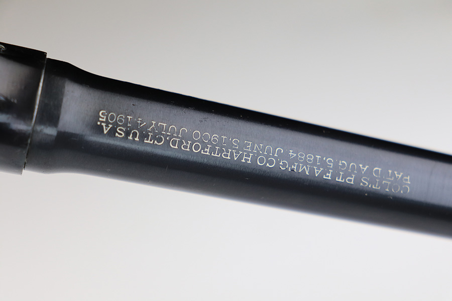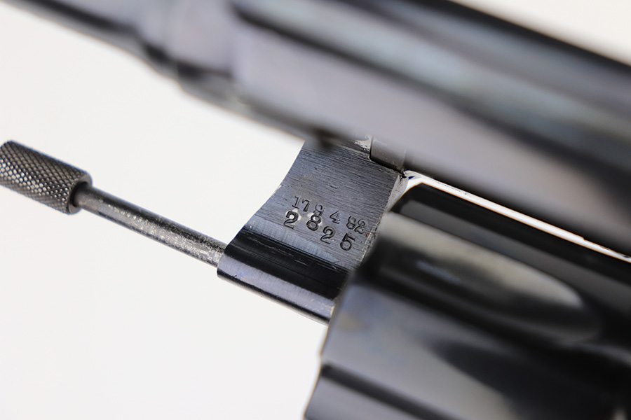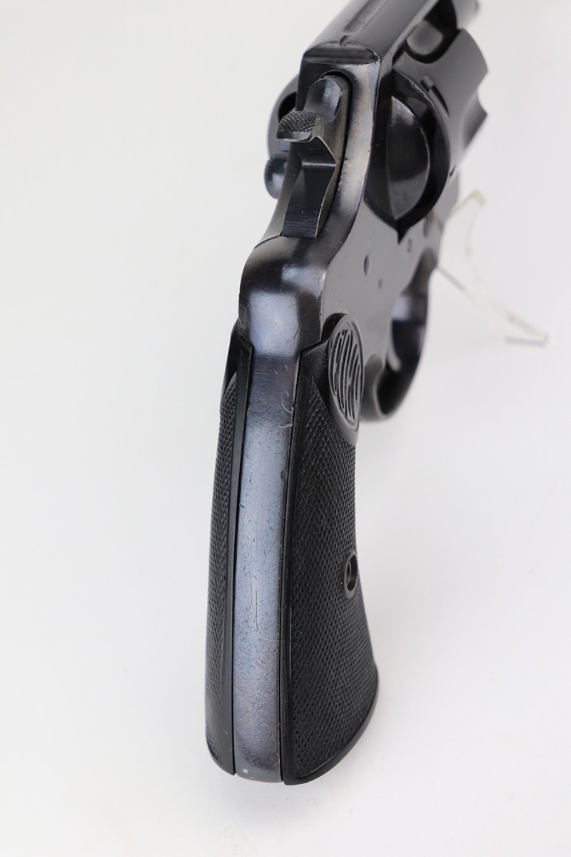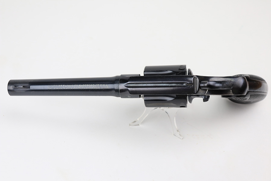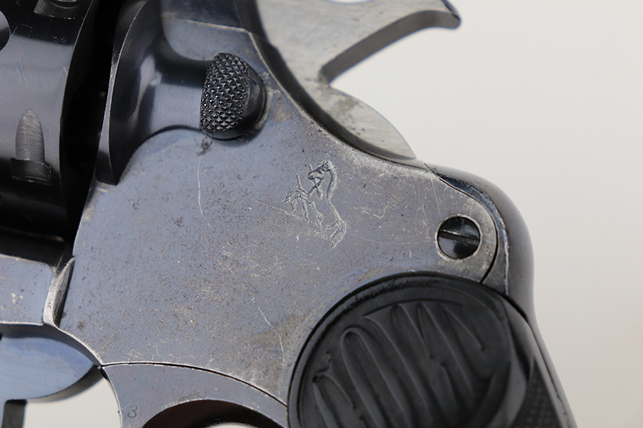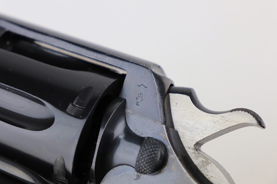 9/6/22 – This is an interesting Colt New Service revolver with a rich history, and comes with a Colt archive letter. Made in 1916, this revolver was shipped in .455c to the London Armoury Company in London, England on November 22, 1916. The London Armoury Company was a London arms manufactory that imported arms from America during WW1. So this revolver was issued for British military use, but later sold/exported back to the states as it is marked ‘NOT ENGLISH MAKE’. It also has United States Property marked on the barrel, indicating the barrel was likely changed out along with the cylinder to change this revolver to .45c. The cylinder arm is mismatched to the frame. Nice finish throughout, with most of the wear on the left side of the frame. Terrific bore. Excellent, original Colt grips made of hard rubber with no cracks or chips, just minor smoothing. Mechanics seem good.