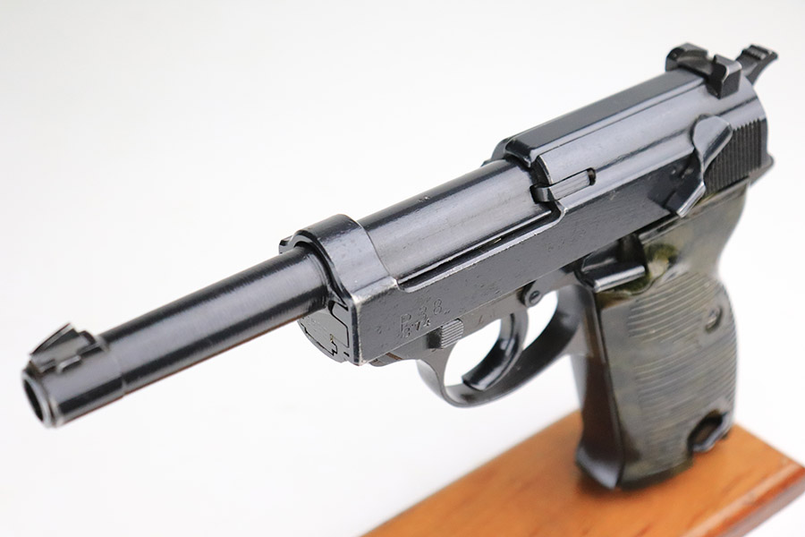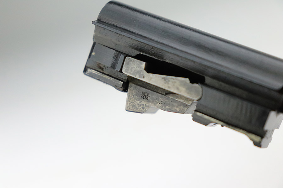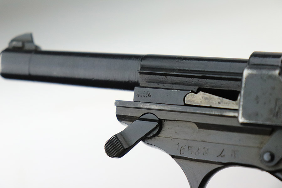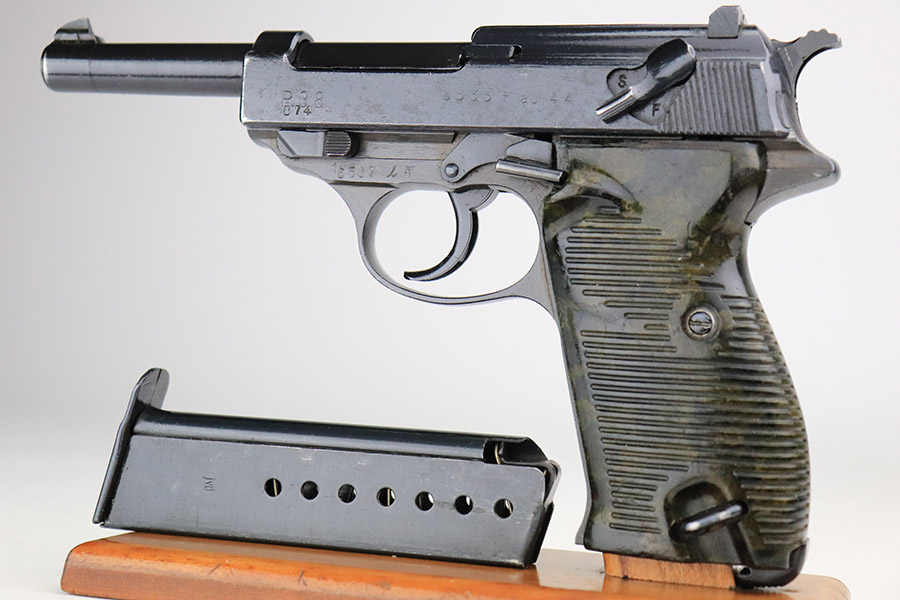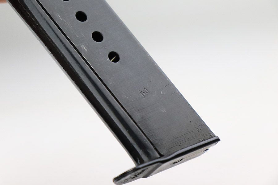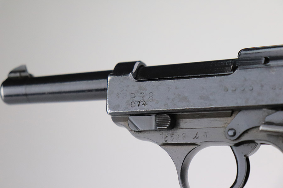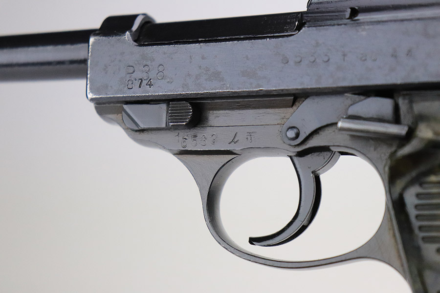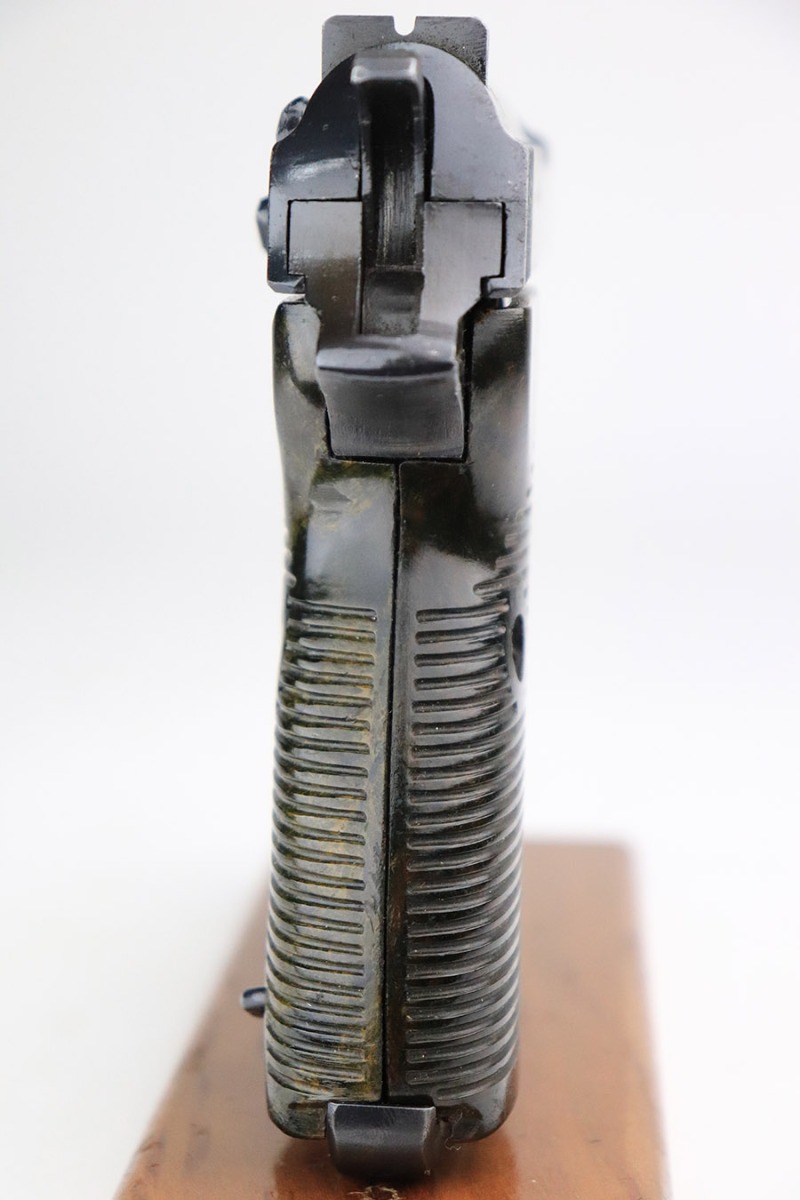 11/17/22 – This is an interesting example of a CZ 46, a P.38 put together by the Czechs in 1946 using leftover Nazi parts. The gun is all matching and has a Czech Lion proof on the top of the barrel. There is not, however, the typical “46” marking on the right side of the trigger guard. The frame was made by Mauser (Eagle 135 proofed), the slide was made by Walther (Eagle 359 proofed and AC 44 marked), and the barrel was made by the Czech fnh factory (Waffen 76 proofed). There is Czech numbering “874” on the left side of the slide. The entire gun has been arsenal refinished with very little finish loss, just very minor wear around the muzzle and at the front edges of the slide. While there is very little actual finish loss, there are areas of pin-pricking under the finish throughout. Comes with a set of nice greenish-black bakelite grips and a jvd magazine that was re-numbered on the base to match. The bore has good rifling with very minor pin-pricking throughout. De-cocker is not functional.