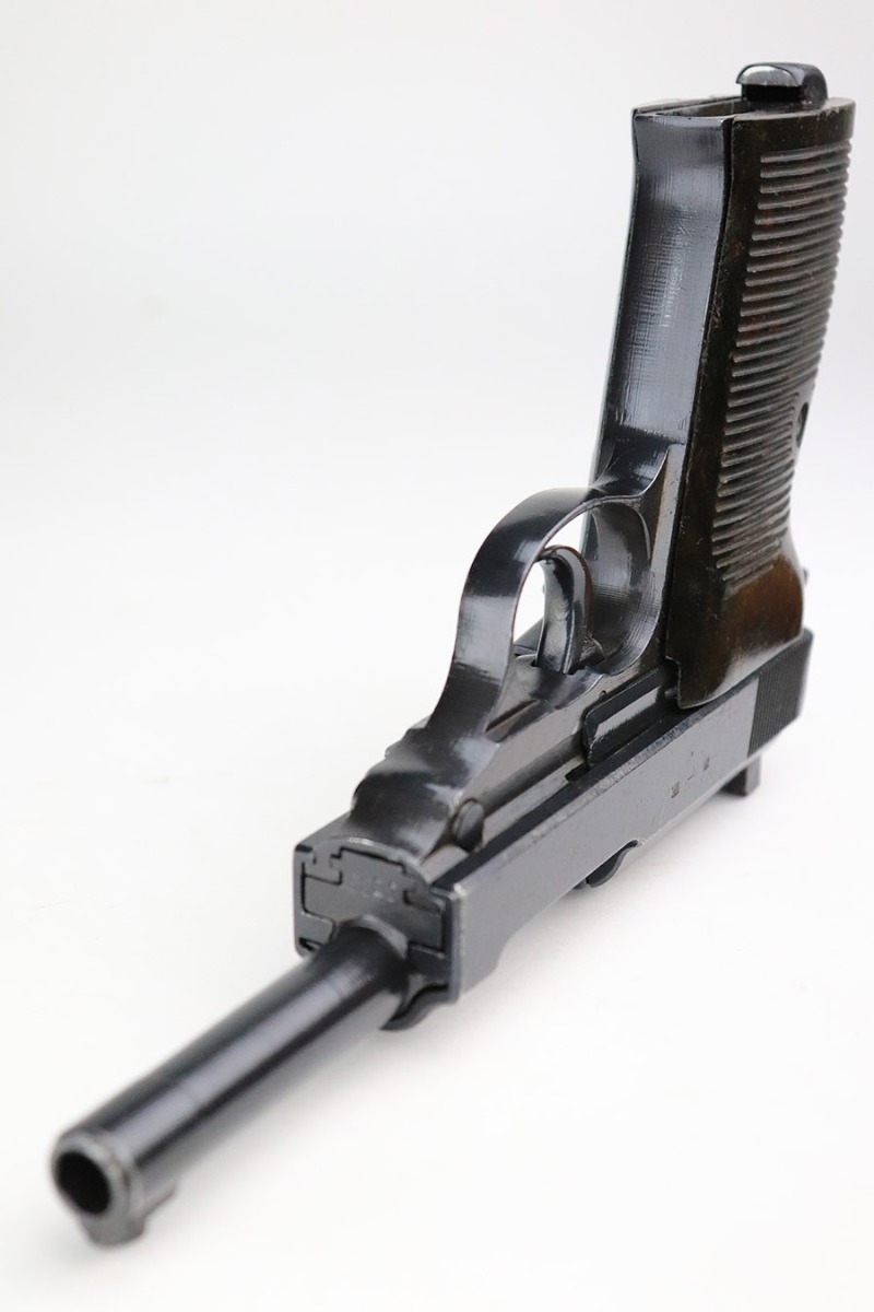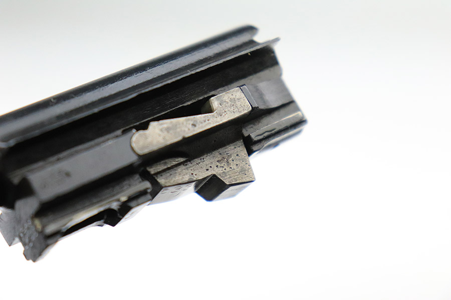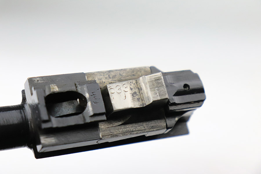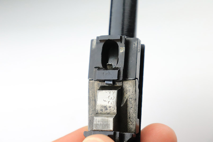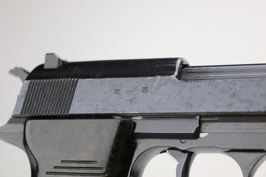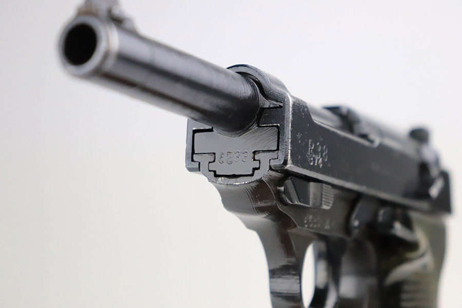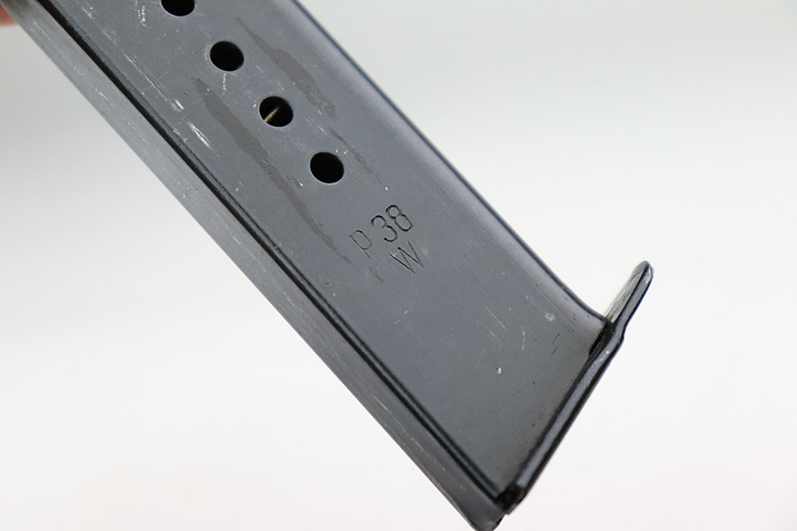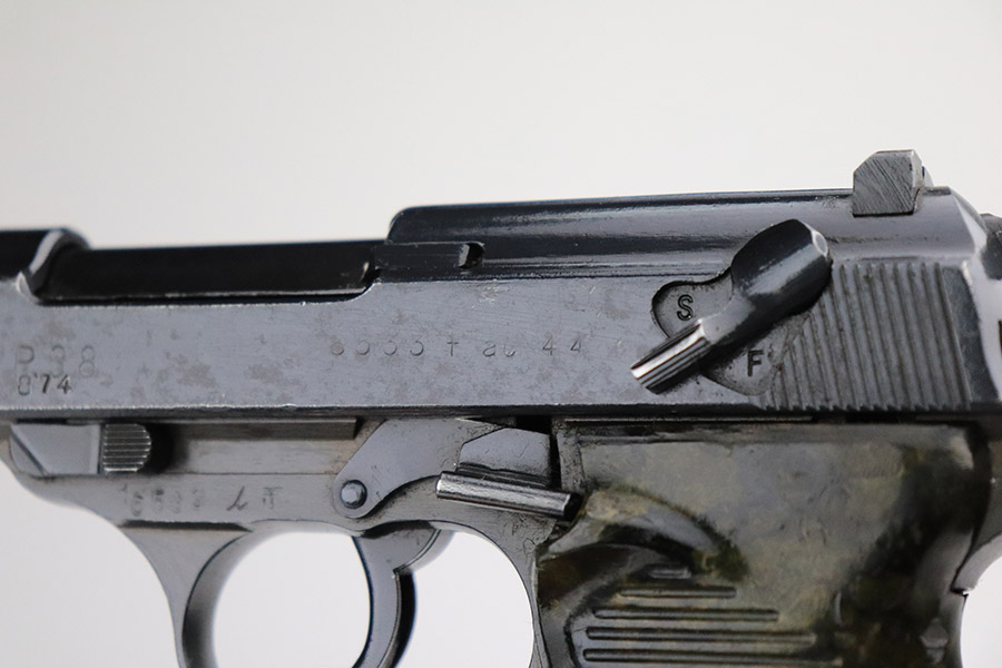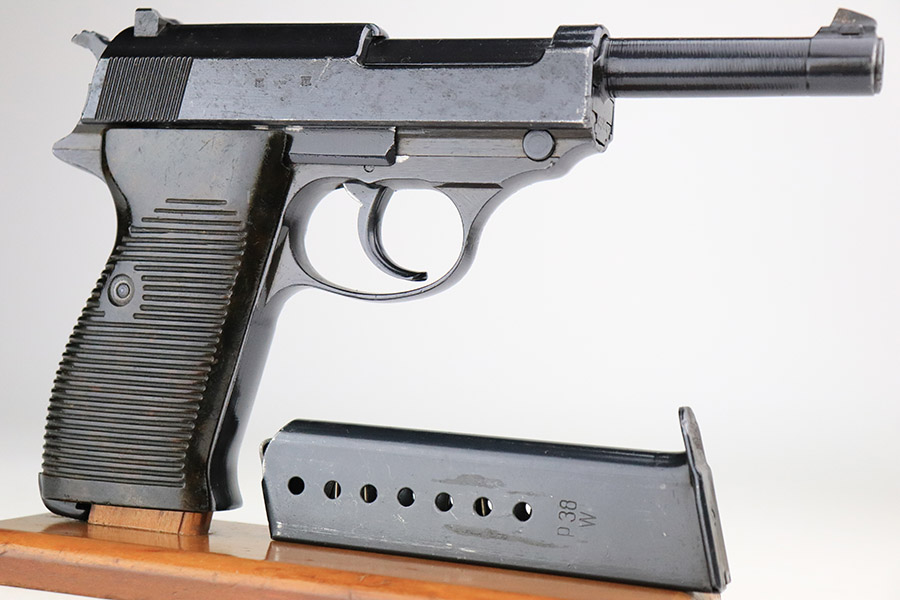 11/17/22 – This is an interesting example of a CZ 46, a P.38 put together by the Czechs in 1946 using leftover Nazi parts. The gun is all matching and has a Czech Lion proof on the top of the barrel. There is not, however, the typical “46” marking on the right side of the trigger guard. The frame was made by Mauser (Eagle 135 proofed), the slide was made by Walther (Eagle 359 proofed and AC 44 marked), and the barrel was made by the Czech fnh factory (Waffen 76 proofed). There is Czech numbering “874” on the left side of the slide. The entire gun has been arsenal refinished with very little finish loss, just very minor wear around the muzzle and at the front edges of the slide. While there is very little actual finish loss, there are areas of pin-pricking under the finish throughout. Comes with a set of nice greenish-black bakelite grips and a jvd magazine that was re-numbered on the base to match. The bore has good rifling with very minor pin-pricking throughout. De-cocker is not functional.