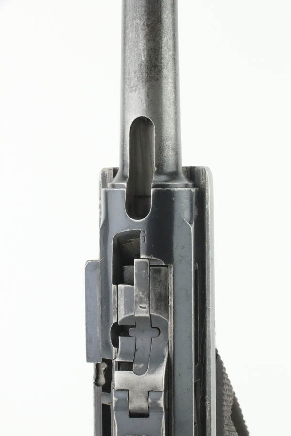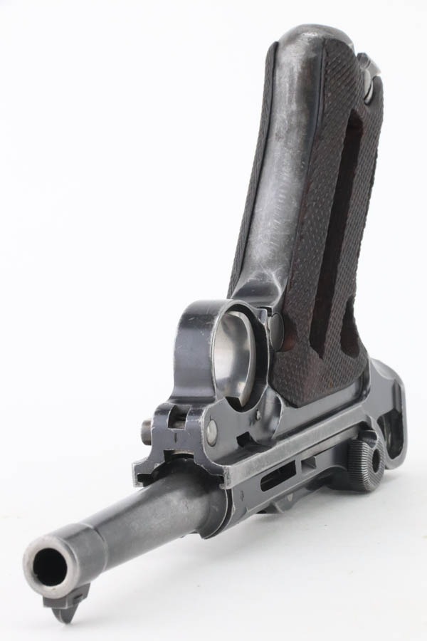 10/1/24 – This is an interesting factory cutaway Mauser Luger. The chamber shows a partial “G Date” indicating it was manufactured by Mauser in 1935. Oddly enough, the gun has Farsi serial numbering and “Safe” written in Farsi on the safety, so we assume this was part of a Persian contract. There is a crown marking on the right side of the slide. The finish rates roughly 50% with obvious wear and finish loss throughout. Comes with a blank, un-numbered magazine. Mint bore. Even though all the parts move, this is not a functional firearm. No FFL is required.