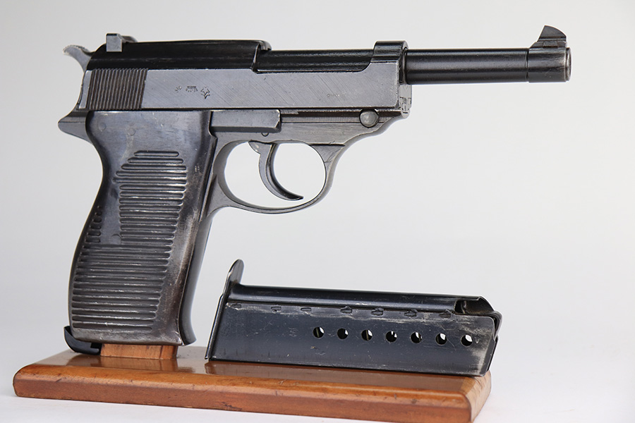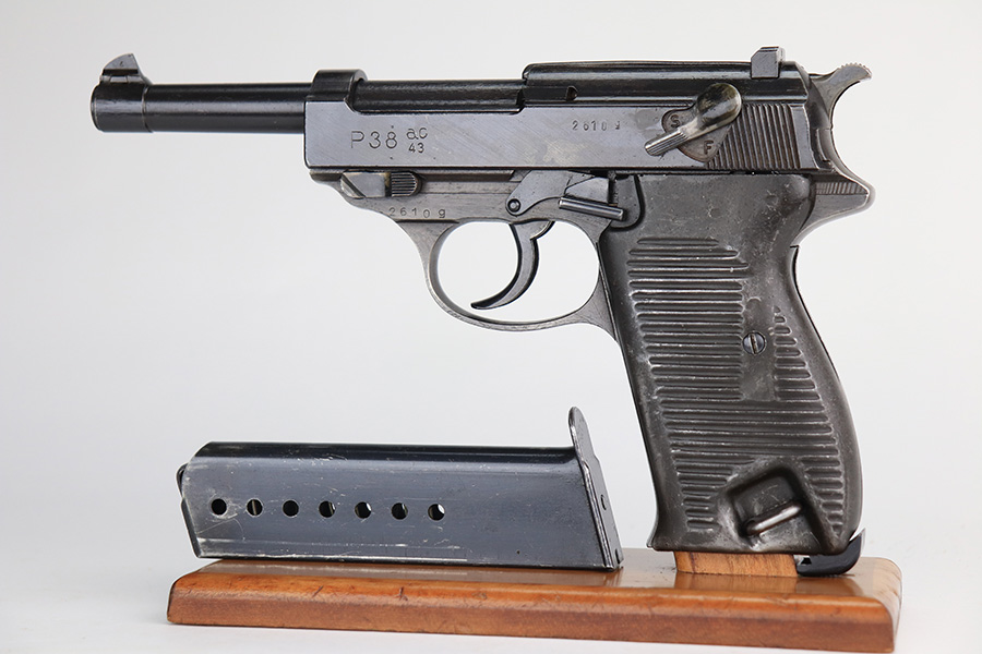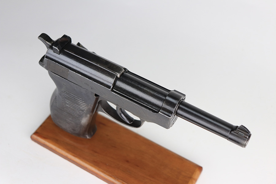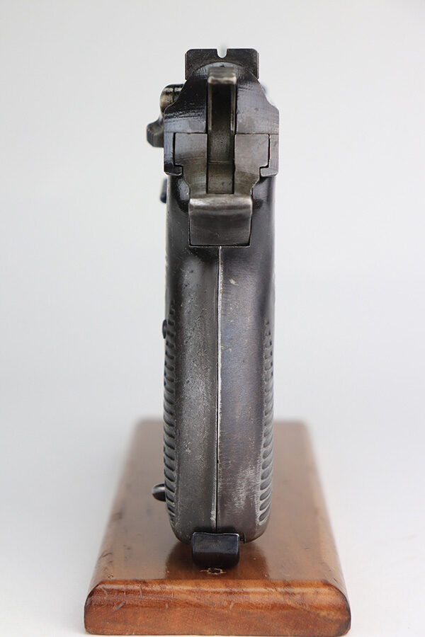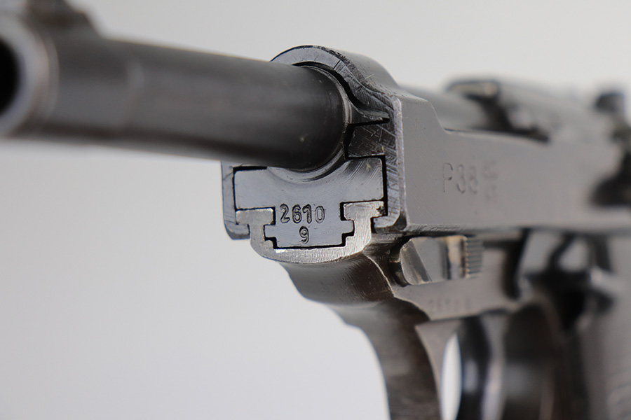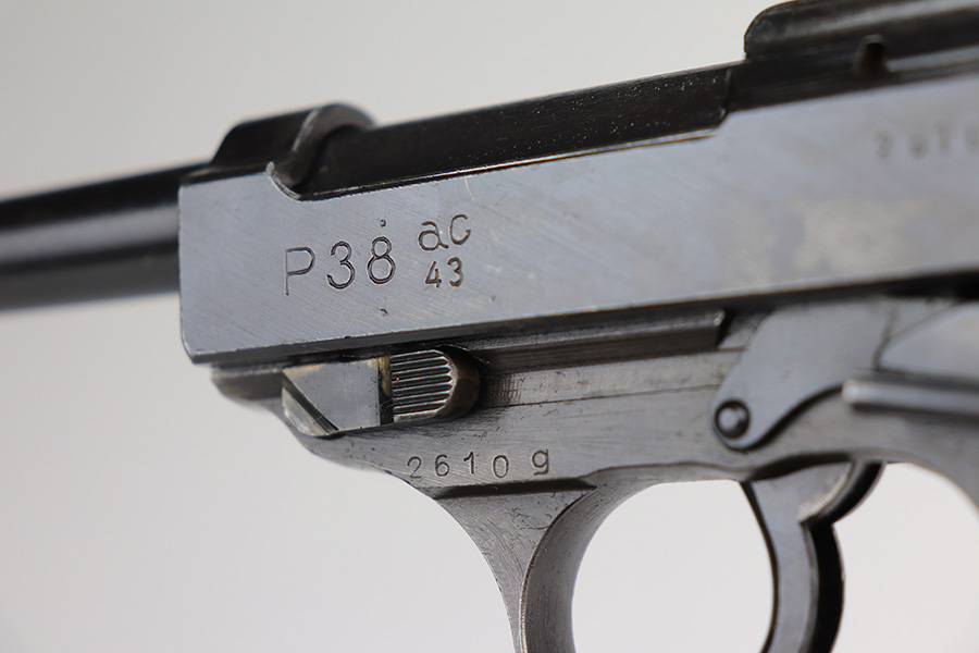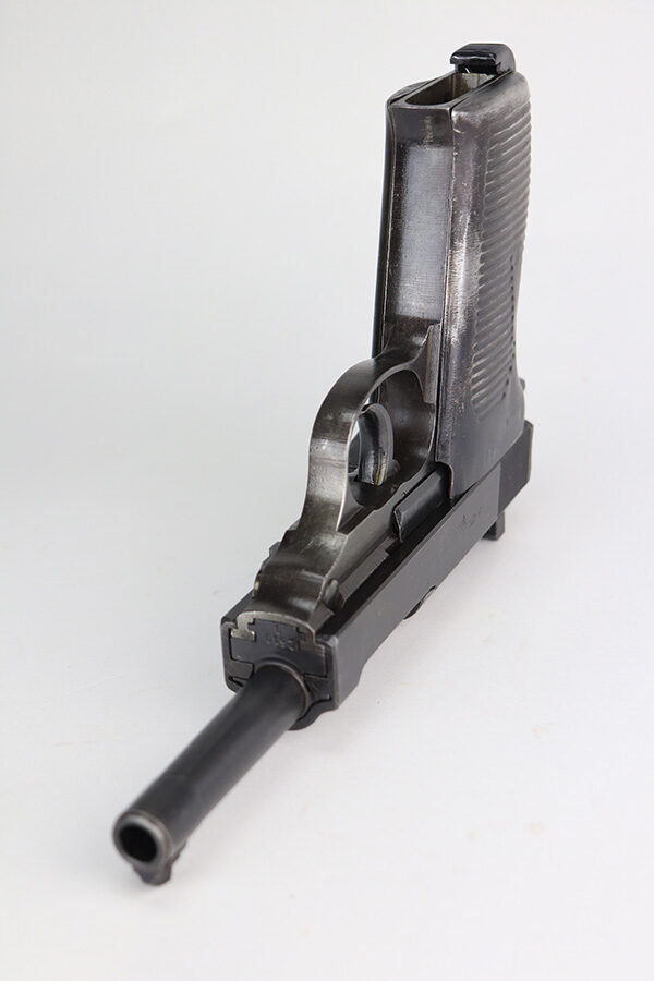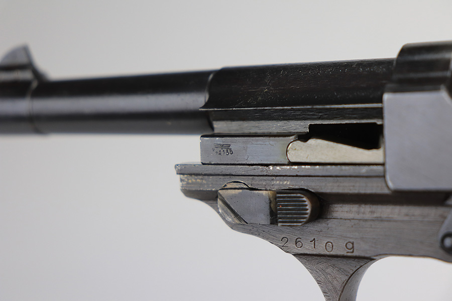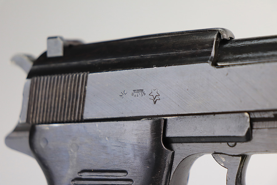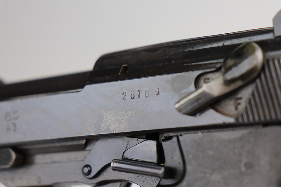 12/16/21 – This is a very interesting P.38. For the P.38 collector, it has a little bit of everything. It was put together by the French immediately following WW2 using leftover Nazi parts – all matching numbers. It has a rare FN-made slide, dated 1943. There are “Waffen 135” Nazi military acceptance proofs on the barrel and right side of the slide. Also on the right side of the slide is a factory double-stamped French star proof and an asterisk marking. The asterisk indicates it failed initial inspection and was sent back for repair. There is a very faint import mark on the right side of the slide. The gun comes with one period-correct magazine and desirable “Gray Ghost” French grips. The gun has retained about 90% of its finish. There is scratchy wear on the front strap, thinning on the right side of the frame, and some minor wear on the high edges. While there isn’t a lot of actual finish loss, there is splotchy discoloration throughout, most noticeable on the left side and top of the slide. The bore is near-mint. De-cocker is functional.