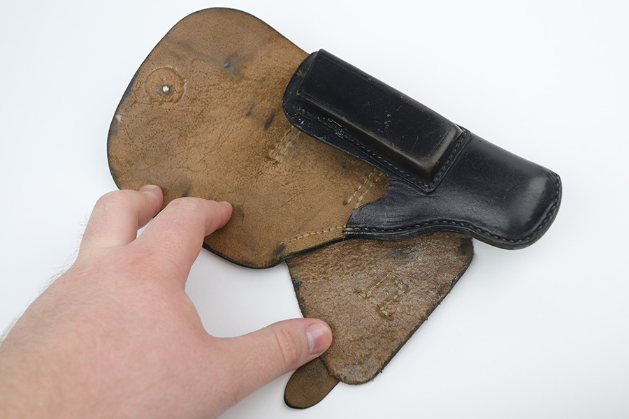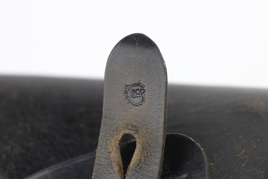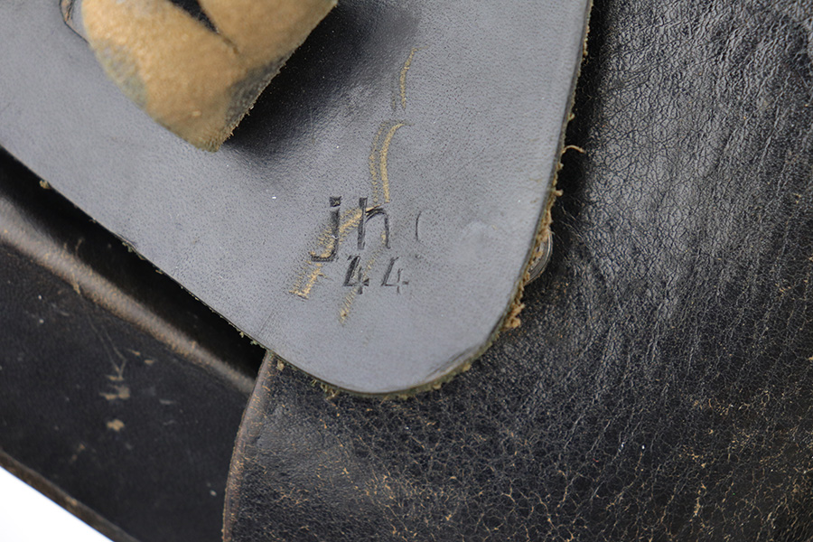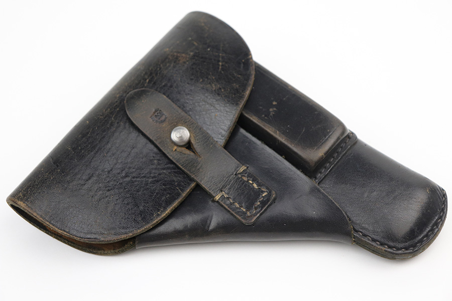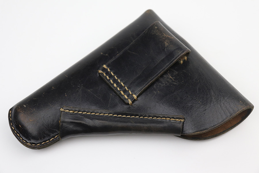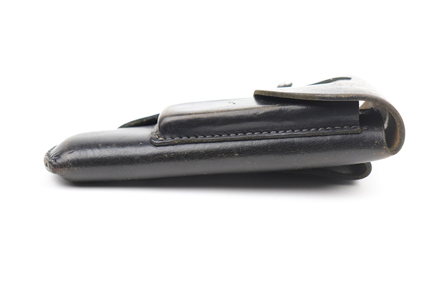 8/30/21 – This is a very interesting Mauser HSC holster. It is maker-marked, dated 1944, and has a Nazi waffen proof on the closure strap. There is, however, a GECO retailer marking stamped overtop of the waffen proof. We would assume the Nazi military had it first and was then sold in the commercial market, but we can’t say for sure. Overall, it is in very nice condition. The leather is soft and workable and the stitching is intact. Very light scratches and handling marks throughout. Some very light cracking on the stop flap.