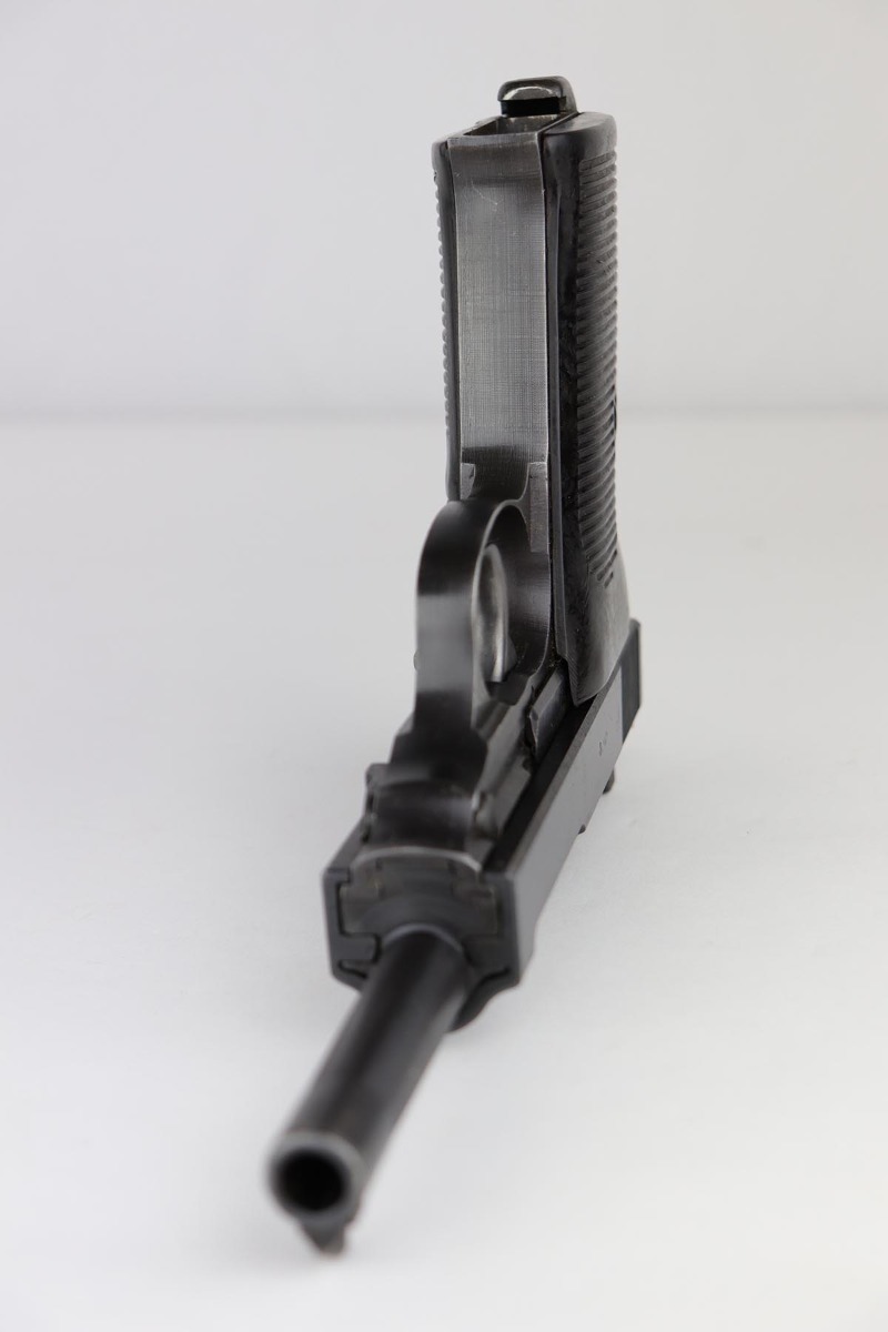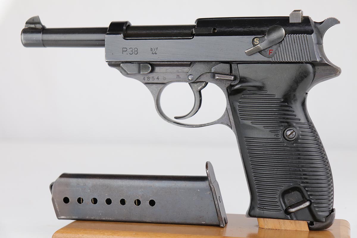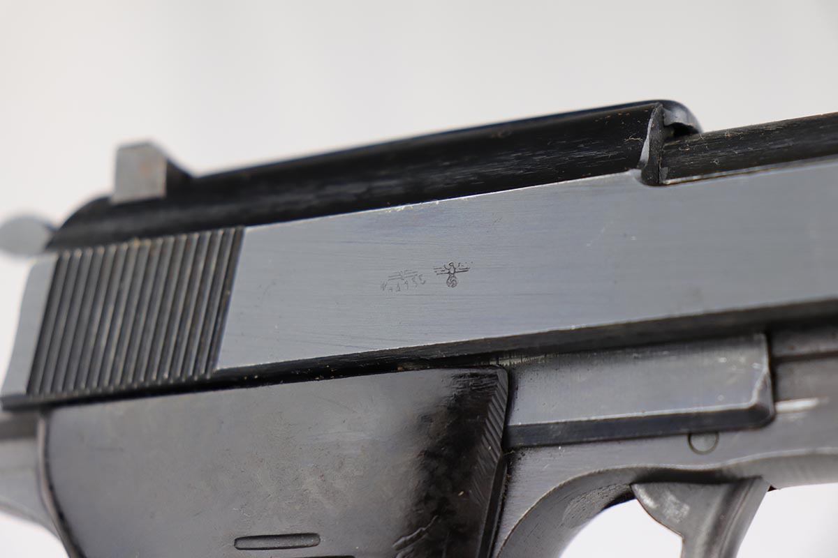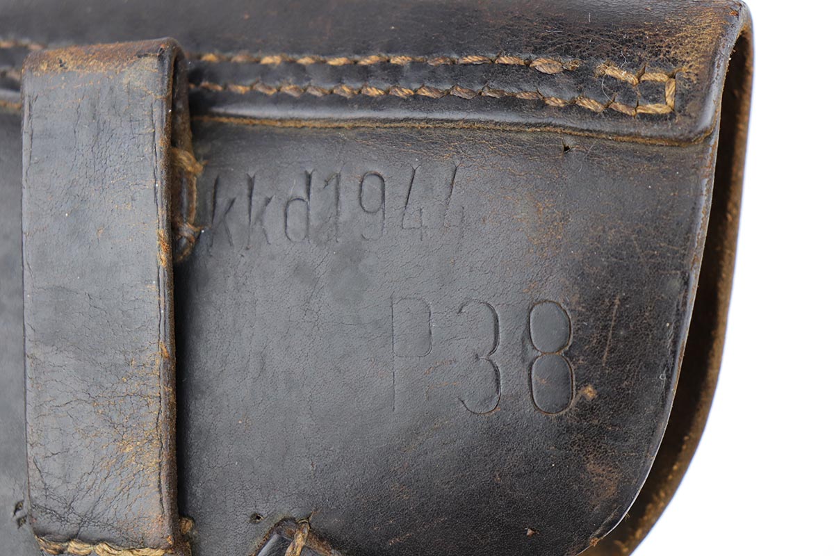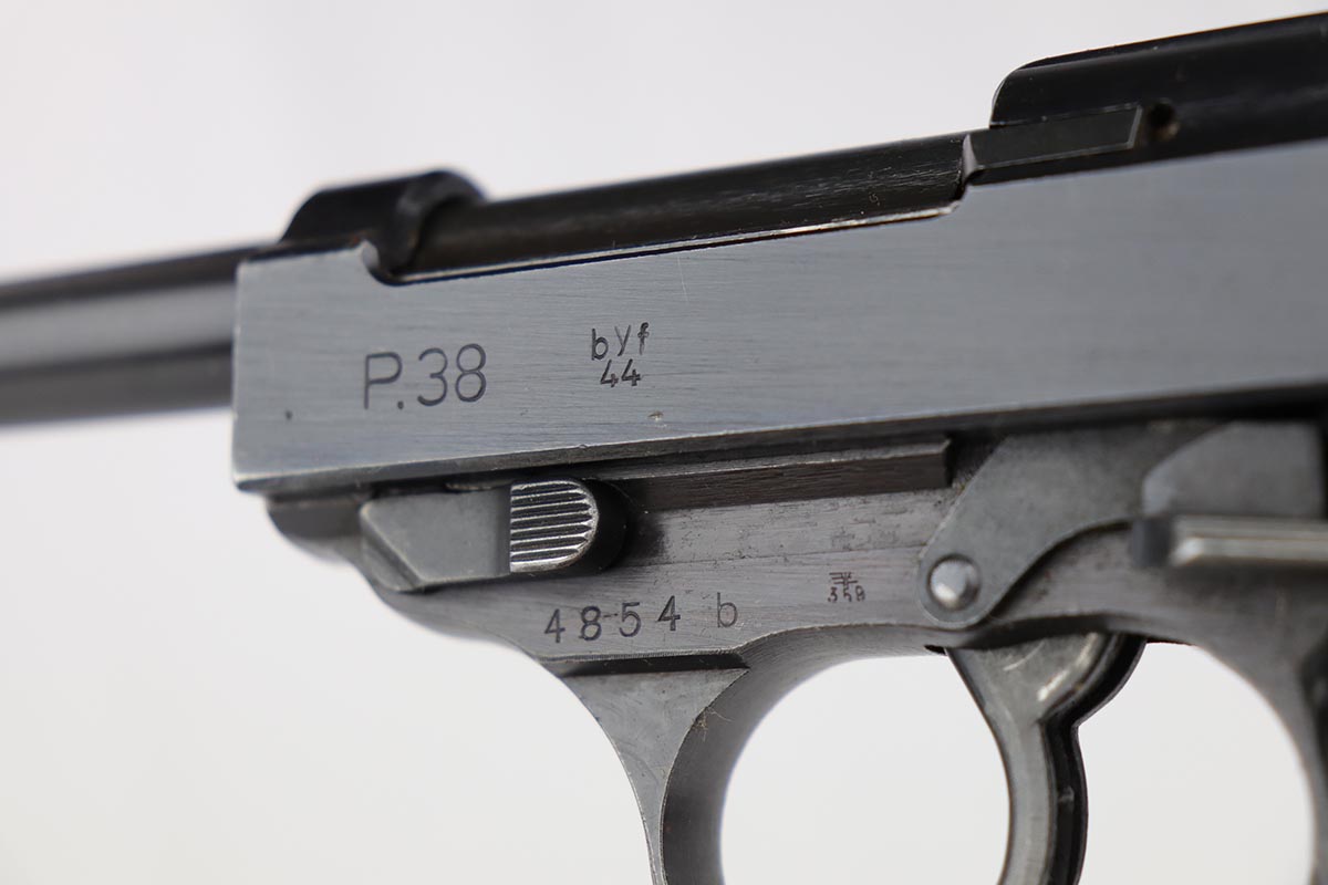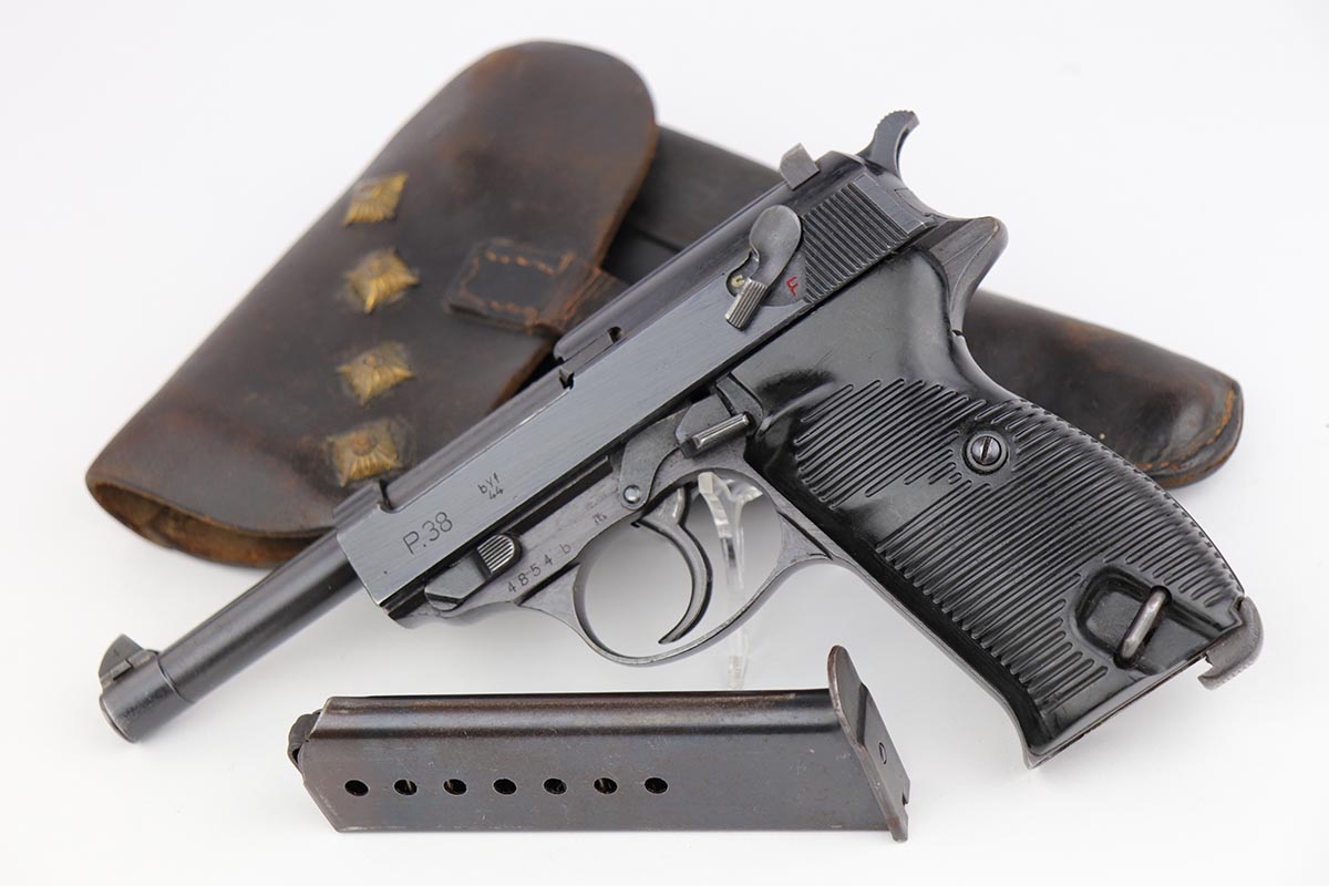 7/23/19 – This is an interesting, Nazi-issued P.38 from the end of the war. The frame is Walther made, while the slide and barrel are Mauser. But what makes this gun interesting is that the slide and barrel have no serial, and the slide did not receive the final inspection proof. Thus, the gun was likely put together from unissued parts at the end of the war, and this would help explain why the finish is in excellent condition and the bore is near-mint. Excellent brown grips, and the magazine has the Walther waffenamt, as well as ‘jvd’ and ‘WaA706’ proofs on spine. The de-cocker doesn’t work on this gun, though it does function as a safety. Mechanics are good otherwise. Pistol comes with a period original holster, which is 1944 dated on the back and GI embellished on the front flap.