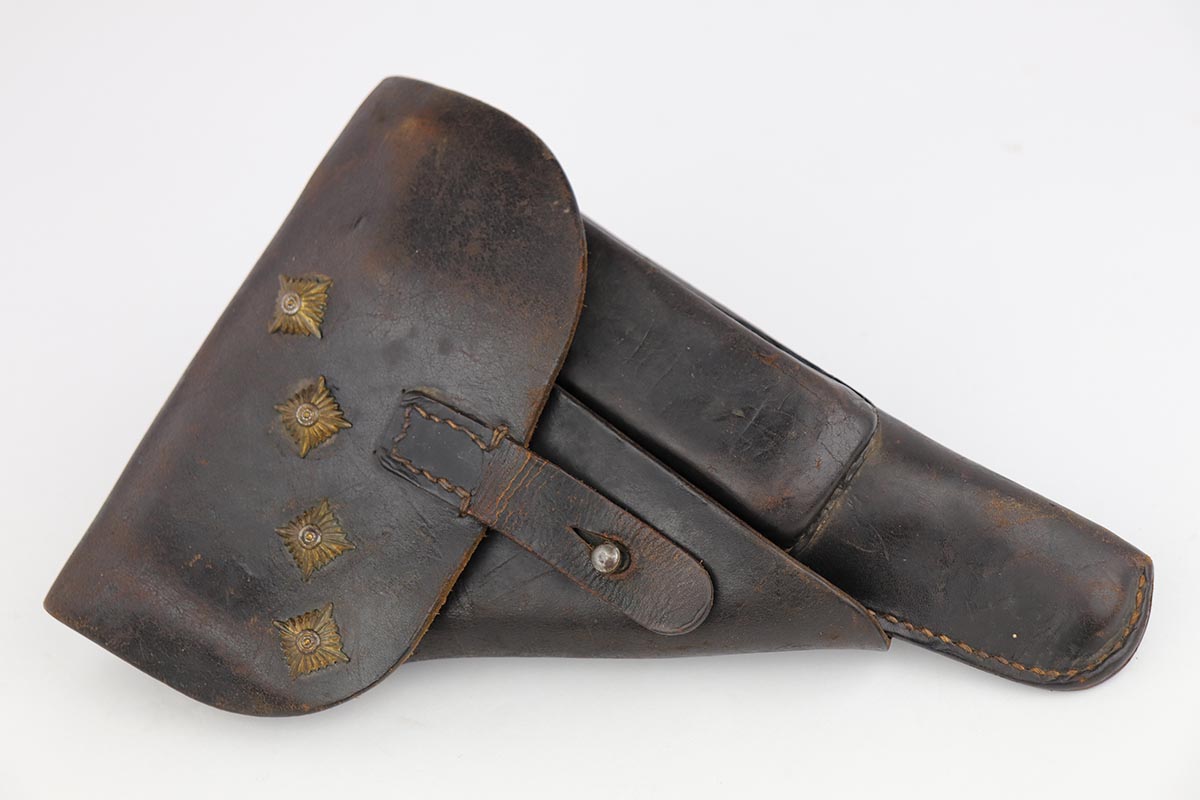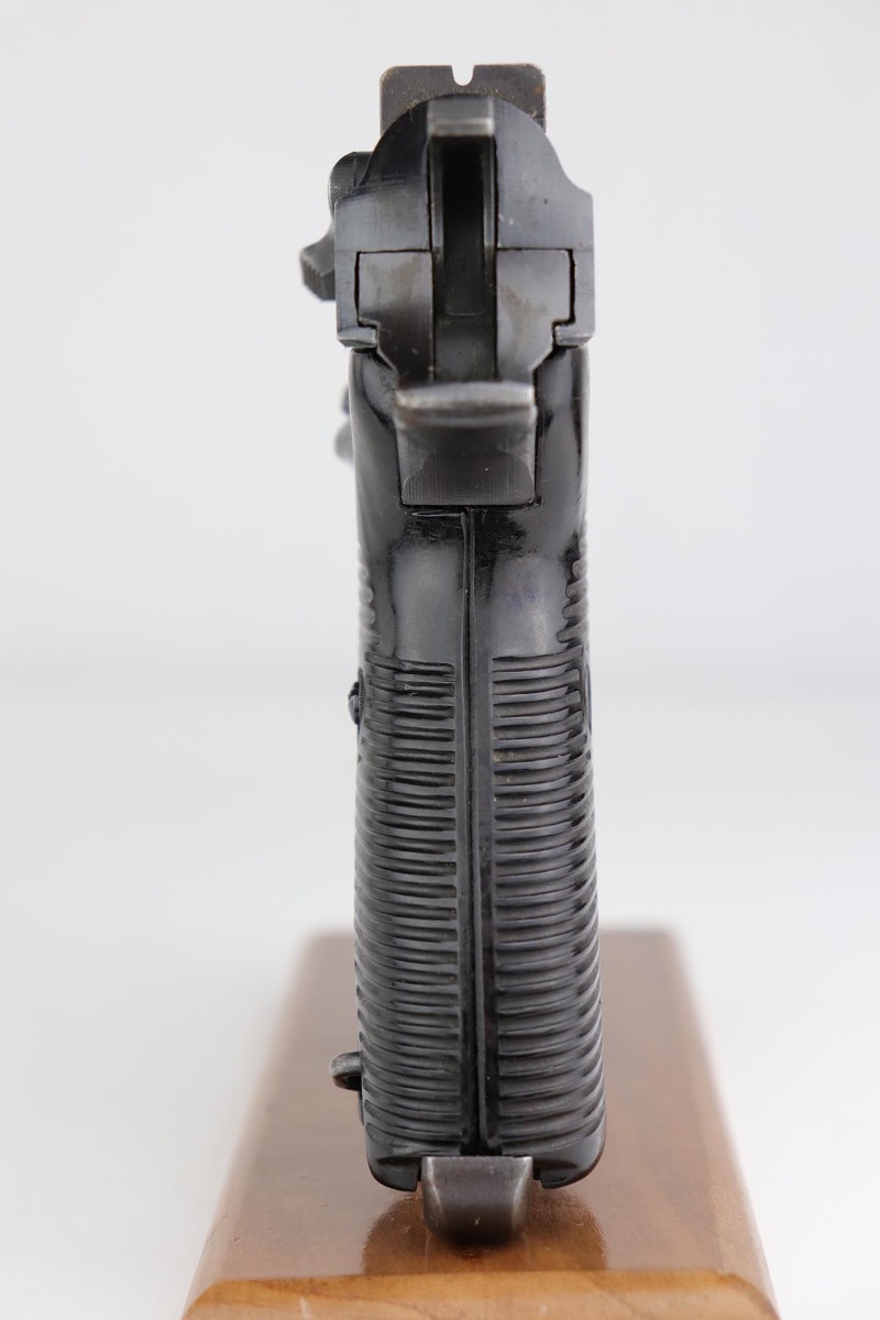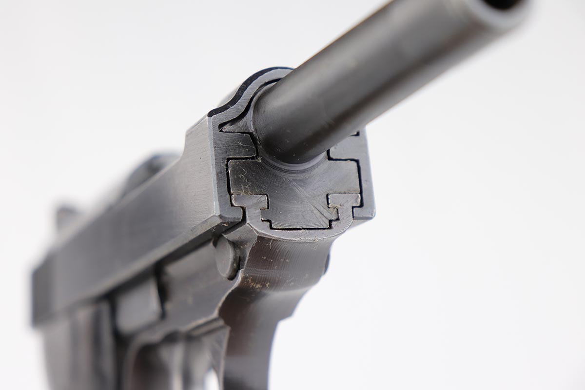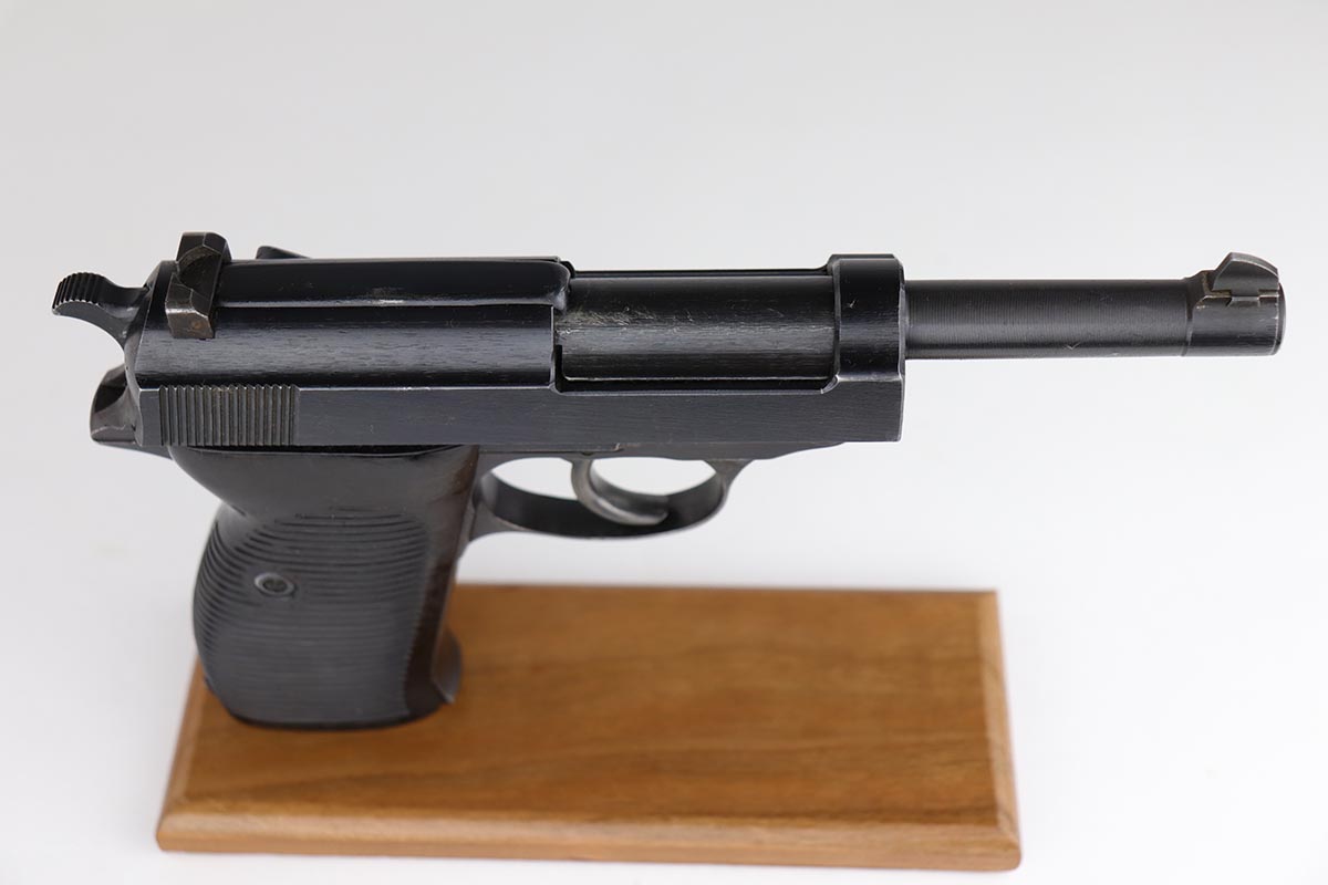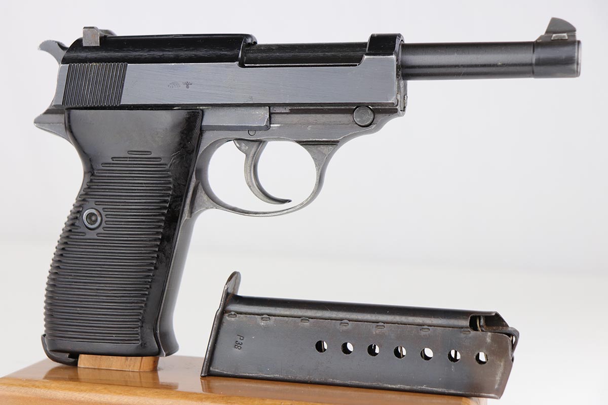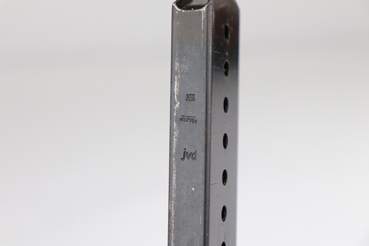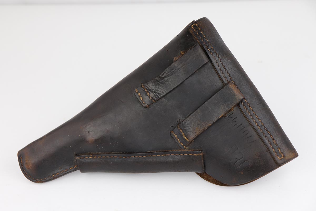 7/23/19 – This is an interesting, Nazi-issued P.38 from the end of the war. The frame is Walther made, while the slide and barrel are Mauser. But what makes this gun interesting is that the slide and barrel have no serial, and the slide did not receive the final inspection proof. Thus, the gun was likely put together from unissued parts at the end of the war, and this would help explain why the finish is in excellent condition and the bore is near-mint. Excellent brown grips, and the magazine has the Walther waffenamt, as well as ‘jvd’ and ‘WaA706’ proofs on spine. The de-cocker doesn’t work on this gun, though it does function as a safety. Mechanics are good otherwise. Pistol comes with a period original holster, which is 1944 dated on the back and GI embellished on the front flap.