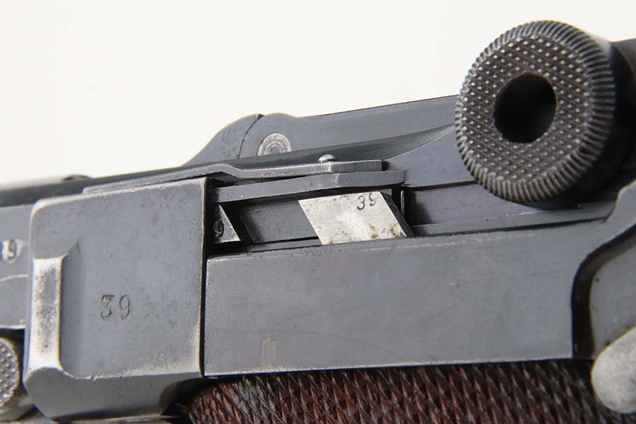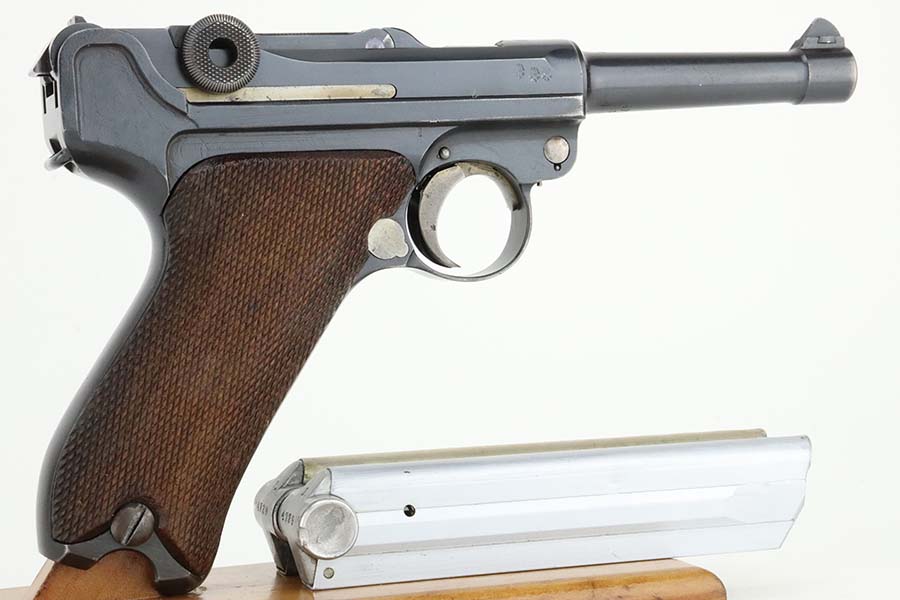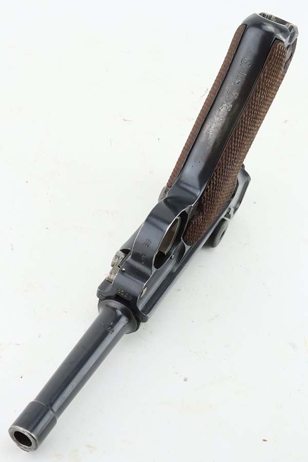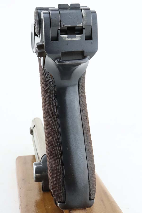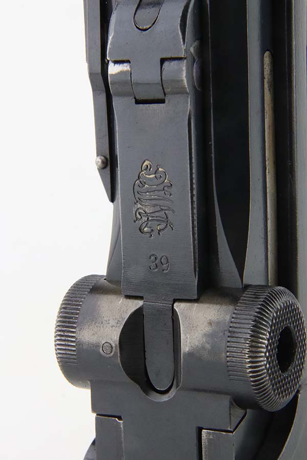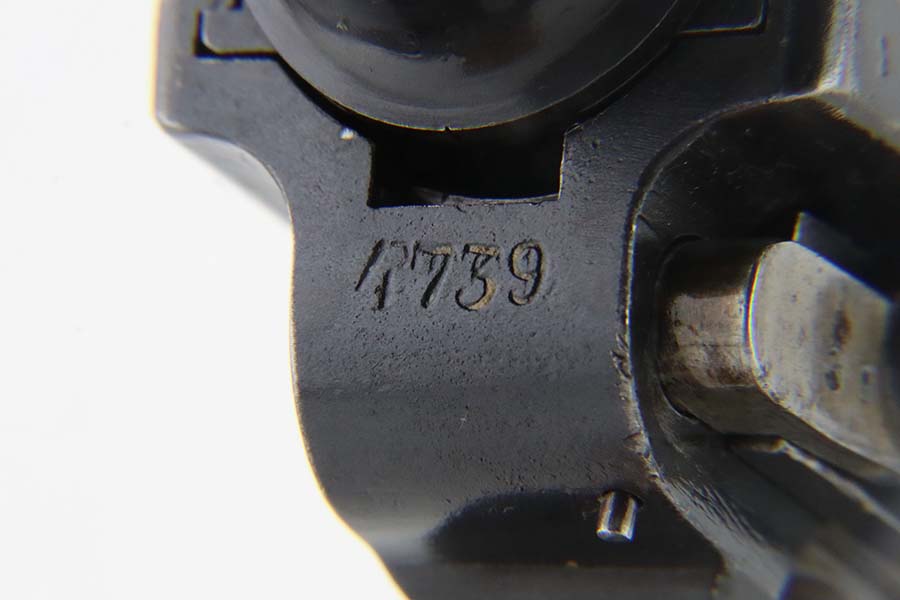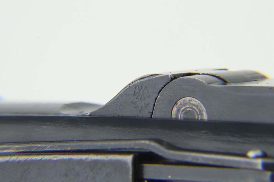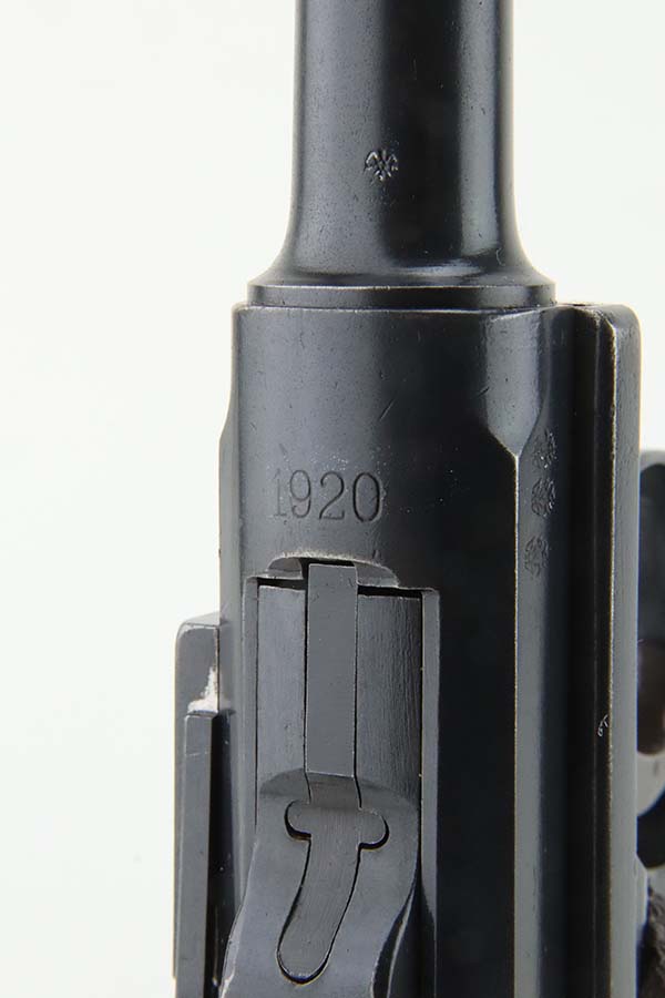 3/13/24 – This is a very interesting DWM Luger rig. It started its life as an early DWM commercial Luger, chambered in 9mm. It has early features, such as no stock lug and originally no hold open (one has since been added). It also has a 1920 date on the chamber. There is an added police sear safety and a unit marking on the front strap. There are Weimar-era Eagle proofs on the right side of the slide and an Austrian Eagle marking on the front edge of the trigger guard. It comes as a rig with two matching-numbered police-style magazines, an Imperial tool, and a holster that is 1918 dated with a “Crown I” marking. Fitted with un-numbered wood grips. The finish rates about 93% with general high edge wear, thinning on the front strap, and some minor pin-pricking on the side plate. The bore has good rifling, but there is light pin-pricking throughout.