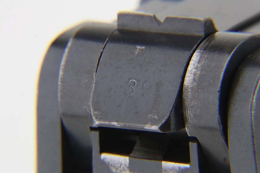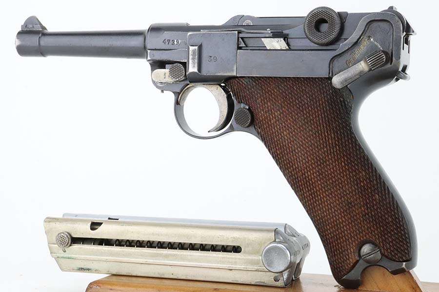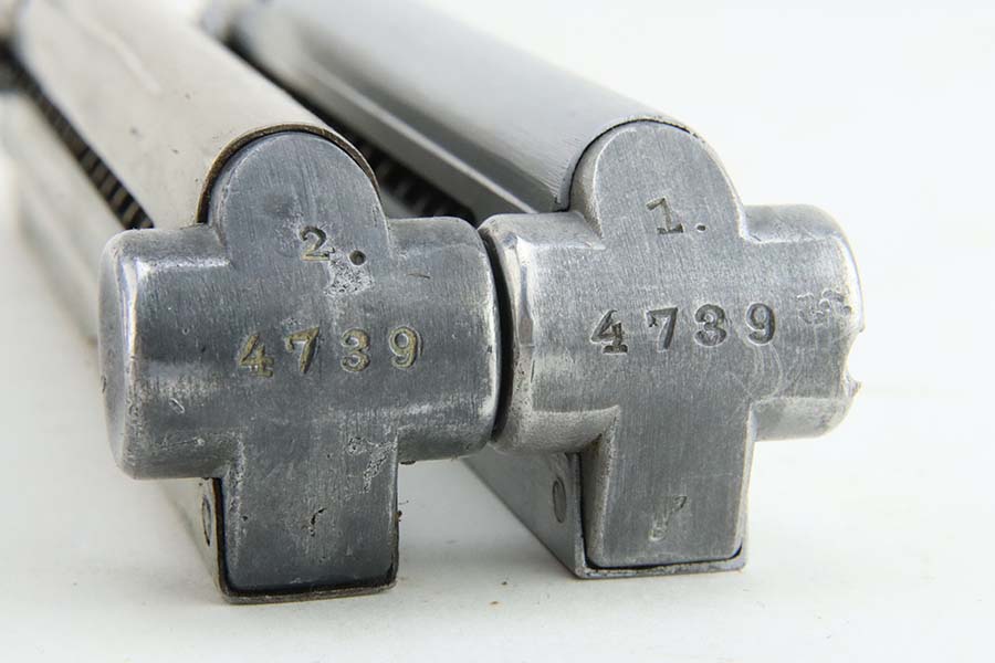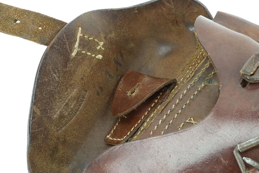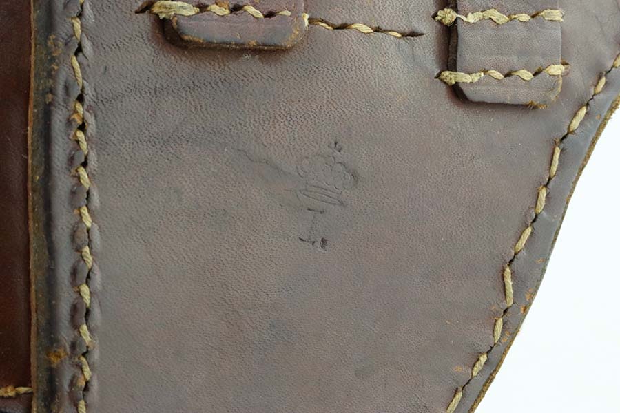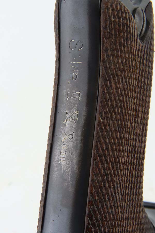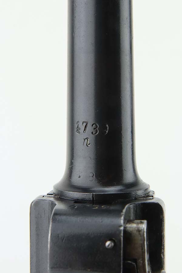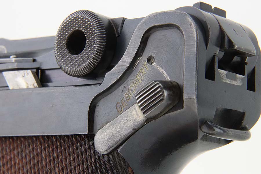 3/13/24 – This is a very interesting DWM Luger rig. It started its life as an early DWM commercial Luger, chambered in 9mm. It has early features, such as no stock lug and originally no hold open (one has since been added). It also has a 1920 date on the chamber. There is an added police sear safety and a unit marking on the front strap. There are Weimar-era Eagle proofs on the right side of the slide and an Austrian Eagle marking on the front edge of the trigger guard. It comes as a rig with two matching-numbered police-style magazines, an Imperial tool, and a holster that is 1918 dated with a “Crown I” marking. Fitted with un-numbered wood grips. The finish rates about 93% with general high edge wear, thinning on the front strap, and some minor pin-pricking on the side plate. The bore has good rifling, but there is light pin-pricking throughout.
