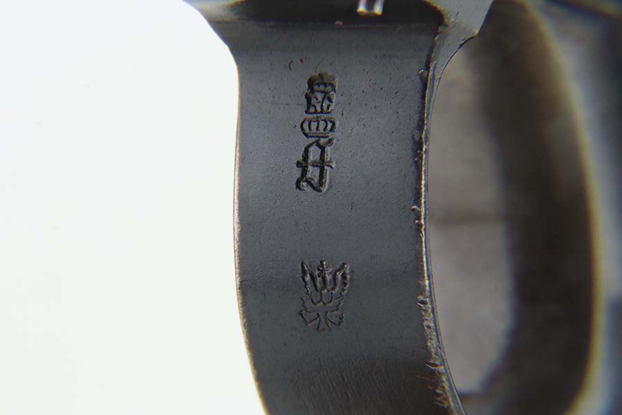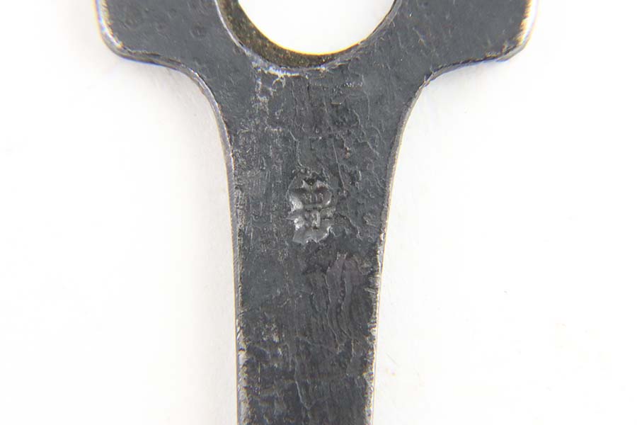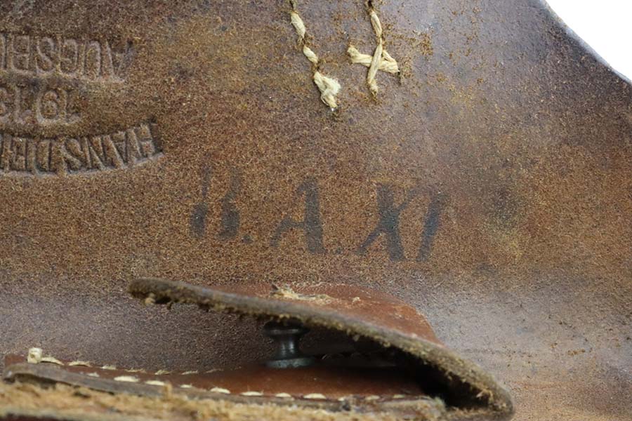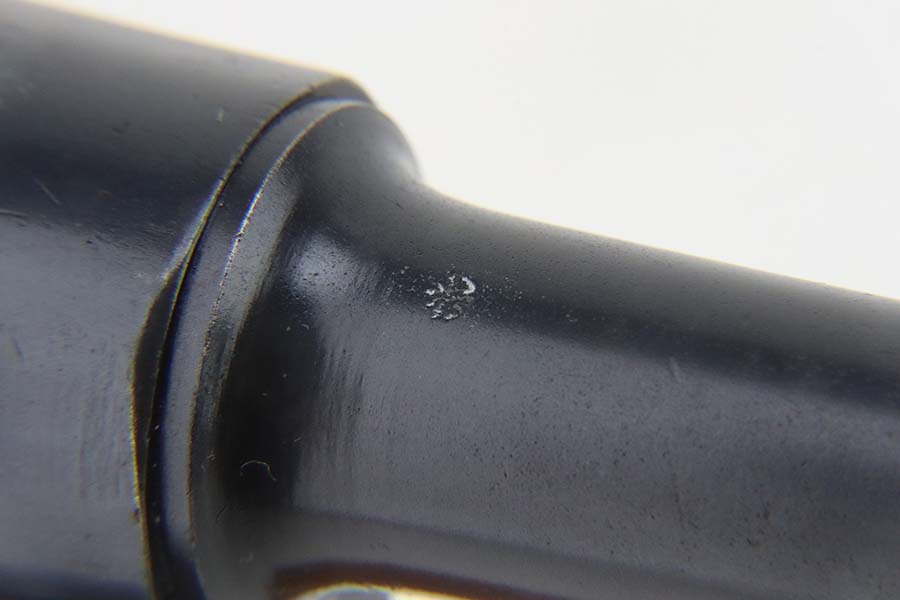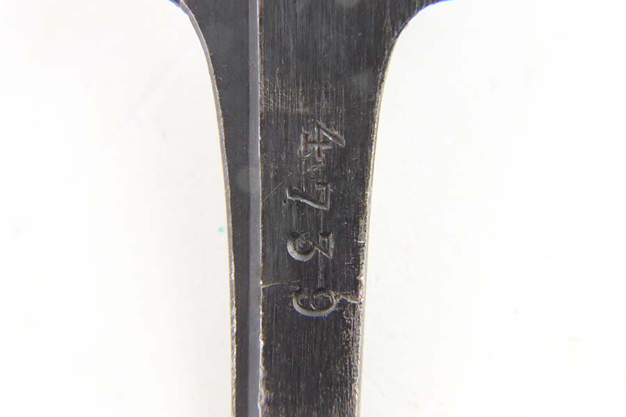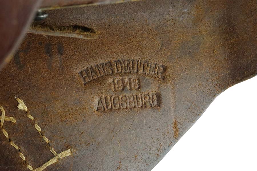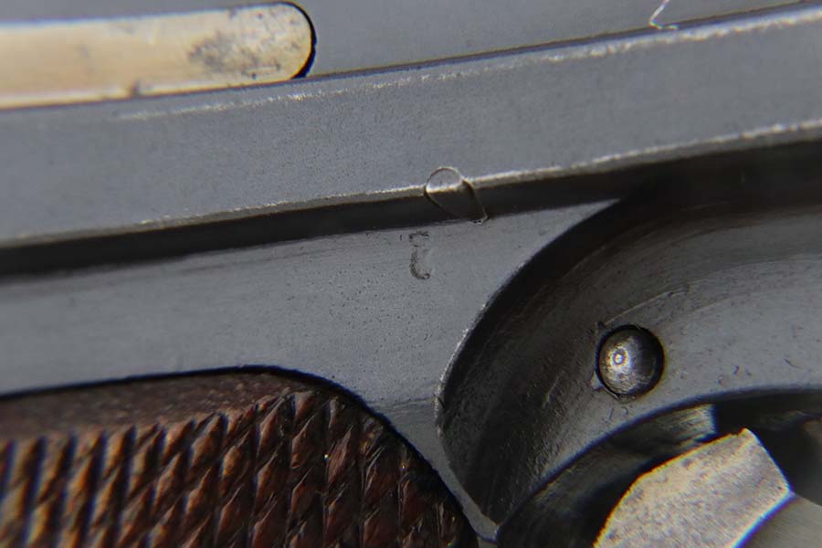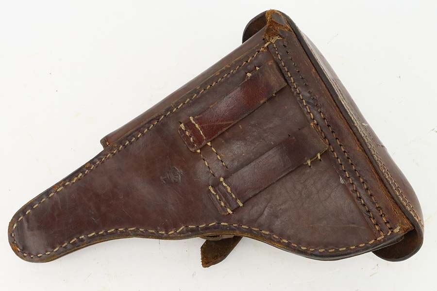 3/13/24 – This is a very interesting DWM Luger rig. It started its life as an early DWM commercial Luger, chambered in 9mm. It has early features, such as no stock lug and originally no hold open (one has since been added). It also has a 1920 date on the chamber. There is an added police sear safety and a unit marking on the front strap. There are Weimar-era Eagle proofs on the right side of the slide and an Austrian Eagle marking on the front edge of the trigger guard. It comes as a rig with two matching-numbered police-style magazines, an Imperial tool, and a holster that is 1918 dated with a “Crown I” marking. Fitted with un-numbered wood grips. The finish rates about 93% with general high edge wear, thinning on the front strap, and some minor pin-pricking on the side plate. The bore has good rifling, but there is light pin-pricking throughout.