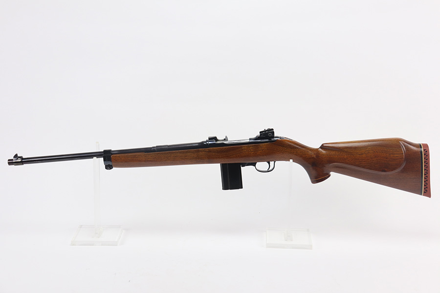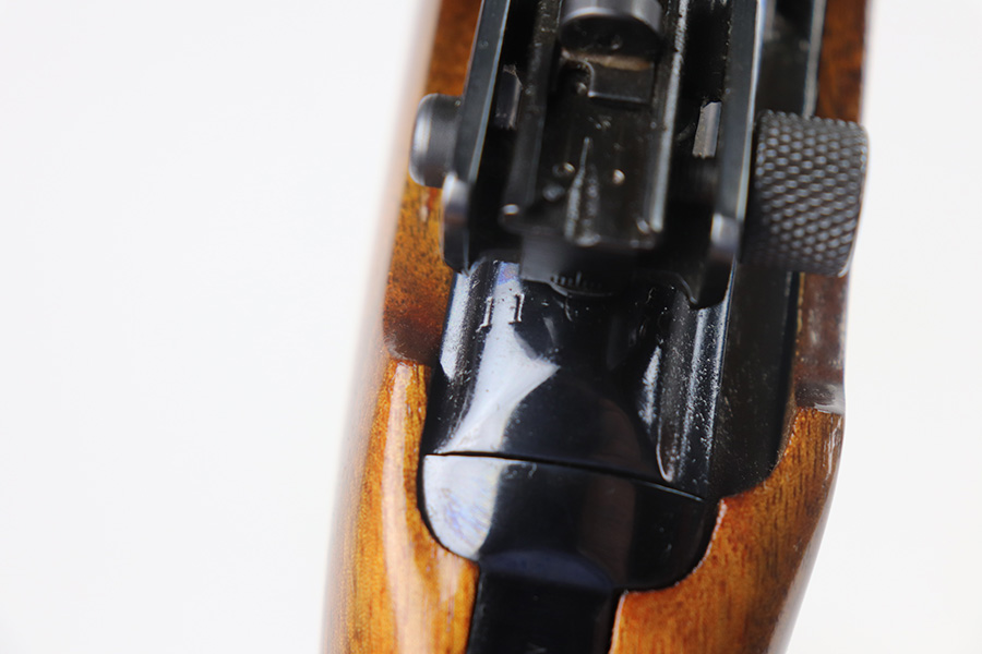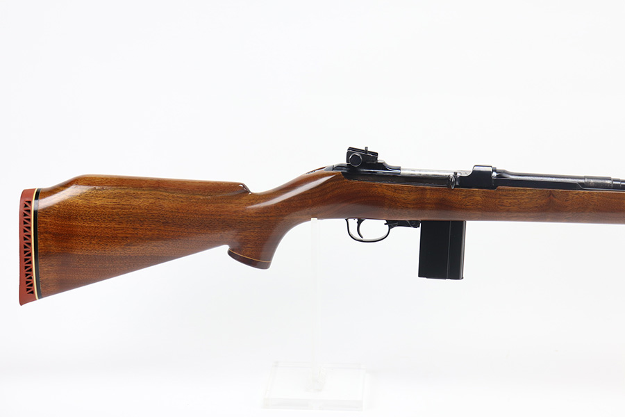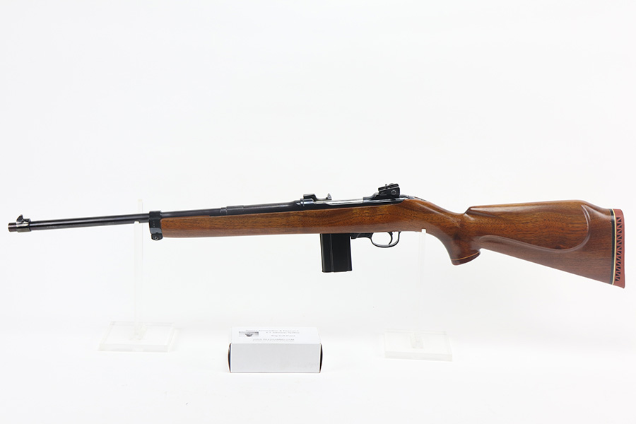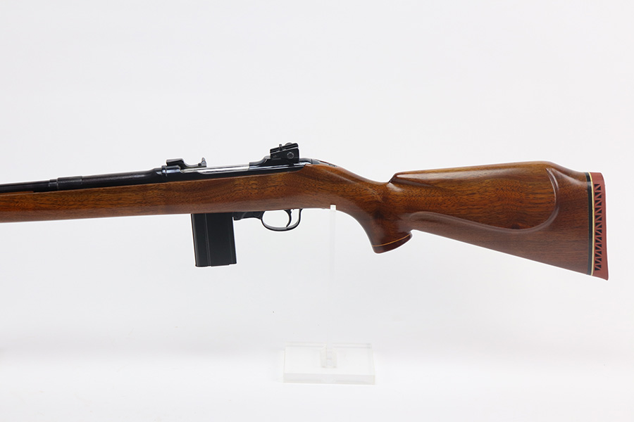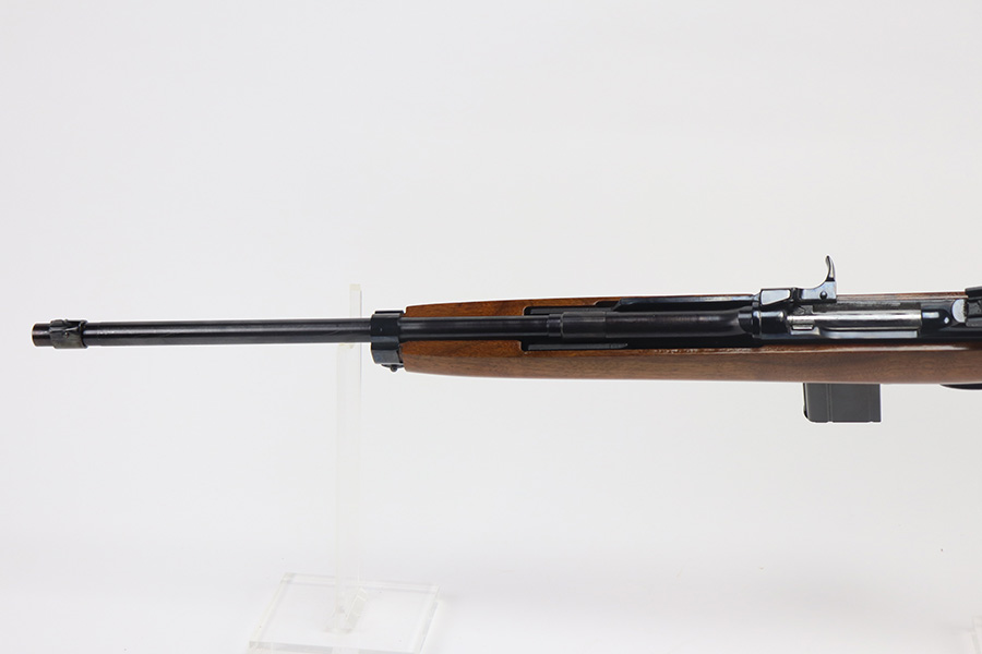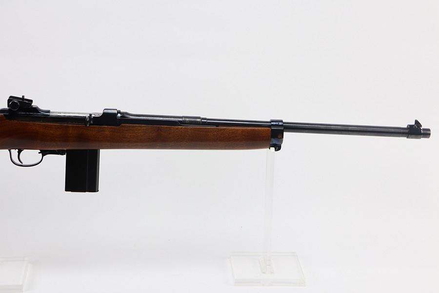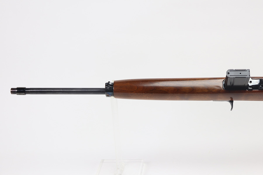 The handguard is not present, since the barrel band flange was trimmed off. The milled rear sight is staked in, with a commercial-style front sight. The receiver, barrel and exposed parts are highly polished and blued. The bolt is plated. Bore is excellent and shiny, and the barrel is not marked. A 5.7J round fits snugly in the chamber but this was not test-fired. The internal parts are a mixture of manufacturers as expected with markings as follows: Trigger housing (*U*), trigger (ROCK-OLA), hammer (LT-Q), bolt (*U*), firing pin (R.I.), extractor (*U*), op-rod (DA-Q). An aftermarket Korean-made magazine and a 50-round box of fresh 5.7 Johnson ammunition is included. Since the 5.7 Johnson is a necked-down .30 carbine cartridge, standard M1 carbine magazines are used. The 5.7 conversion was conceived by Melvin Johnson (Johnson Automatics) in the early 1960’s. Several companies picked up the torch later in the 1960’s and 1970’s. The origin of this conversion is unknown.