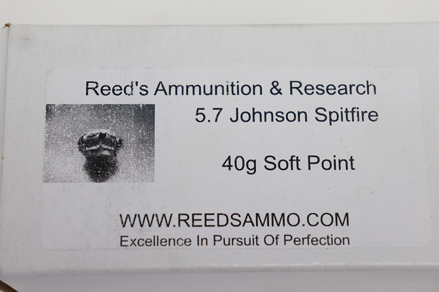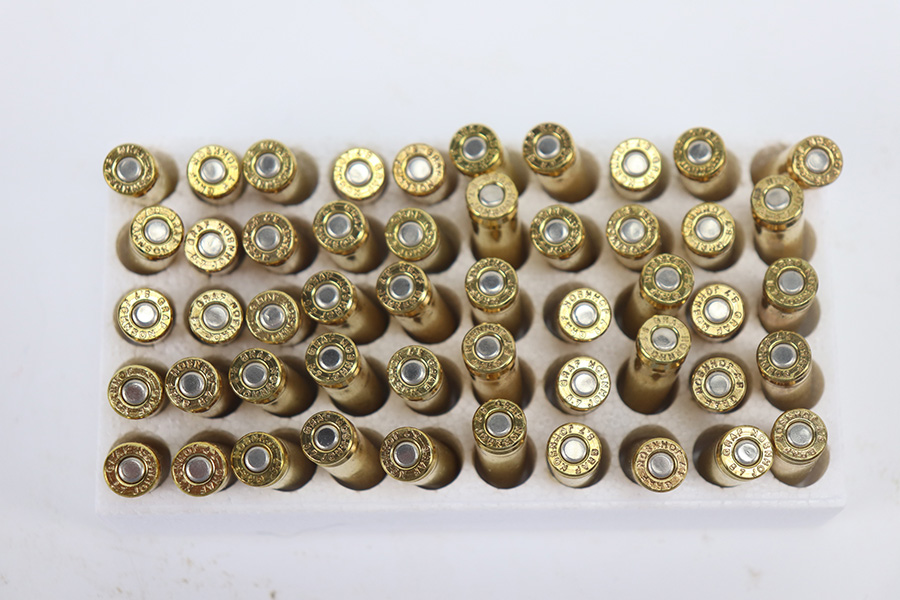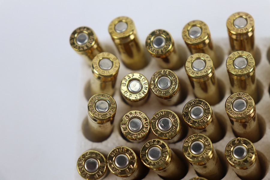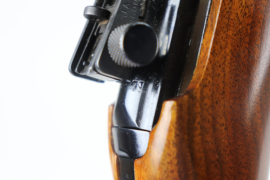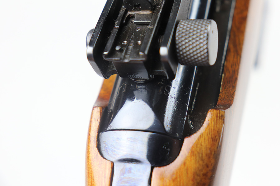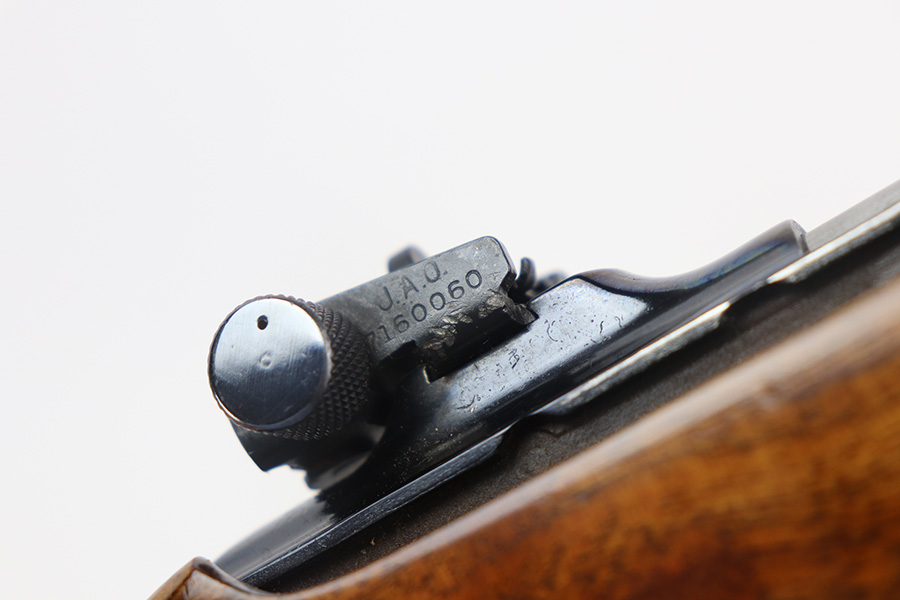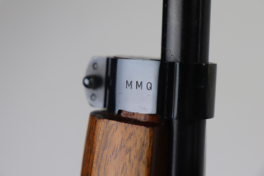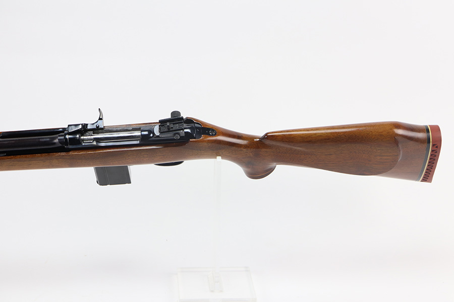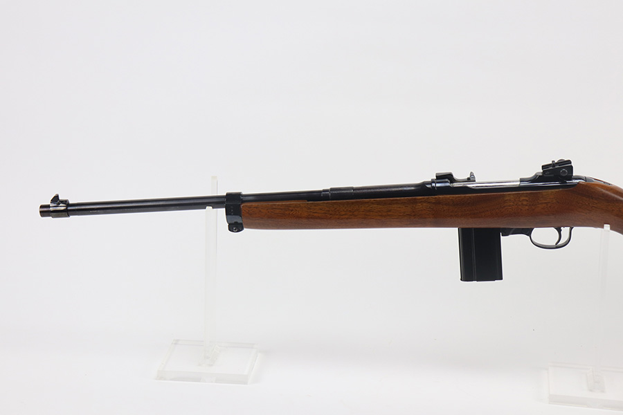 The handguard is not present, since the barrel band flange was trimmed off. The milled rear sight is staked in, with a commercial-style front sight. The receiver, barrel and exposed parts are highly polished and blued. The bolt is plated. Bore is excellent and shiny, and the barrel is not marked. A 5.7J round fits snugly in the chamber but this was not test-fired. The internal parts are a mixture of manufacturers as expected with markings as follows: Trigger housing (*U*), trigger (ROCK-OLA), hammer (LT-Q), bolt (*U*), firing pin (R.I.), extractor (*U*), op-rod (DA-Q). An aftermarket Korean-made magazine and a 50-round box of fresh 5.7 Johnson ammunition is included. Since the 5.7 Johnson is a necked-down .30 carbine cartridge, standard M1 carbine magazines are used. The 5.7 conversion was conceived by Melvin Johnson (Johnson Automatics) in the early 1960’s. Several companies picked up the torch later in the 1960’s and 1970’s. The origin of this conversion is unknown.