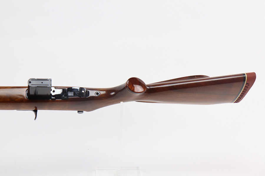 6/18/21 – This is an interesting and early Winchester M1 Carbine that has been sporterized and re-barreled in what appears to be 5.7 Johnson, also known as .22 Spitfire. The “sporter” stock is nicely varnished and free of cracks, and has a Pachmayr recoil pad.