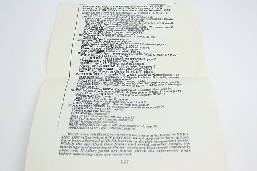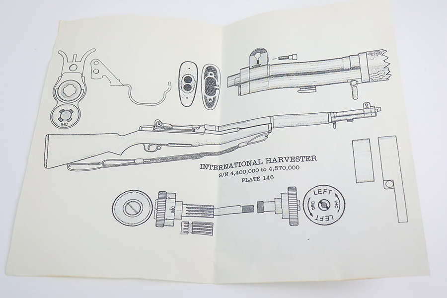 6/8/22 – This is a very nice example of an International Harvester M1 Garand manufactured in 1952-53. It has an LMR barrel that is dated January of 1953 and has a cross-cannon military cartouche. The barrel and op rod are “NM” or National Match marked. DOD stamp on the stock. Overall, the gun is in very nice condition. Very minor thinning and areas of spotty discoloration on the receiver. Some thinning along the barrel and gas tube. The stock is excellent with only minor bruises here and there and some light scuffing around the grip. Mint bore. Muzzle reading : 2. Throat reading: 4. Comes with a couple of papers: a parts list and diagram.