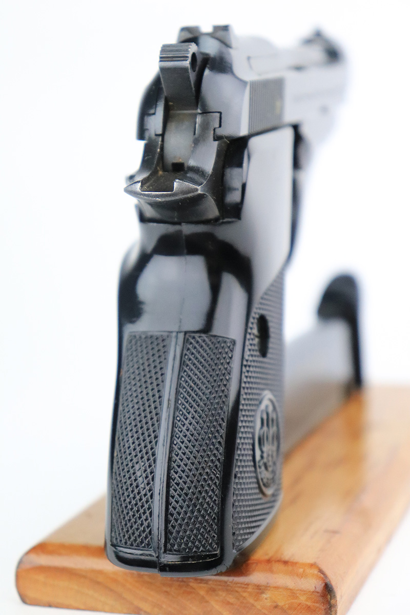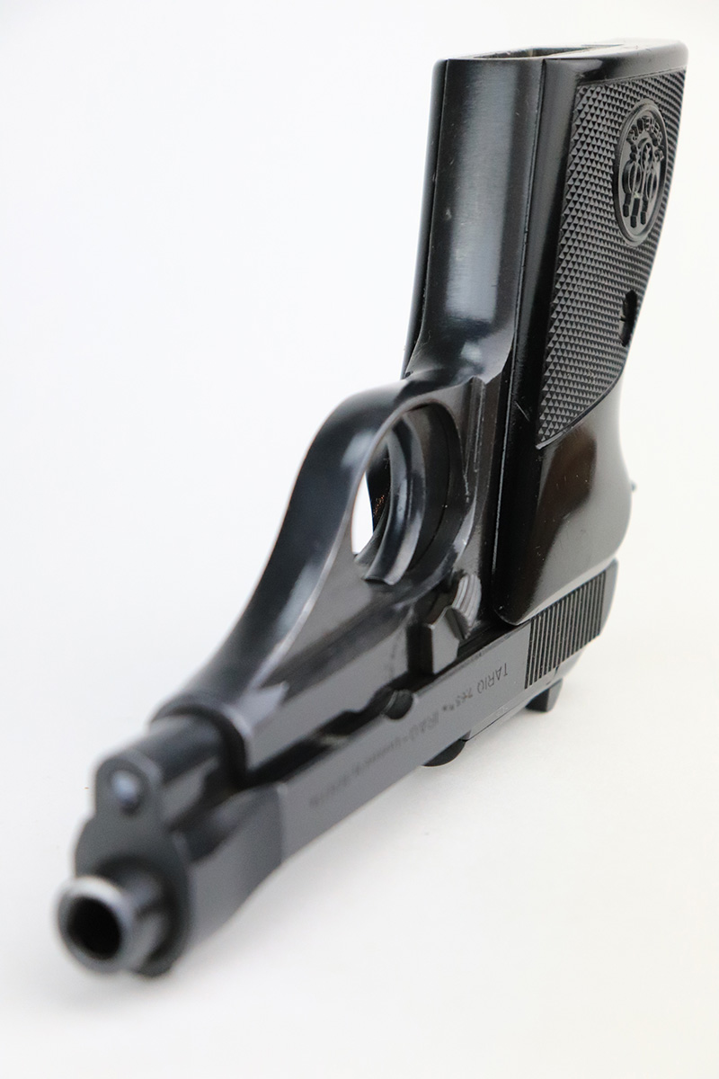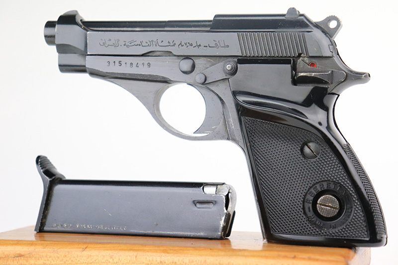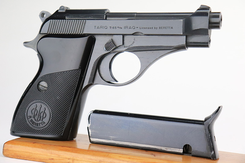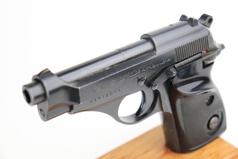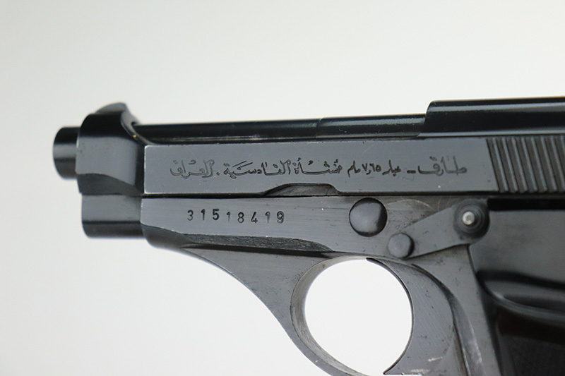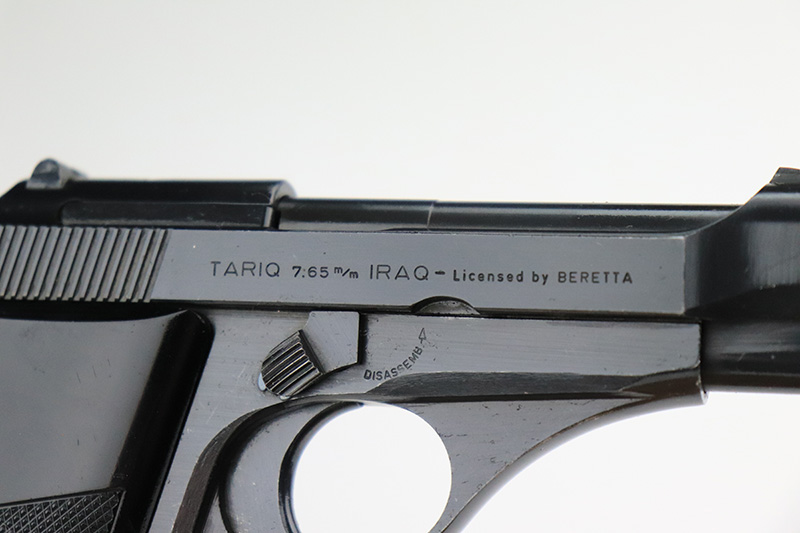 11/19/22 – This is a very rare Iraqi Tariq pistol made by Al-Qadisiyyah Establishments likely in the 1980’s. It is a license-built copy of the original Beretta Model 70 and is chambered in 7.65mm. It was a standard issue handgun in service with Iraqi armed forces and the Republican Guard. This one also comes as a rig with one proper magazine and a very rare holster – from the inscription on the top flap, this was an honorary gift from the President and leader, Saddam Hussein. The holster is in minty condition except for what looks like some dried adhesive on the top flap and around the closure strap. The gun has retained virtually all of its finish with hints of wear on the high edges and a few tiny handling marks here and there. Comes with excellent commercial Beretta grips. Mint bore.