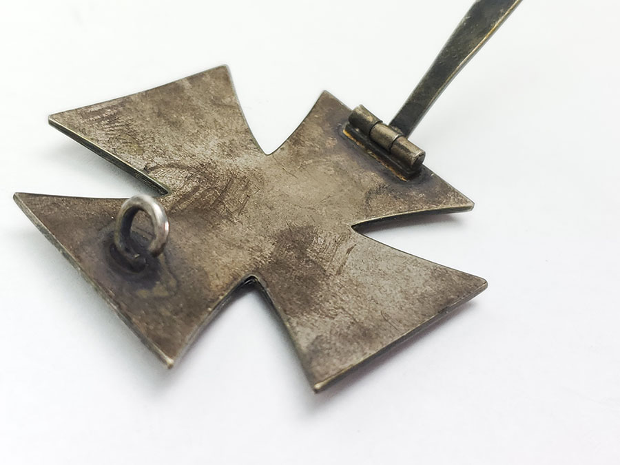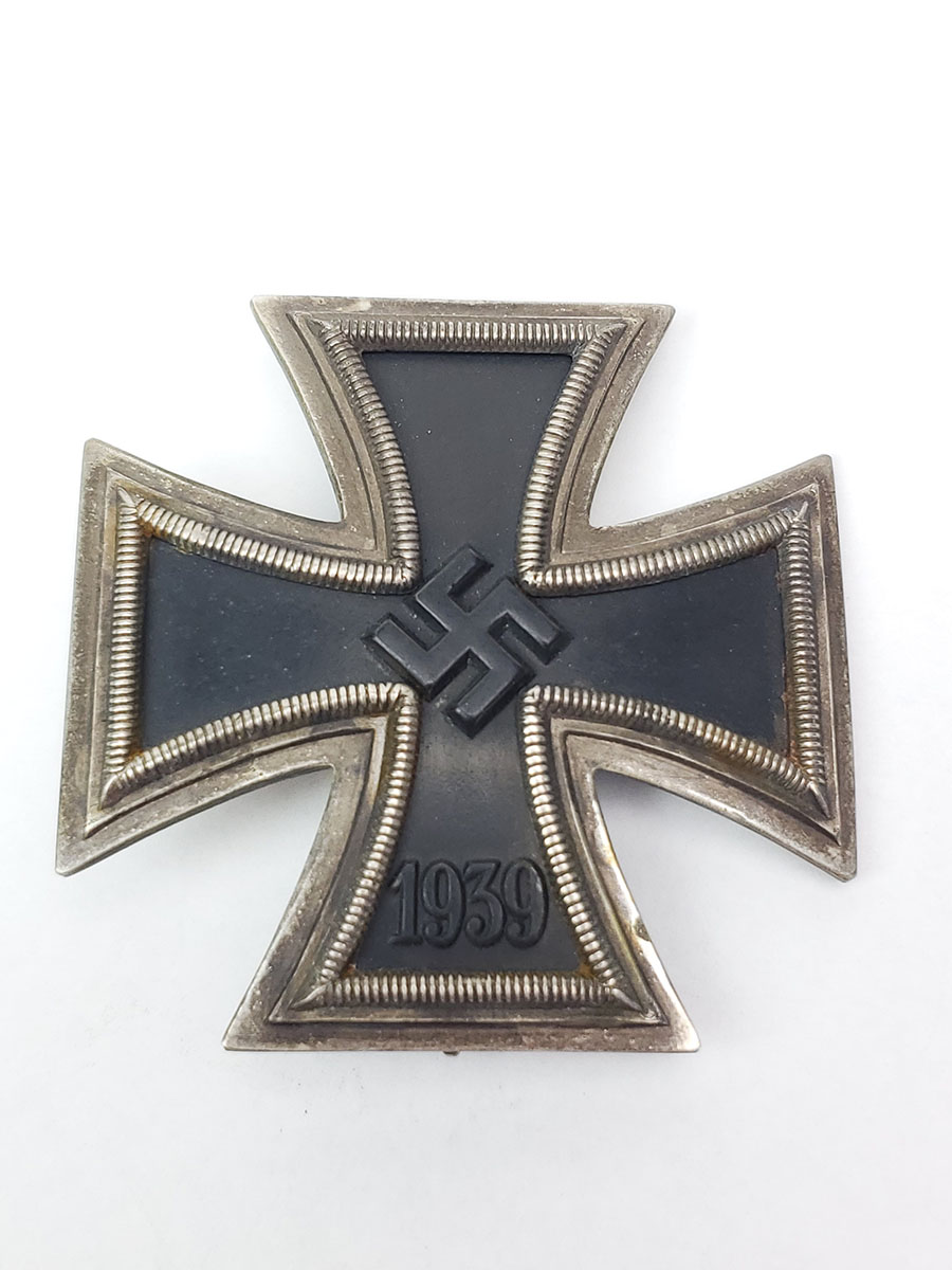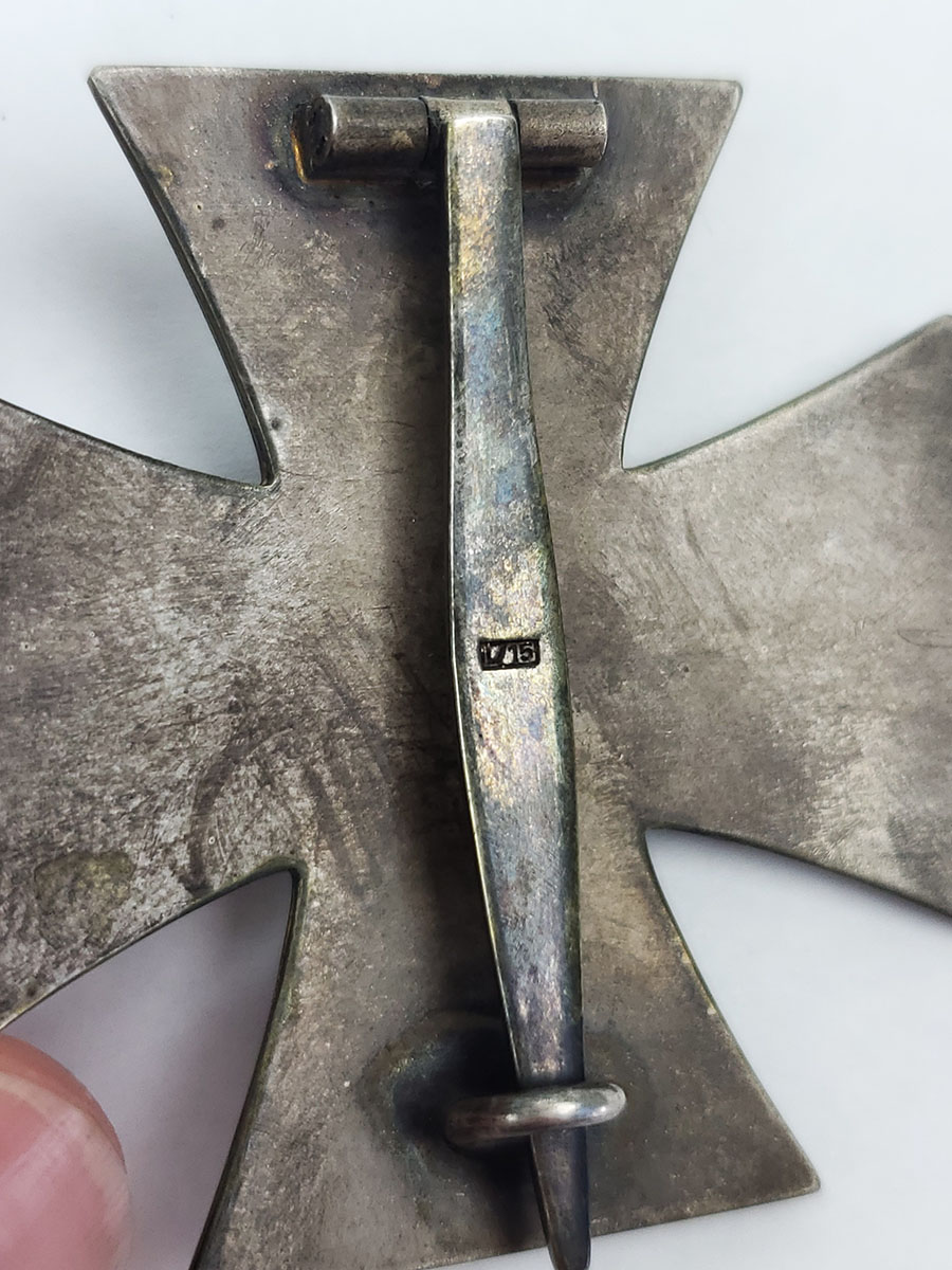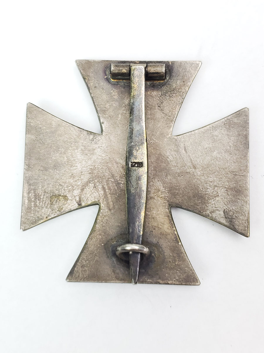 8/6/20 – This is an excellent Iron cross, 1st class medal. Constructed of silver and has an iron core. 3 piece construction. Some mild, expected patina and nicely vaulted. Reverse verticle pinback is stamped “L/15” for Otto Schinkle, Pforzheim.