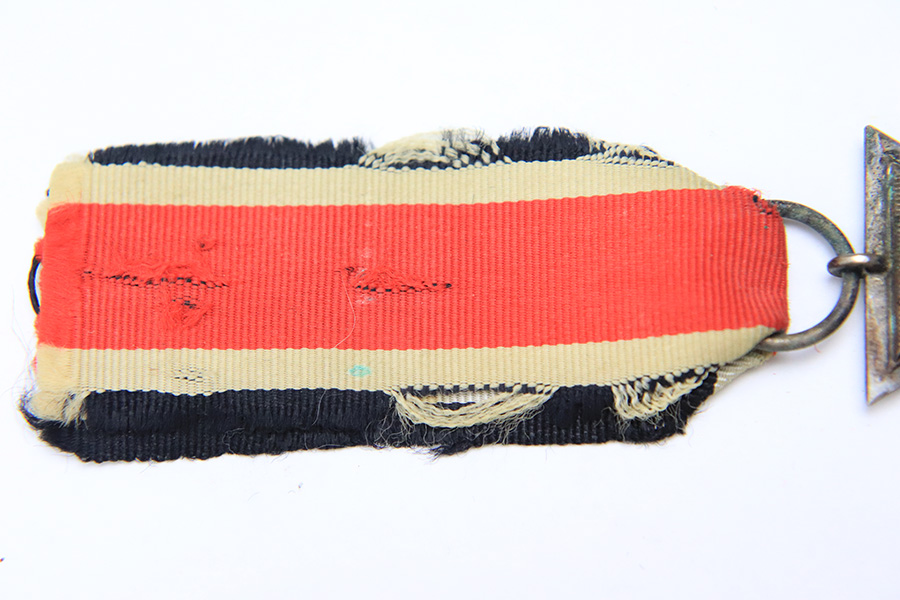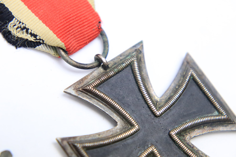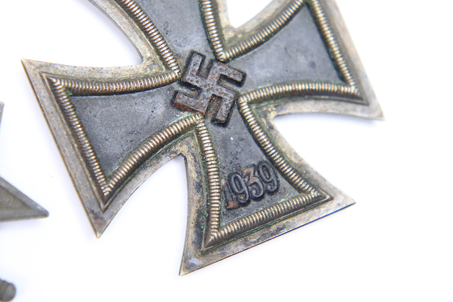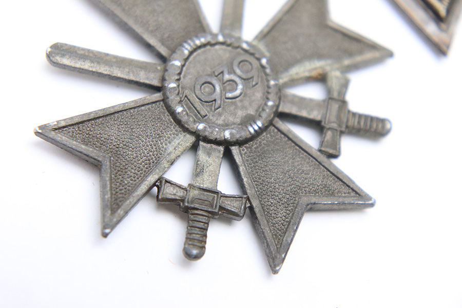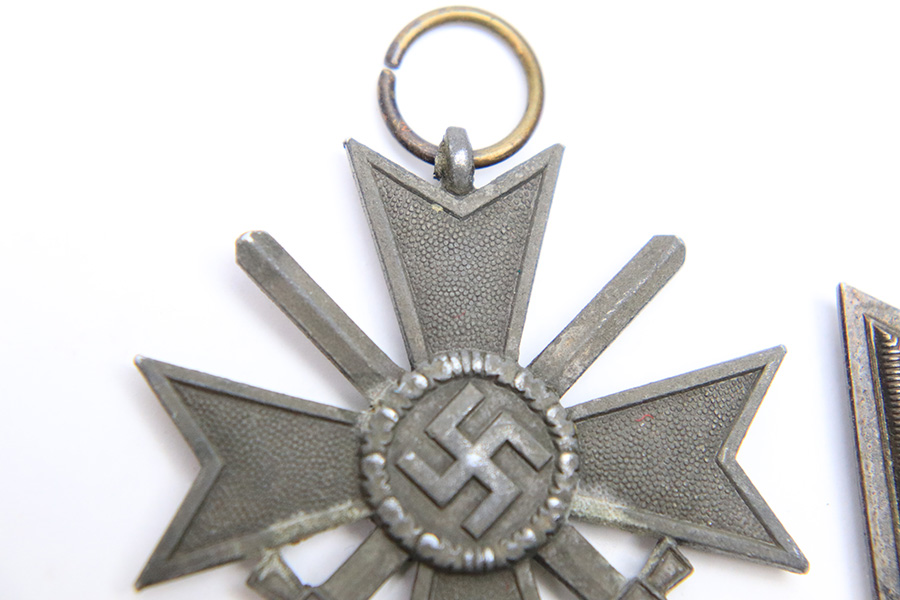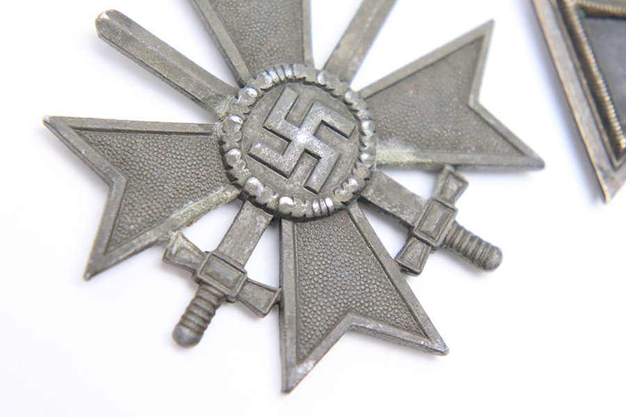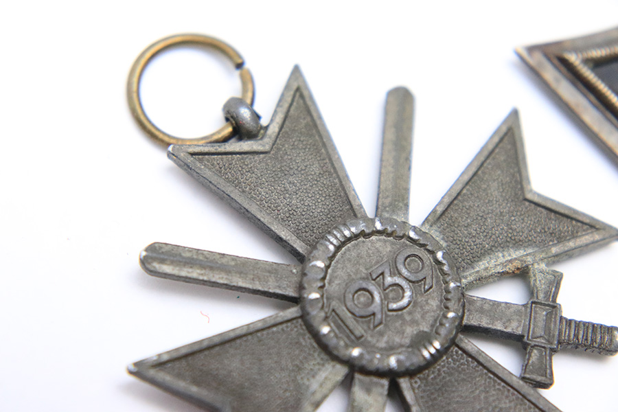 12/1/22 – This is an original WW2 German Merit Cross with Swords, paired with an Iron Cross 2nd Class. The iron cross has some surface patina on the swastika and along the edges of the award. The outer border has typical aging patina throughout as well. The metal has a magnetic core, and comes with an attached ribbon in good condition, but there are some tattered areas as shown. The merit cross has some mild surface patina and typical aging throughout. There’s also some discoloration around the wreath area as shown. The merit cross is non-magnetic throughout.
