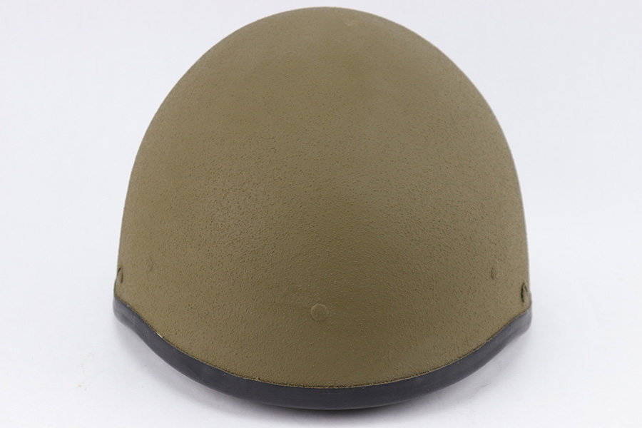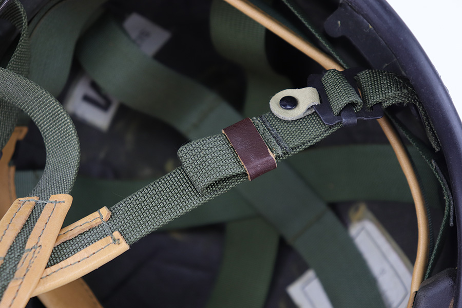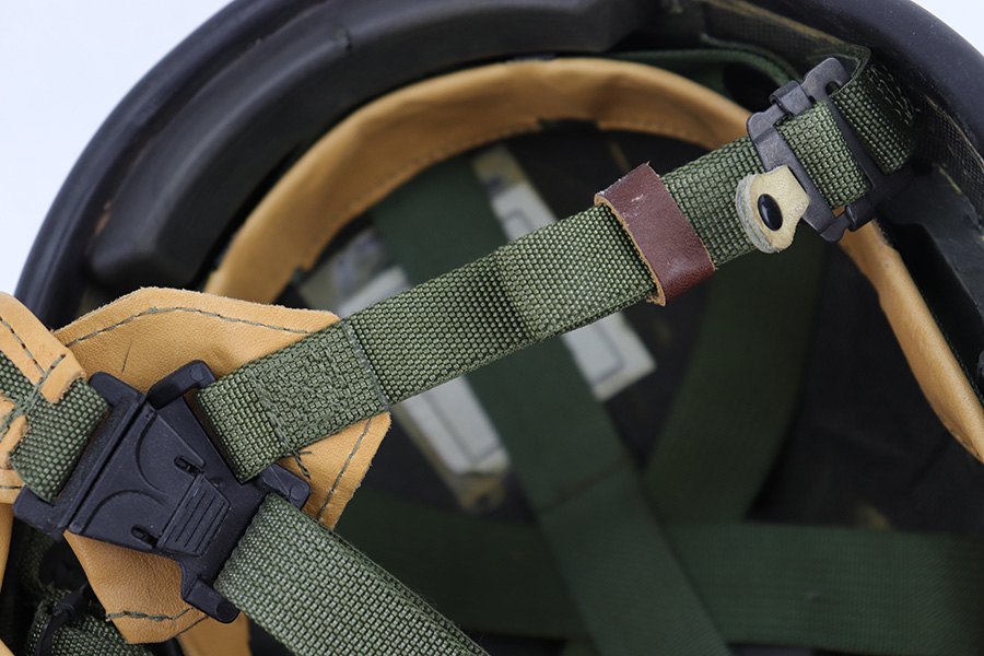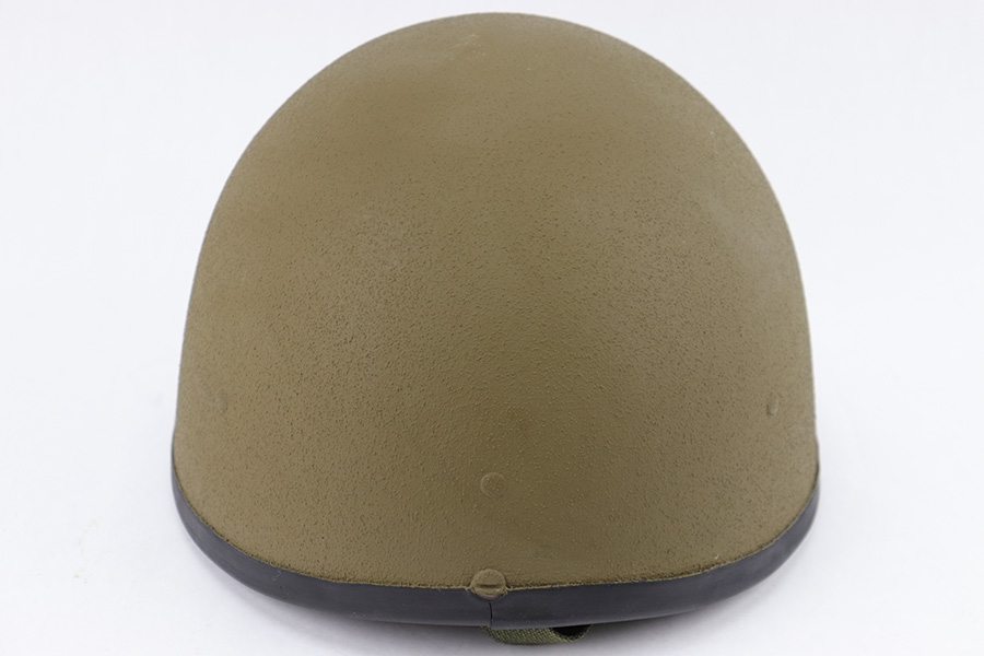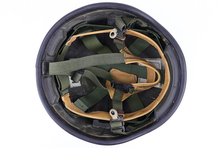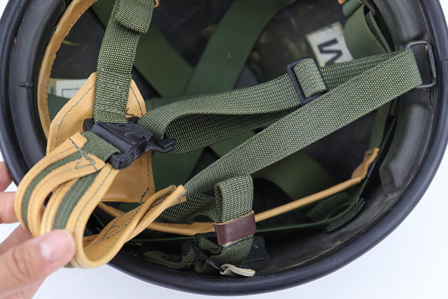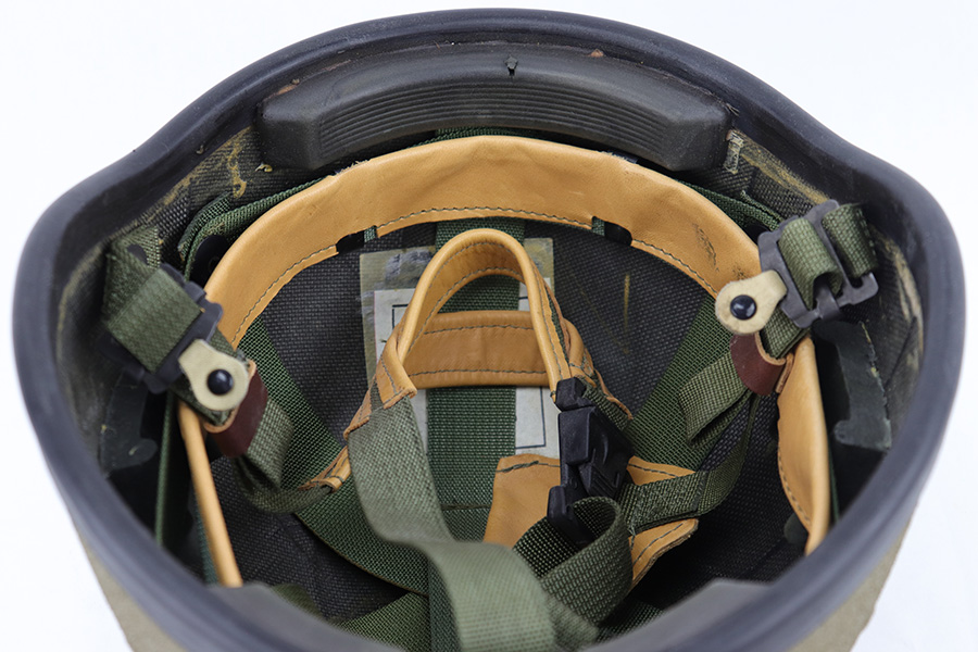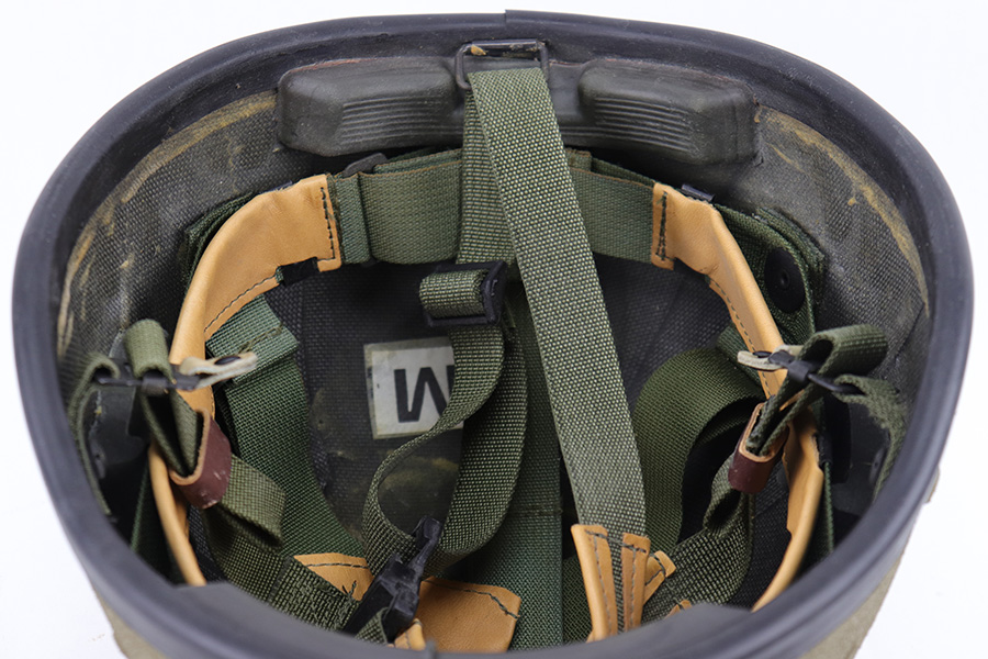7/19/23 – This is an original Israeli Military M76 helmet. Excellent condition and marked size “M” for medium. The helmet has clean, excellent olive green paint on the exterior shell and only a very small spot of wear near the crown. Black rubber rim is very clean as well. The interior liner is mostly canvas and leather materials with soft rubber padding and the front and back. Can be adjusted and tightened for best fit. Original chinstrap is intact as well. Both original labels are clean and securely attached. A very nice example.
