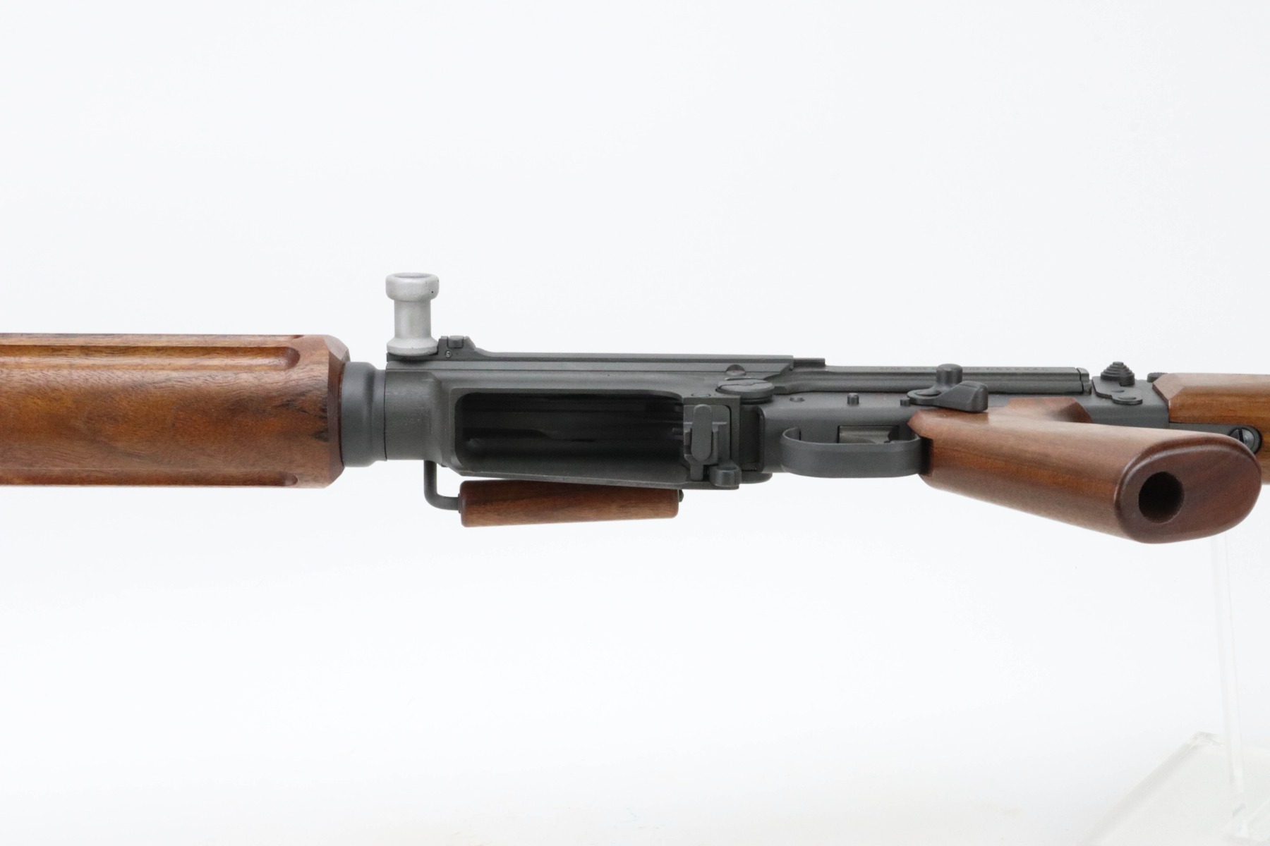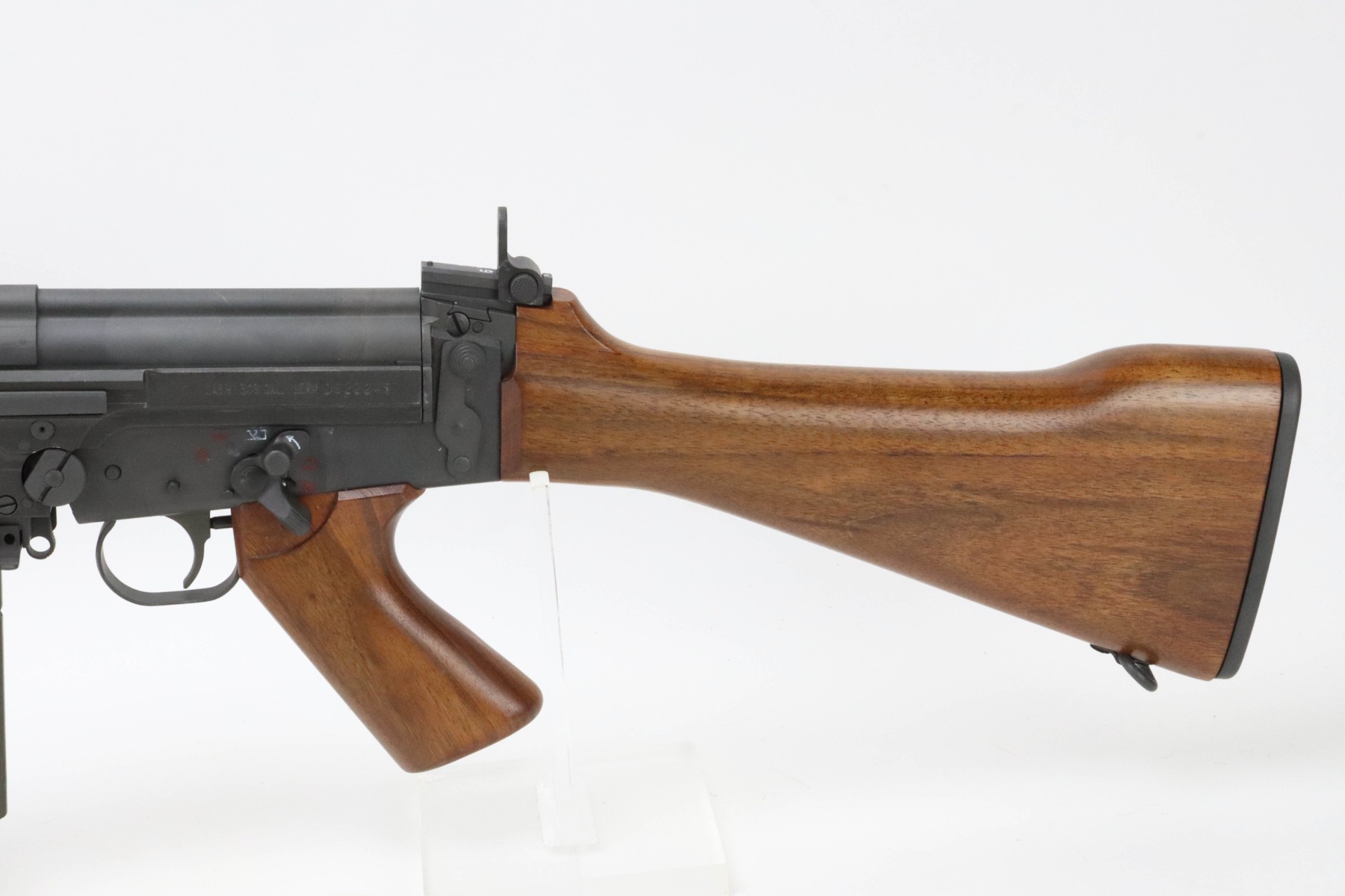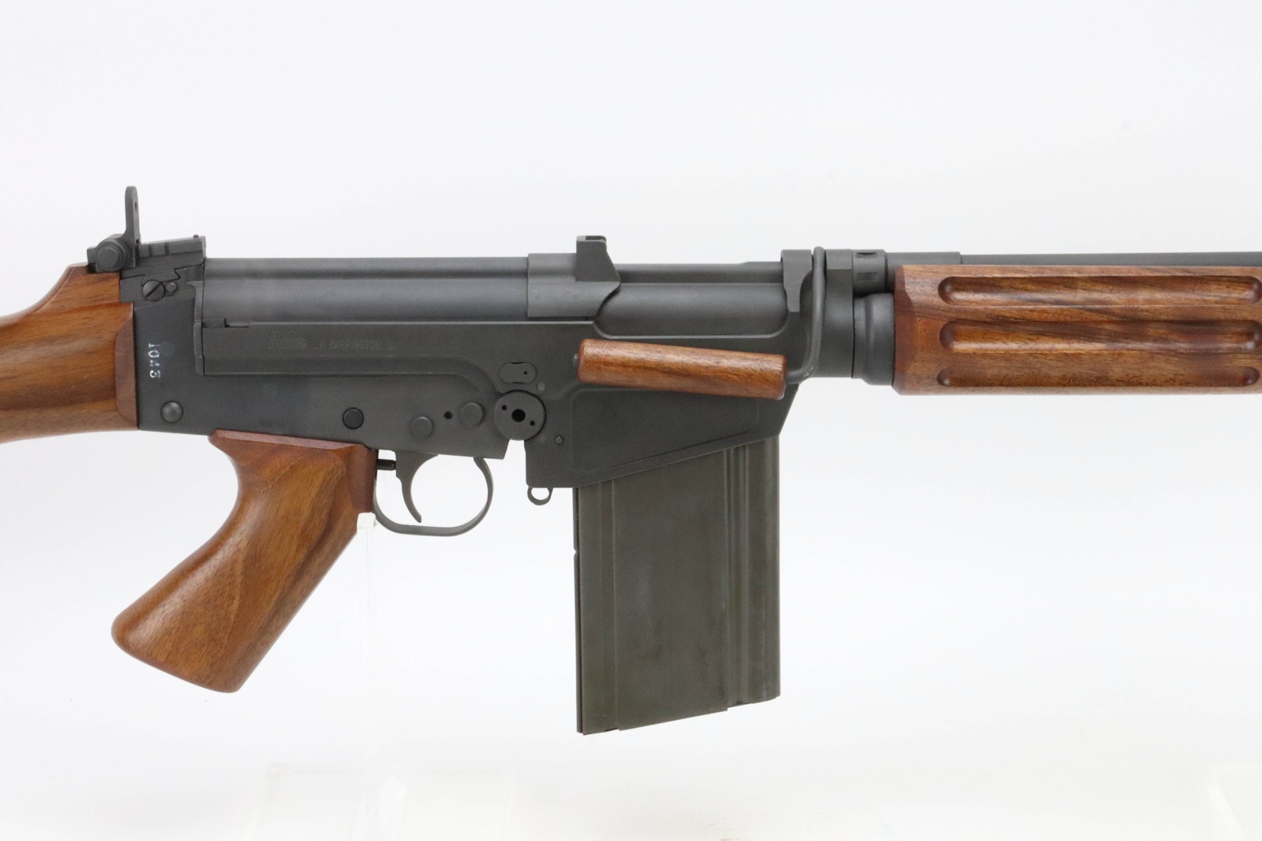 08/23/2024 – For sale is an FAL assembled by Arizona Response Systems using a DSA receiver. The rifle uses a barrel from a light-barrel Israeli Trials rifle with a Type A lower that has both Hebrew and Belgian Selector markers. The handguard is a reproduction of a T48 style, has a Type A Buttstock and an Israeli FA Selector switch. The barrel is made by FN and has a bayo lug and is uncut. The gas block is high open ear and has an early-style gas plug with long piston. Has an open loop/ring style magazine catch lever and a Belgian bolt and carrier that is not cut for a forward assist. The top cover is a rare style that has the ears for loading with a stripper clip.