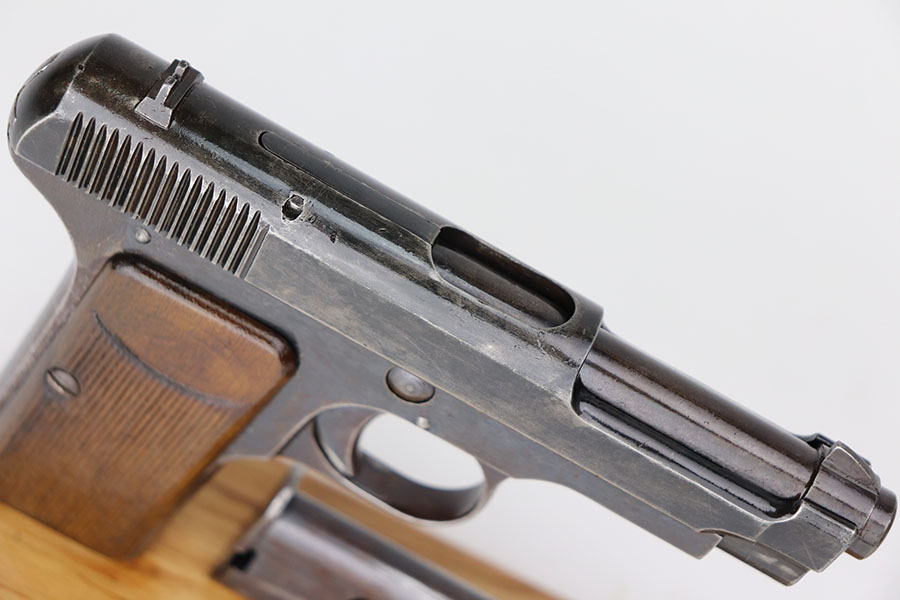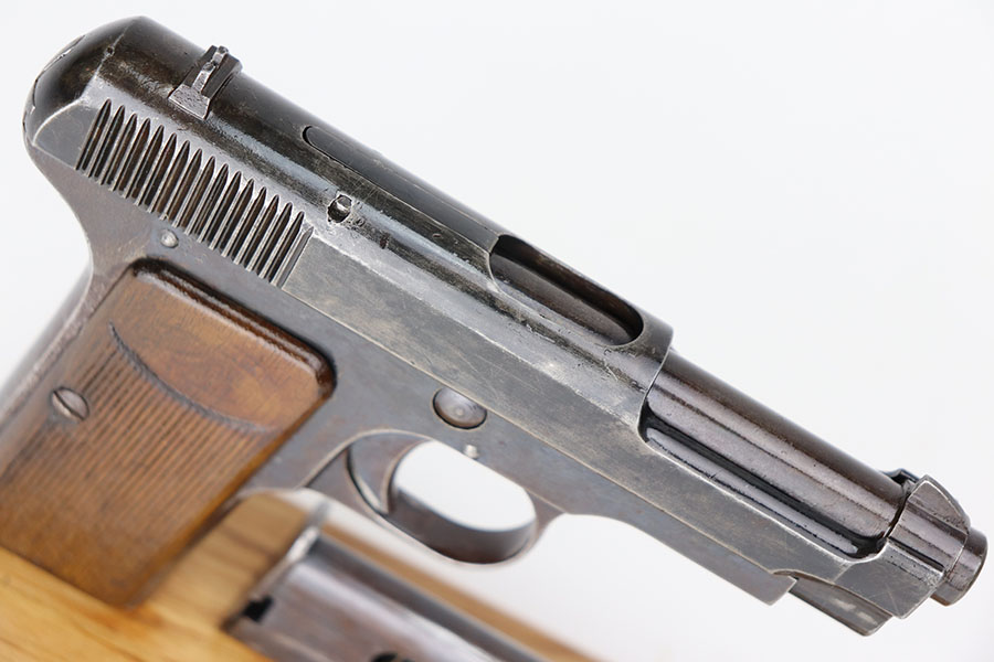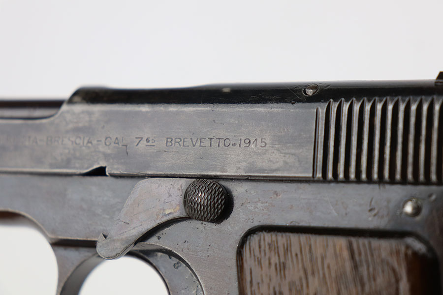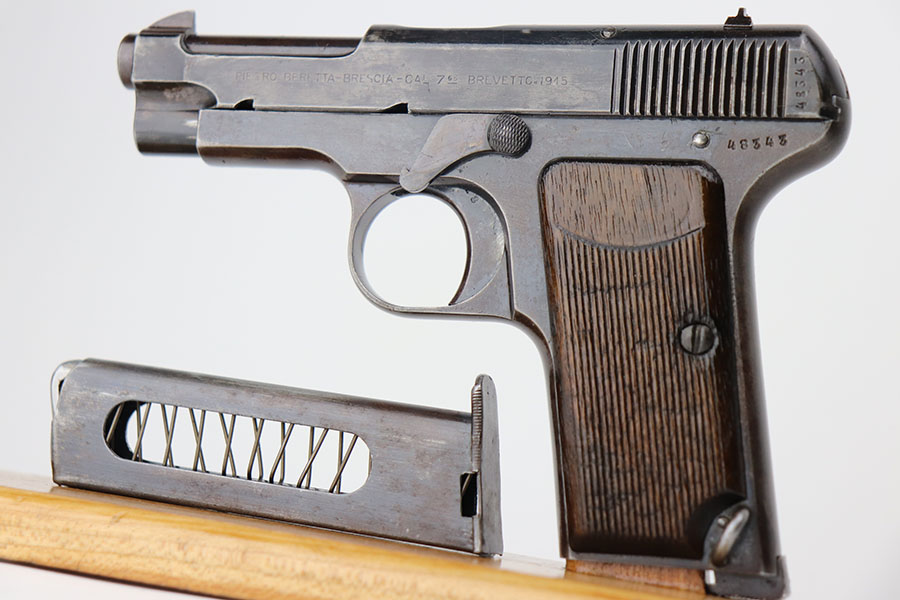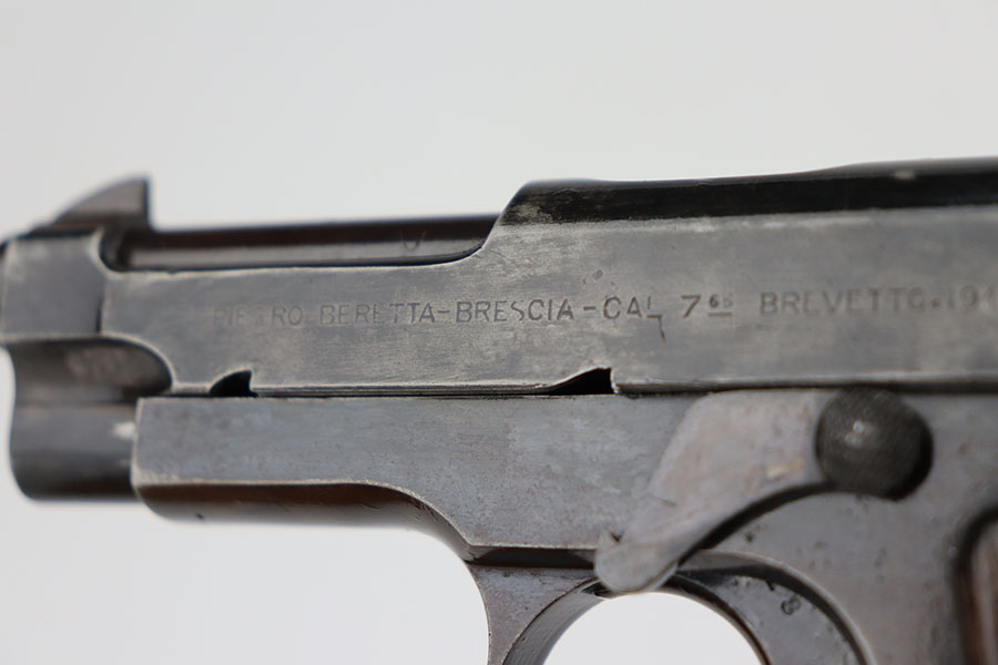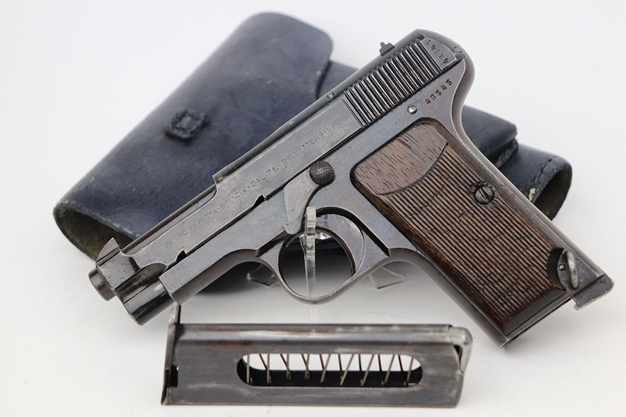 4/7/21 – This is a nice example of a Beretta Model 1915/17 issued to the Italian Army during WW1. Its predecessor is the Model 1915. They made a few changes to the original Model 1915 to make the 1915/17. These changes included chambering the gun in 7.65mm to reduce the bulk of the 9mm, and they removed the hammer safety on the tang. They produced about 15,000 of the 9mm version then picked up with 7.65mm production until about SN 60,000. This one comes with a blue-ish holster and a proper magazine. The gun is matching and has retained about 85% of its finish. There is spotty wear on the straps, underside of the frame and on the slide throughout. There is spotty brown patina throughout. There are some areas of the slide that may have been touched up with cold blue. Comes with relatively worn wood grips. The bore has heavy oxidation and pitting throughout.
