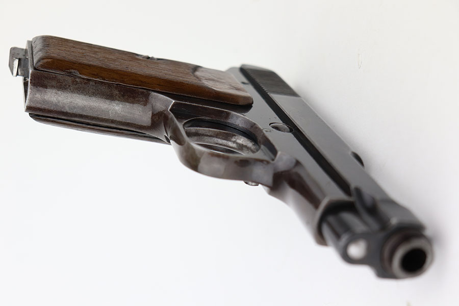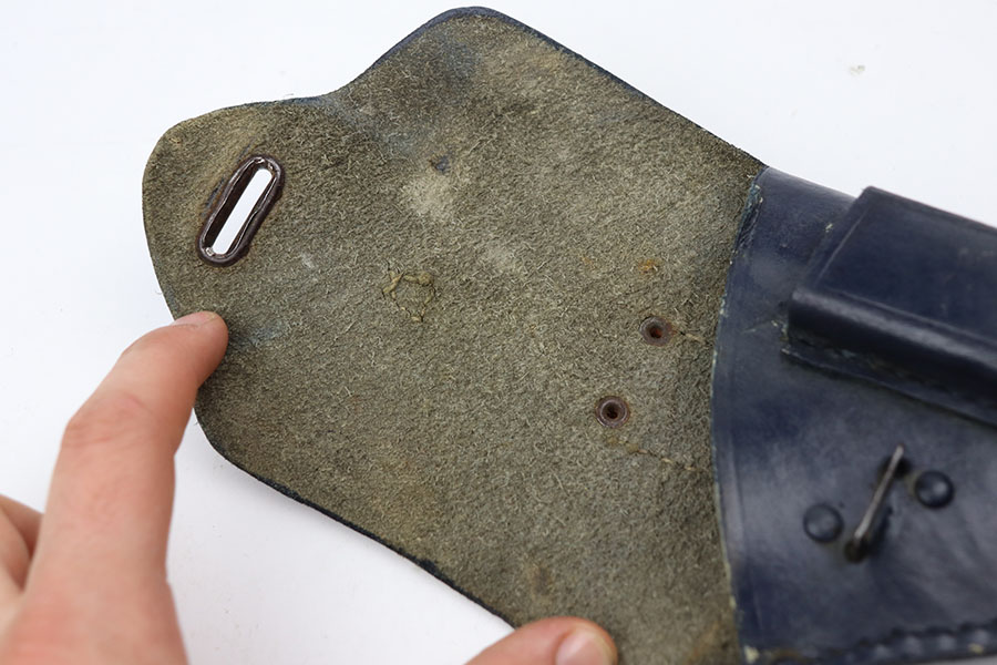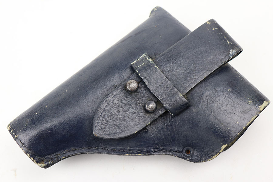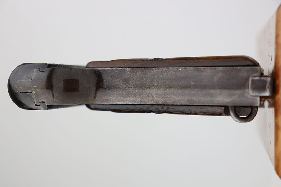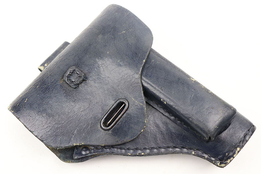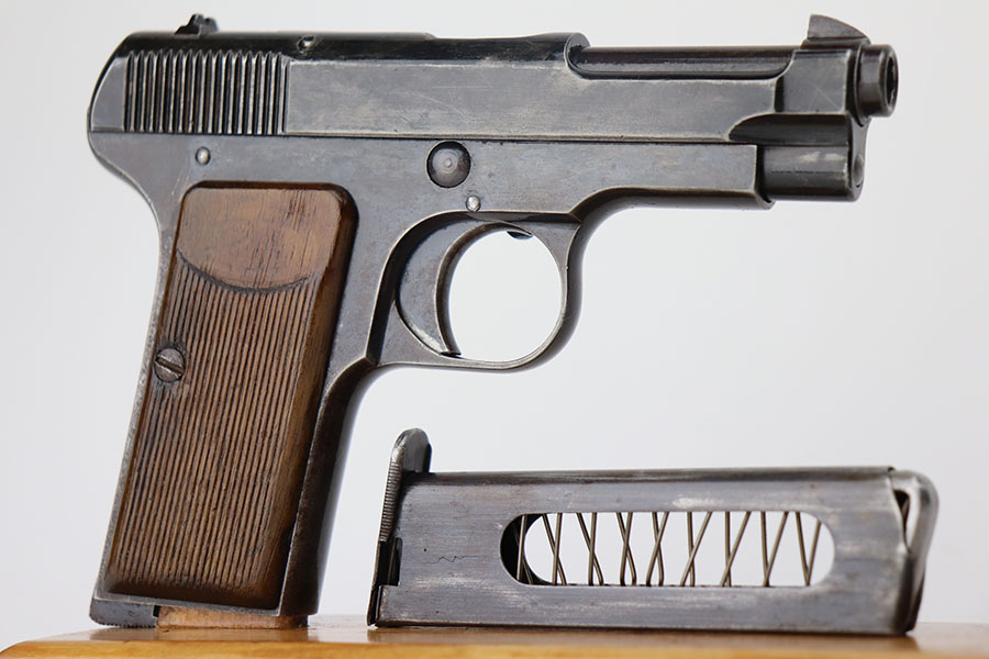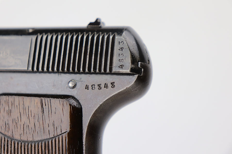 4/7/21 – This is a nice example of a Beretta Model 1915/17 issued to the Italian Army during WW1. Its predecessor is the Model 1915. They made a few changes to the original Model 1915 to make the 1915/17. These changes included chambering the gun in 7.65mm to reduce the bulk of the 9mm, and they removed the hammer safety on the tang. They produced about 15,000 of the 9mm version then picked up with 7.65mm production until about SN 60,000. This one comes with a blue-ish holster and a proper magazine. The gun is matching and has retained about 85% of its finish. There is spotty wear on the straps, underside of the frame and on the slide throughout. There is spotty brown patina throughout. There are some areas of the slide that may have been touched up with cold blue. Comes with relatively worn wood grips. The bore has heavy oxidation and pitting throughout.
