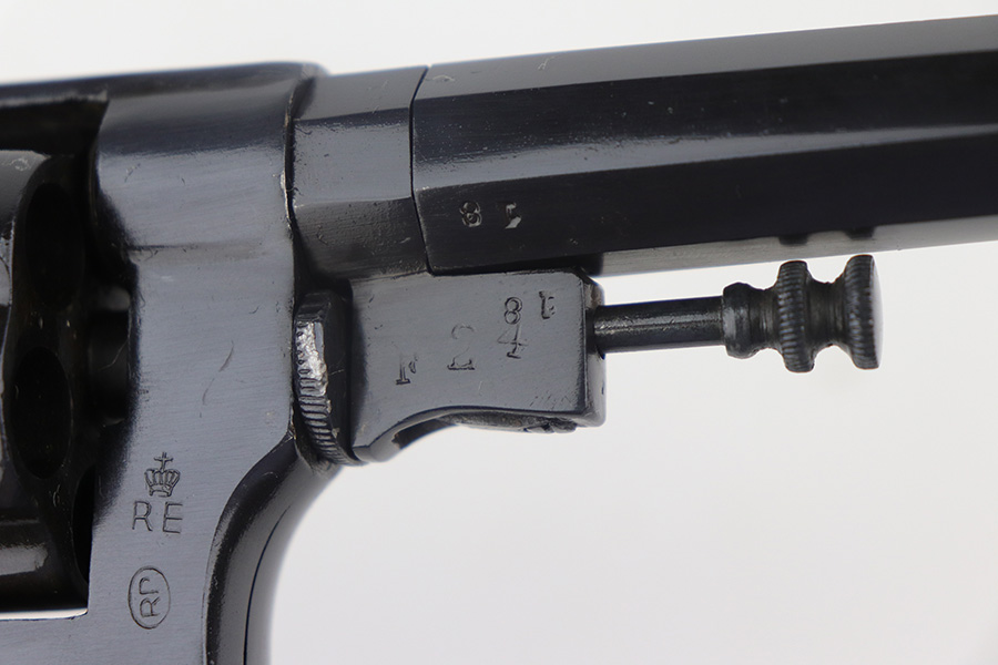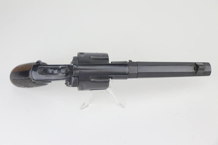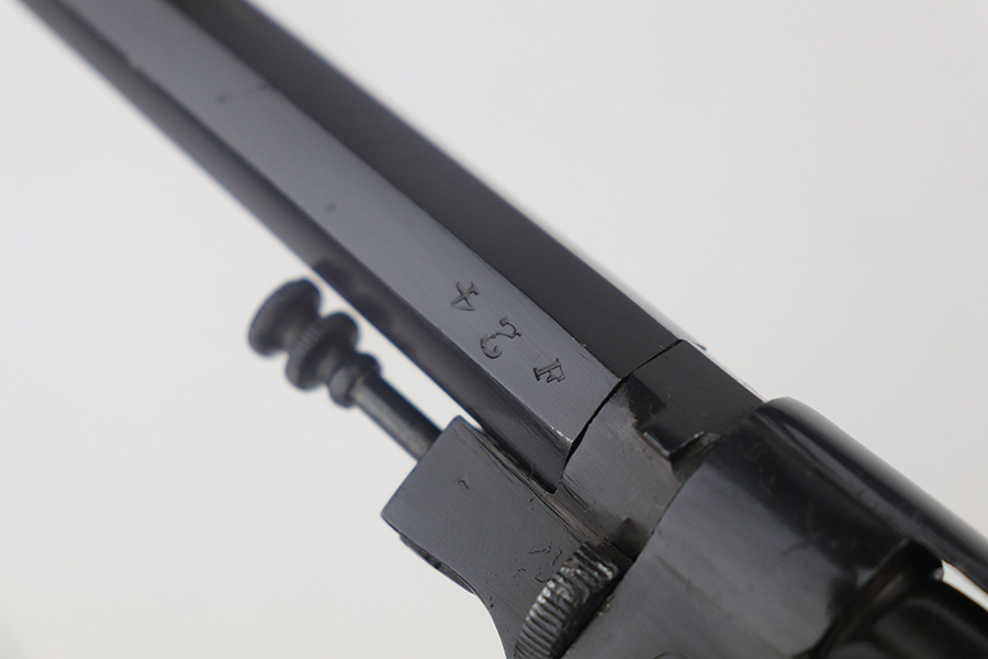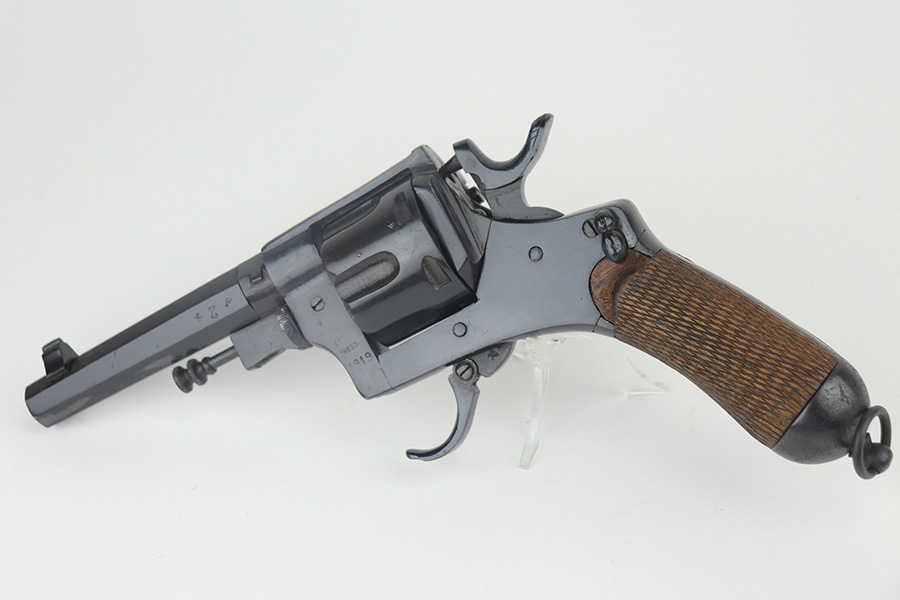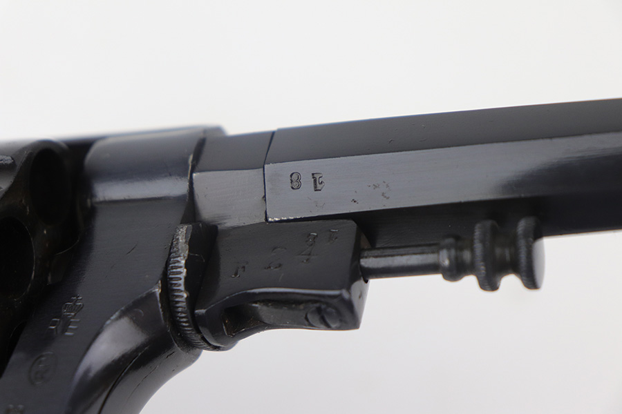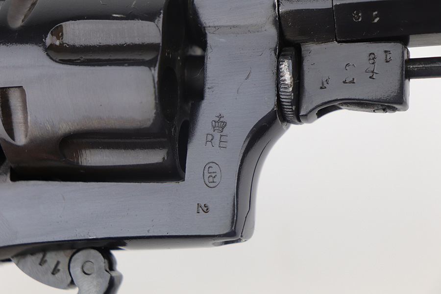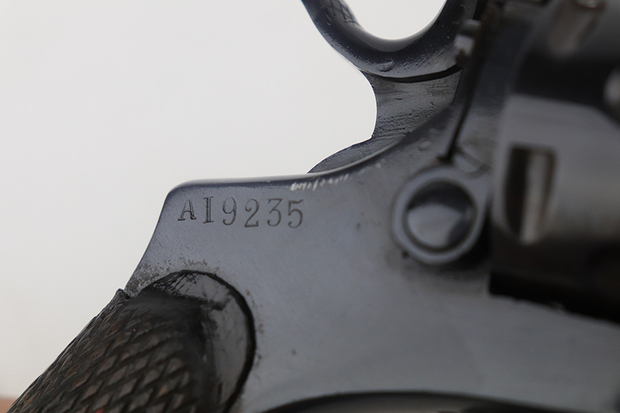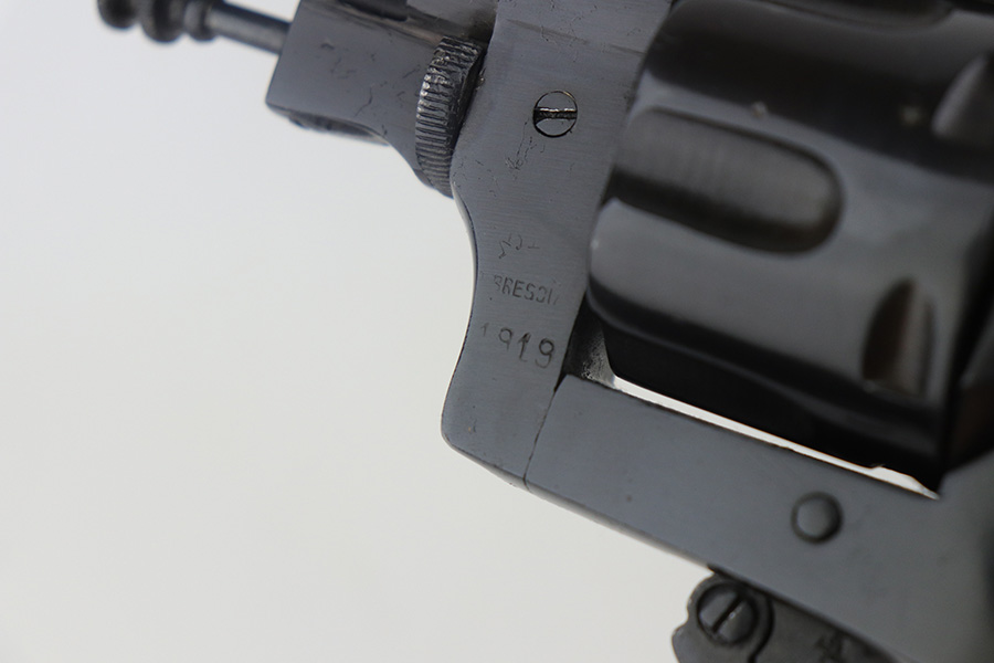 11/30/21 – This is an excellent example of an Italian Bodeo Model 1889 Revolver, manufactured in 1919. It is a Type 2 example with a folding trigger. It has the proper “Crown RE” royal Italian military proof on the right side of the frame. The frame and cylinder are matching. The barrel has numbers “18” and “F24” on it. The trigger appears to be numbered “111”. The gun has been professionally restored, so the bluing is bright. It has retained virtually all of its new bluing, but there is some very light freckling on both sides of the frame and spotty oxidation on both grip straps and base of the frame. The original lanyard ring is intact. Comes with nice wood grips – the condition of the left and right do not match each other exactly. The bore is shiny with strong rifling and some areas of light oxidation.