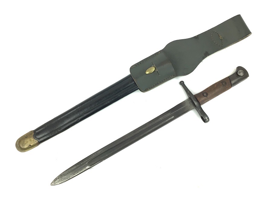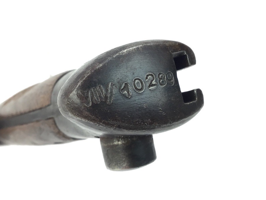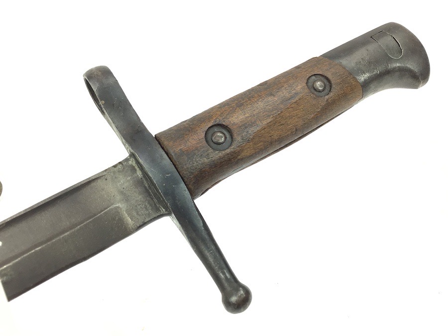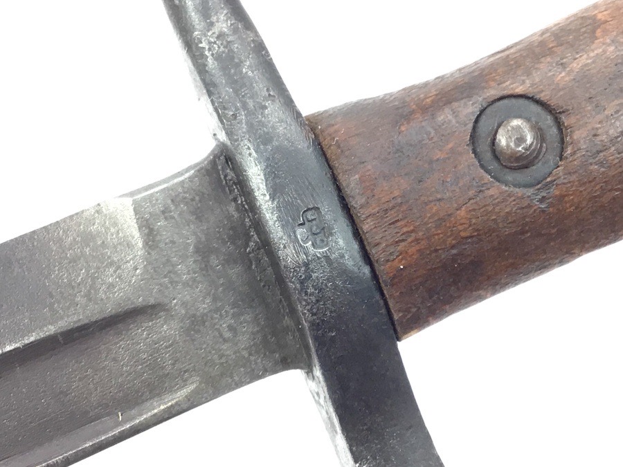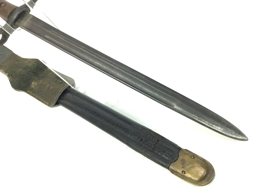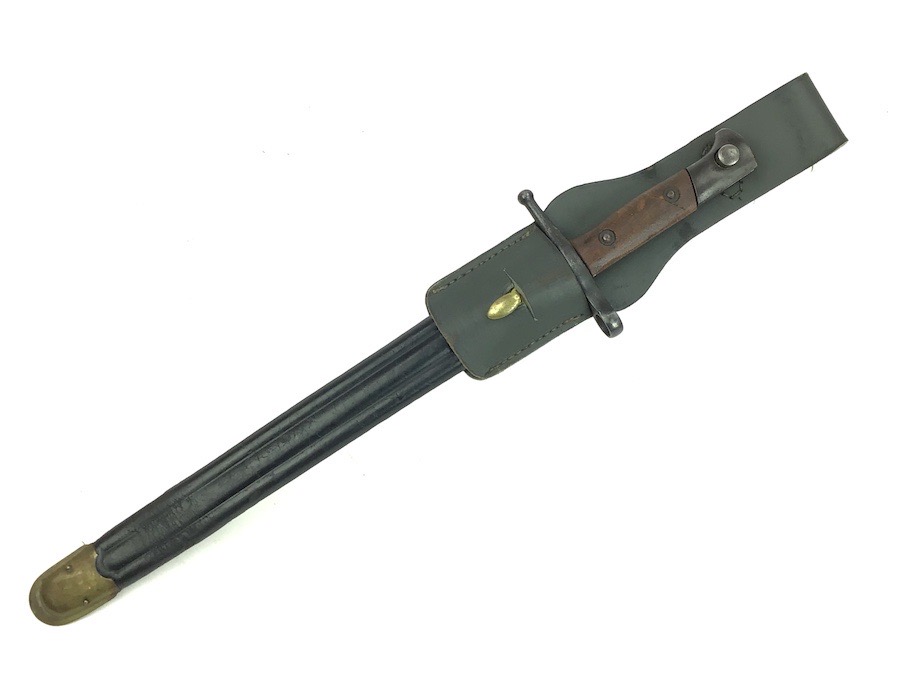 3/15/24 – This is an original Italian Carcano M1891 bayonet with an original scabbard. The bayonet blade is in good overall condition with dark surface patina and finish loss throughout the original finish. The edge shows minor signs of light sharpening. There’s dark patina and aging throughout the crossguard and pommel which is stamped VII/10289. The wood grips have some mild imperfections and aging wear but no major issues. Comes with an original scabbard that’s stamped “1917”. The leather frog appears to be a quality reproduction.