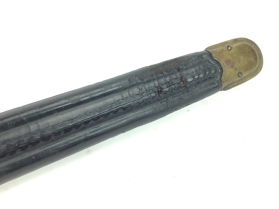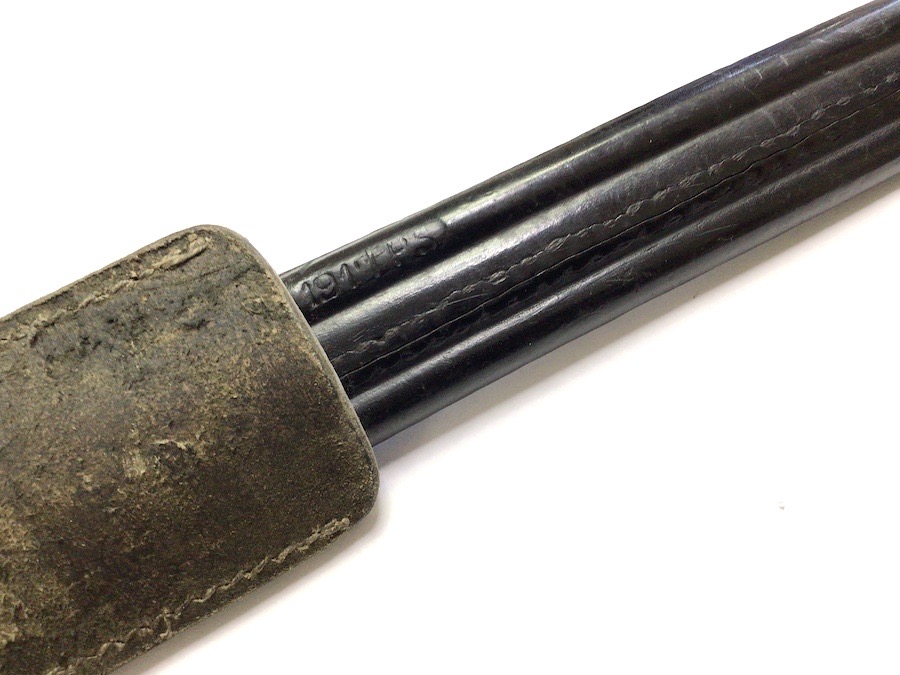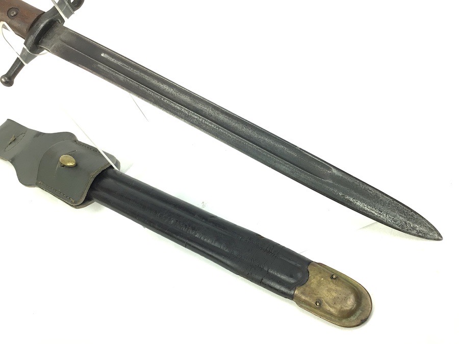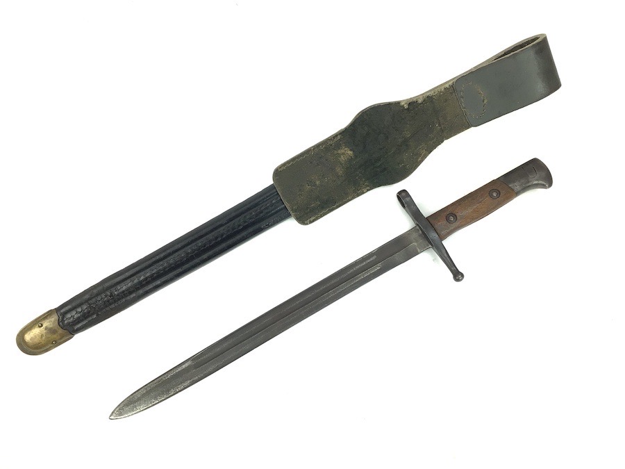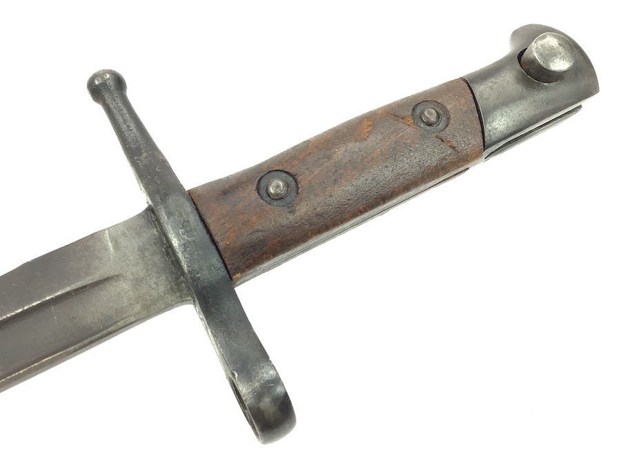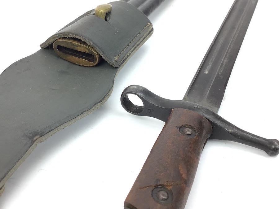 3/15/24 – This is an original Italian Carcano M1891 bayonet with an original scabbard. The bayonet blade is in good overall condition with dark surface patina and finish loss throughout the original finish. The edge shows minor signs of light sharpening. There’s dark patina and aging throughout the crossguard and pommel which is stamped VII/10289. The wood grips have some mild imperfections and aging wear but no major issues. Comes with an original scabbard that’s stamped “1917”. The leather frog appears to be a quality reproduction.