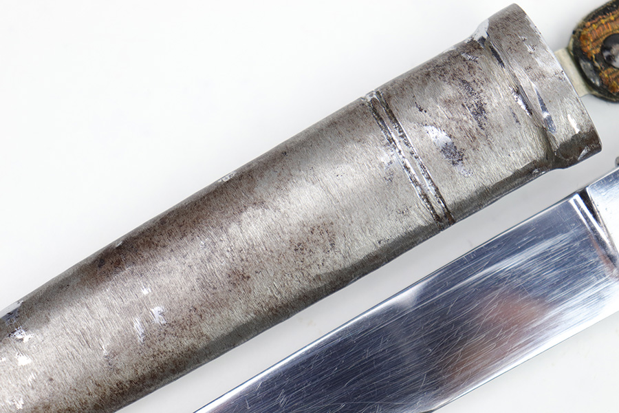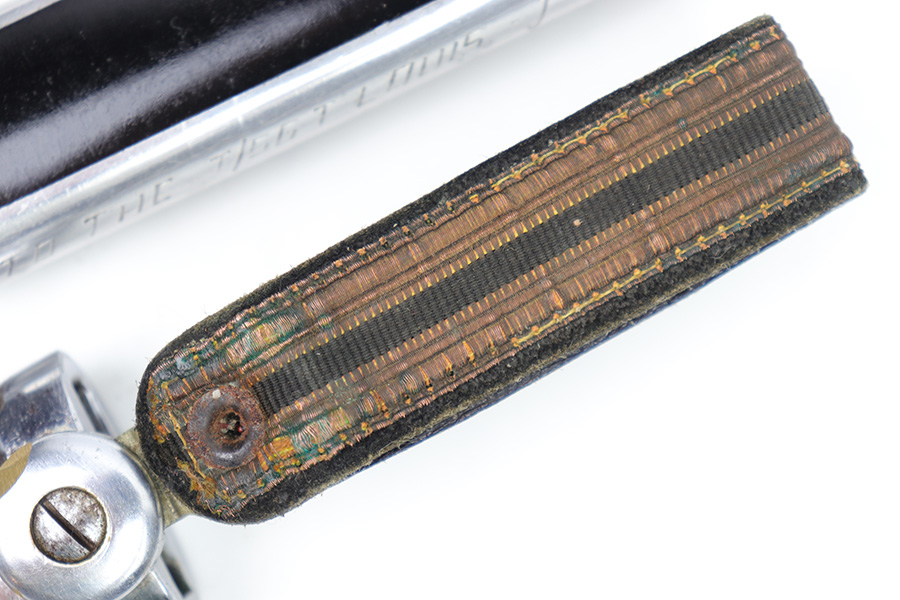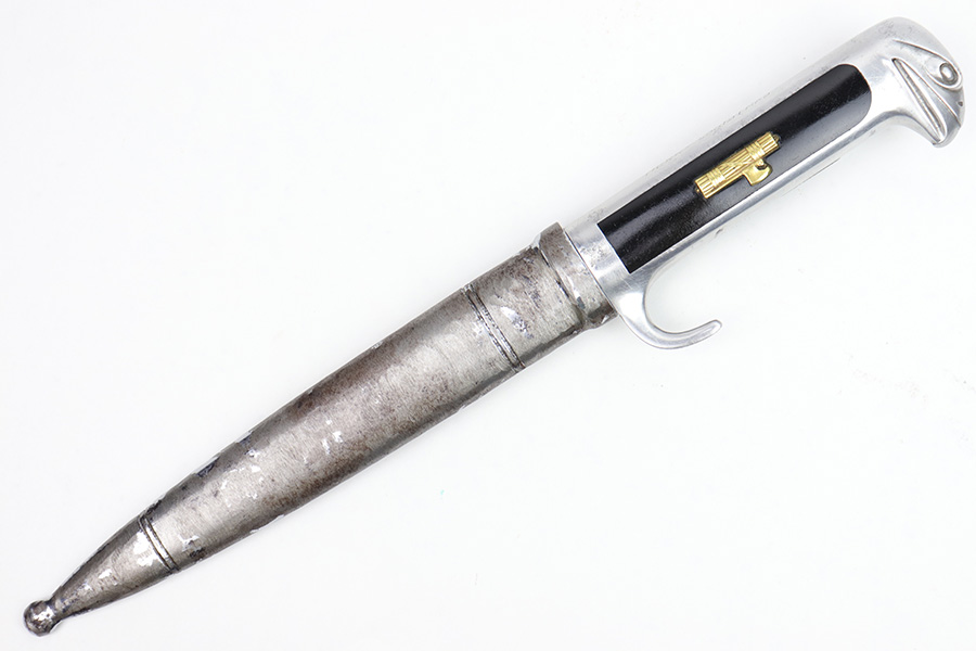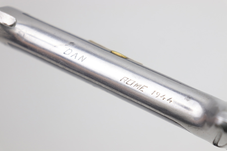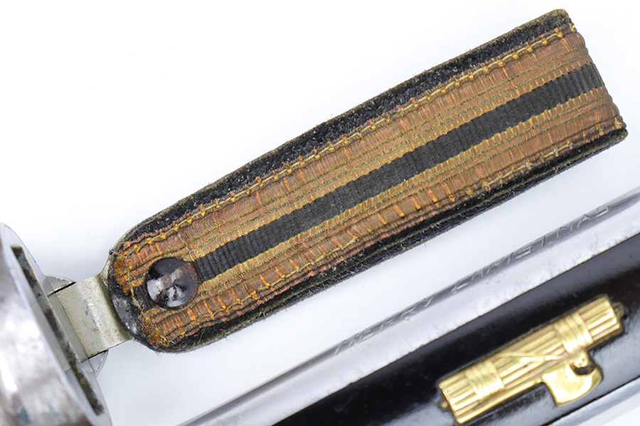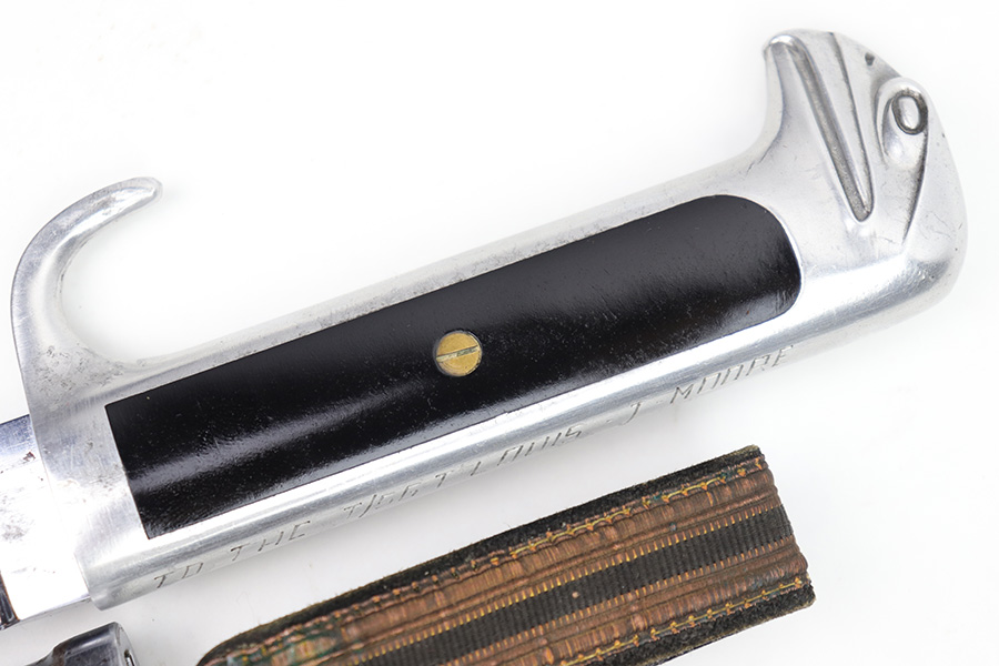 1/20/23 – This is an original Italian MVSN (Milizia Voluntaria per la Sicurezza Nazionale) dagger. Also known as a “blackshirts” officer dagger. These were used by the Italian Voluntary Militia as both a dress and combat knife. This example has a lightweight aluminum hilt / handle that is inscribed on the spine “To the Sgt. Louis J Moore, Merry Christmas”. The interior edge of the handle is inscribed, “Dan , Rome 1944”. So likely a US captured item that was later gifted to a commanding officer. The dagger blade is shiny with a polished look and unsharpened edge. No major issues or notable flaws on the dagger or handle. The scabbard has surface patina and machine wear throughout, as if someone ground down the exterior. The scabbard is still completely intact with no major dents and is functional. Comes with a cloth frog as shown.