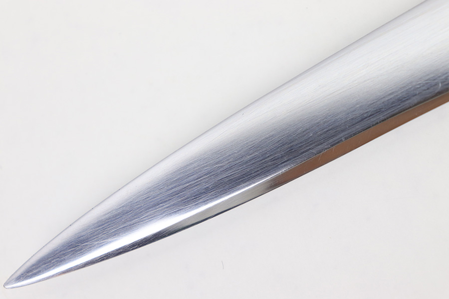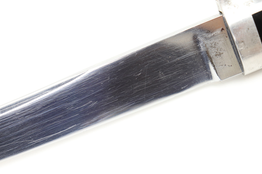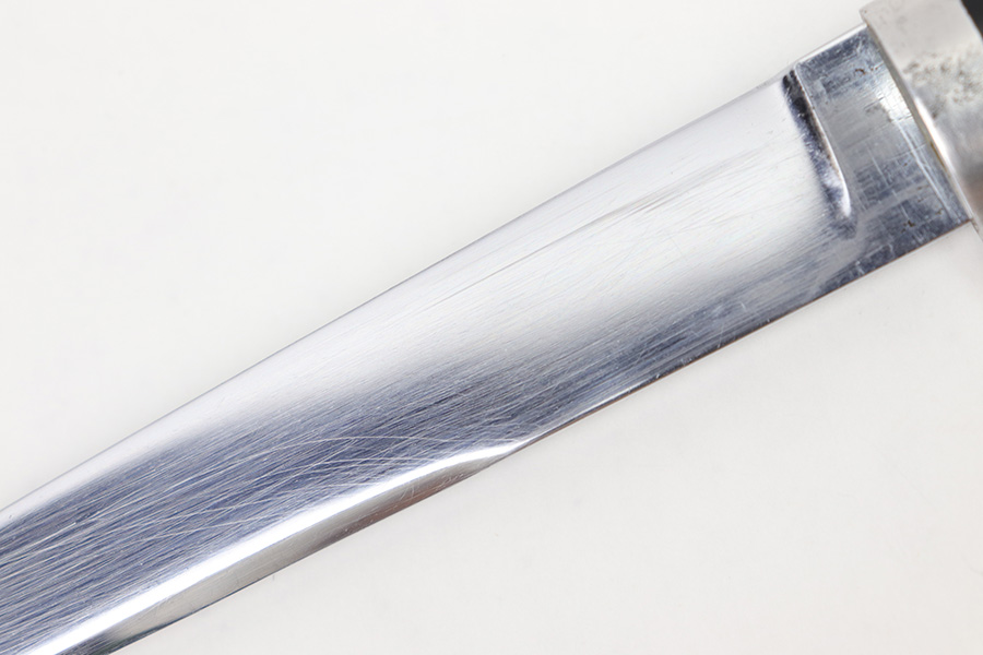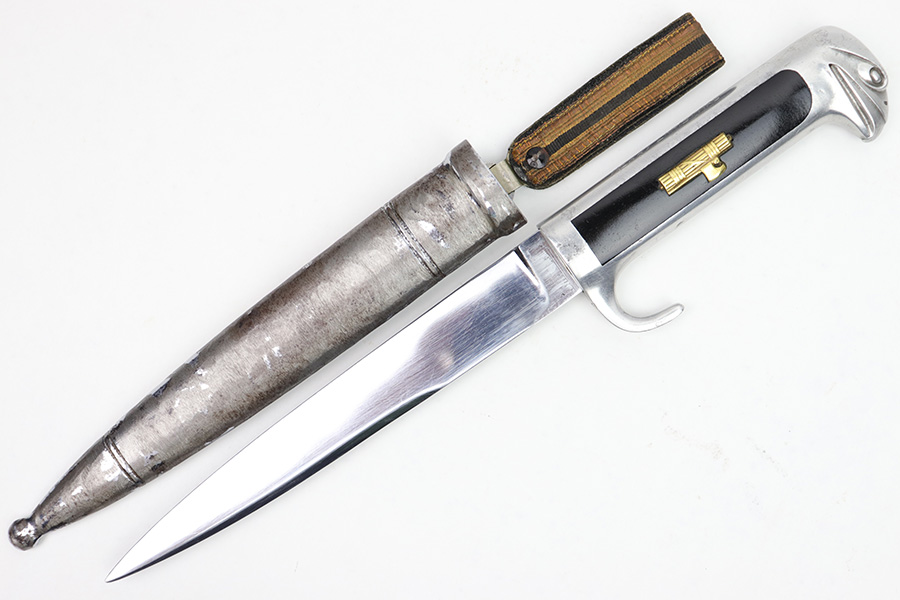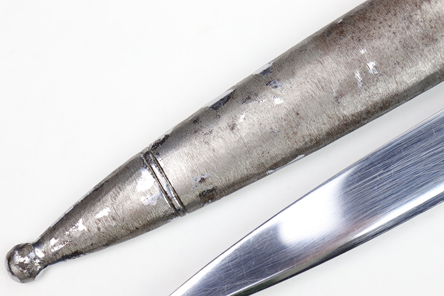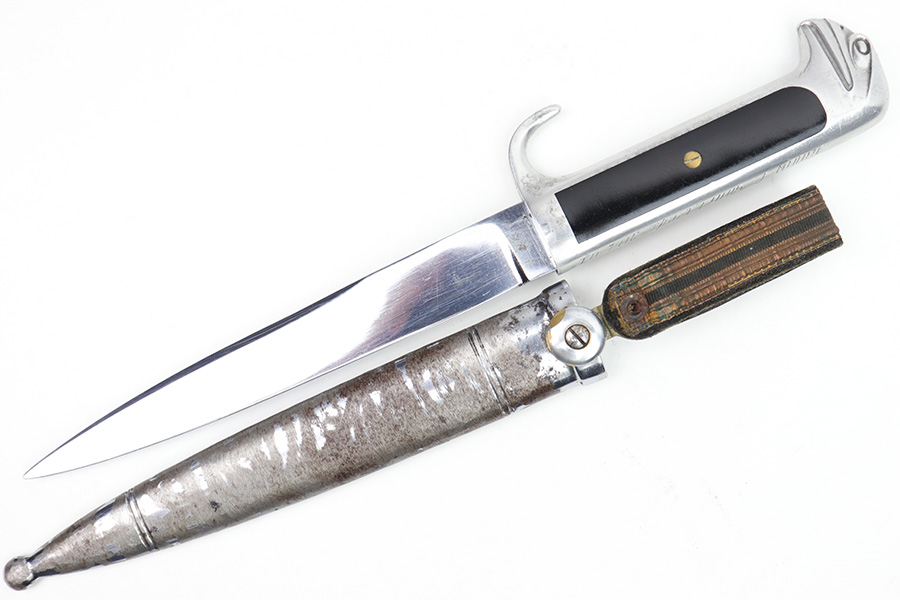 1/20/23 – This is an original Italian MVSN (Milizia Voluntaria per la Sicurezza Nazionale) dagger. Also known as a “blackshirts” officer dagger. These were used by the Italian Voluntary Militia as both a dress and combat knife. This example has a lightweight aluminum hilt / handle that is inscribed on the spine “To the Sgt. Louis J Moore, Merry Christmas”. The interior edge of the handle is inscribed, “Dan , Rome 1944”. So likely a US captured item that was later gifted to a commanding officer. The dagger blade is shiny with a polished look and unsharpened edge. No major issues or notable flaws on the dagger or handle. The scabbard has surface patina and machine wear throughout, as if someone ground down the exterior. The scabbard is still completely intact with no major dents and is functional. Comes with a cloth frog as shown.