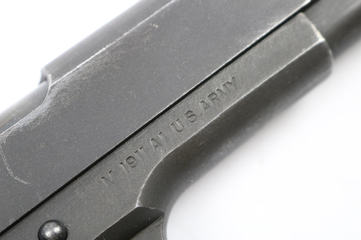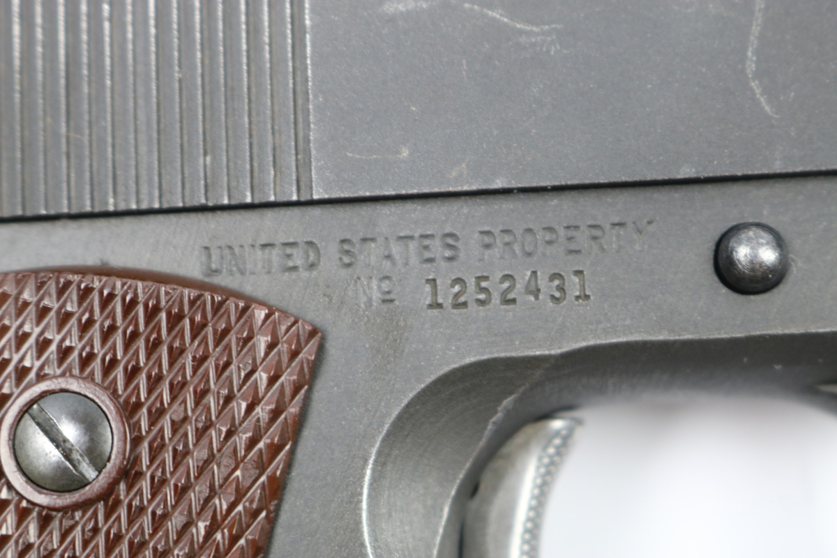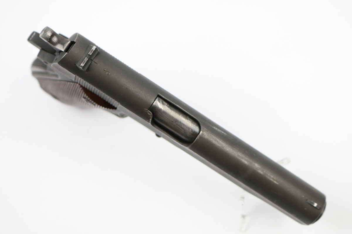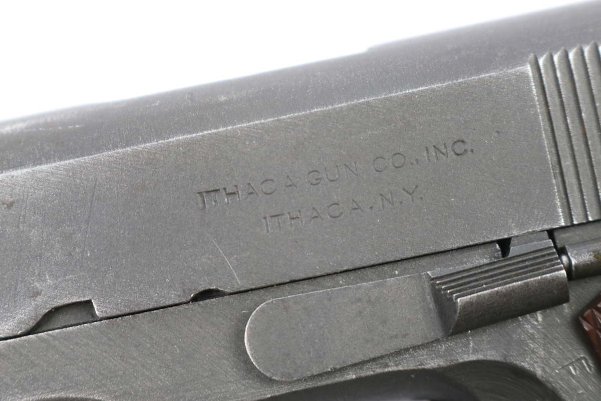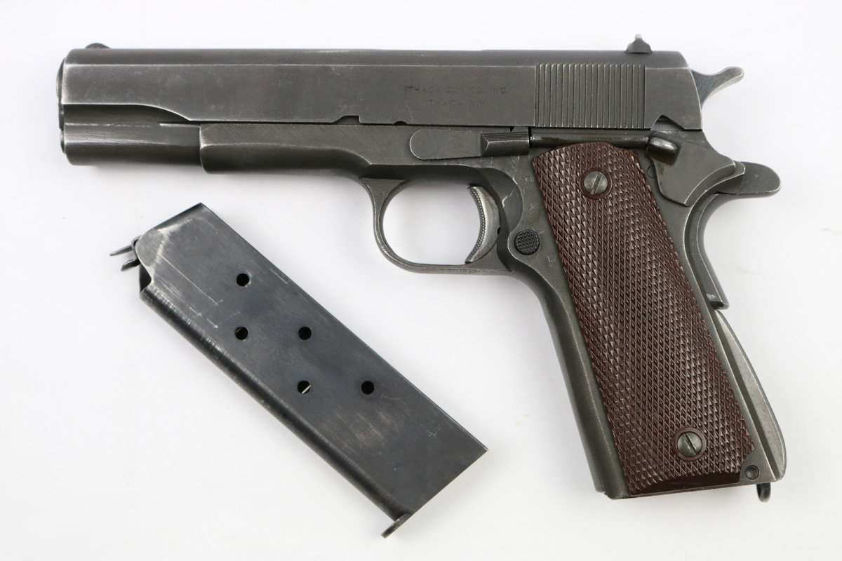 6/15/18 – This is an original World War II era Ithaca 1911A1, manufactured in 1943. The original parkerized finish rates at 92% with some general dulling of the finish, edge wear, and some finish thinning on the front strap. Most of the wear is general thinning on the slide – and makes the overall condition rating difficult (the gun looks very nice overall). HS marked barrel is correct and has excellent bore with some minor signs of use. Guaranteed original and fully functional.