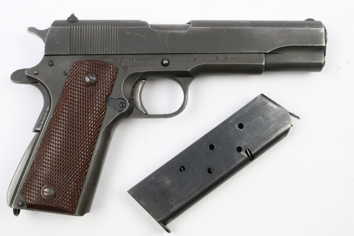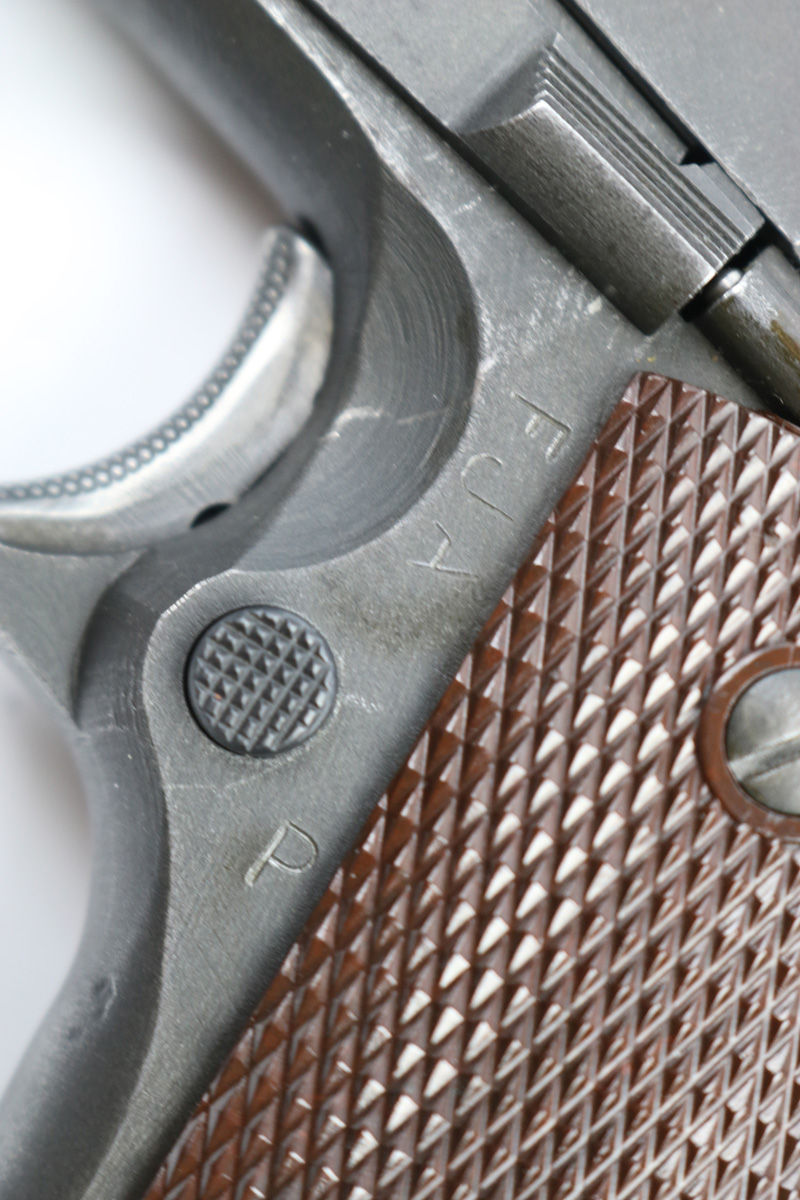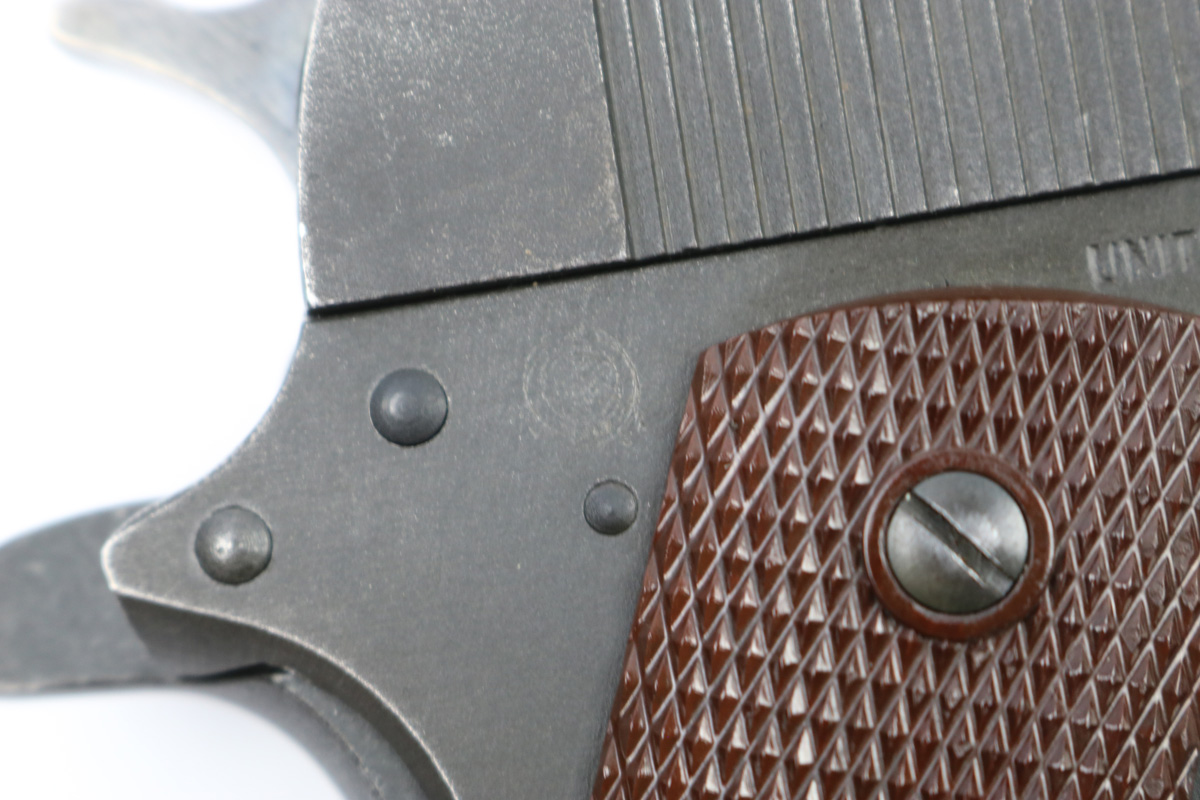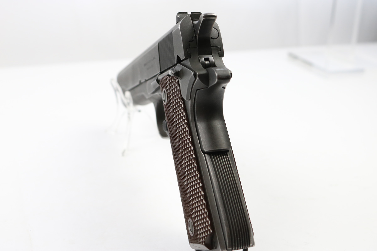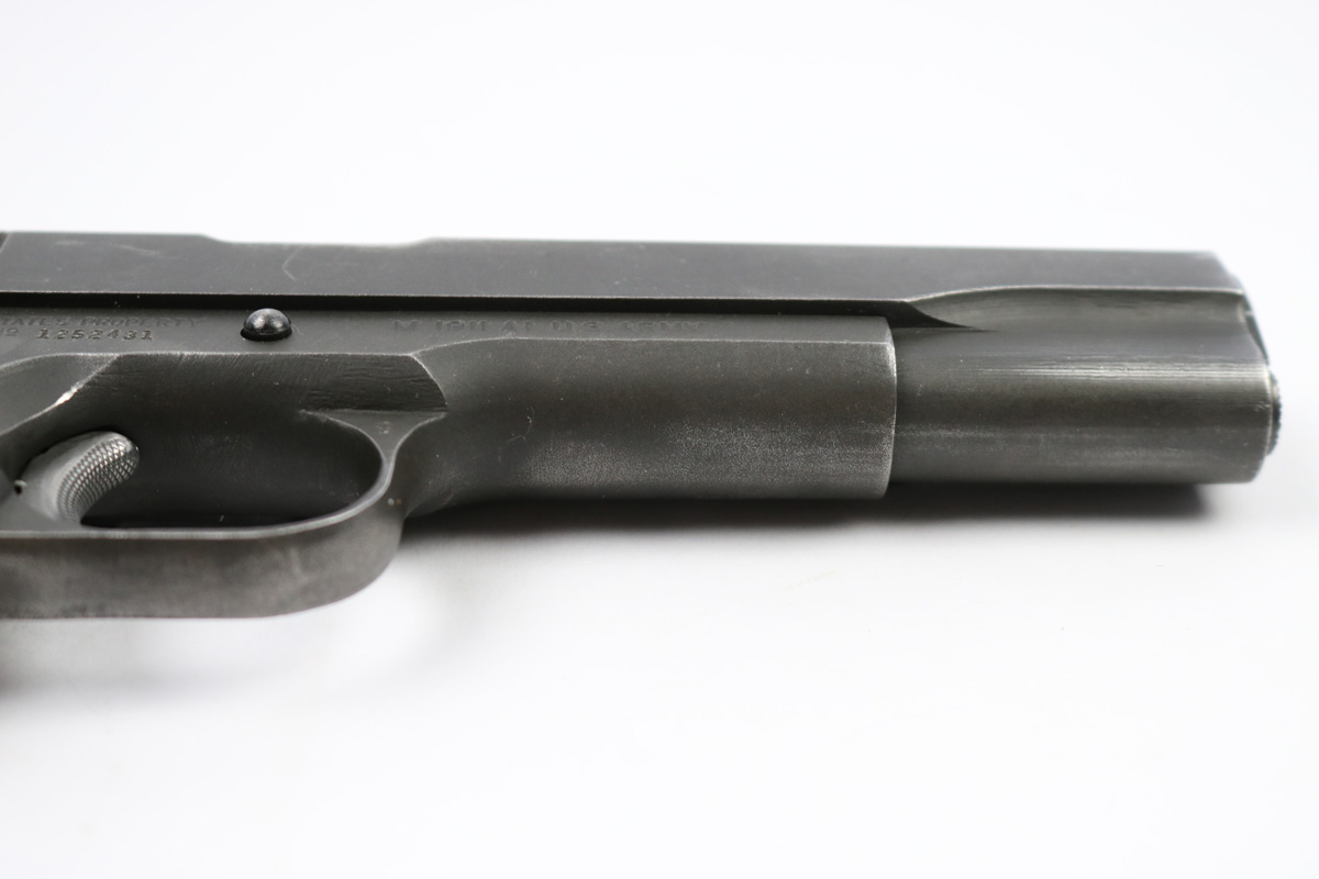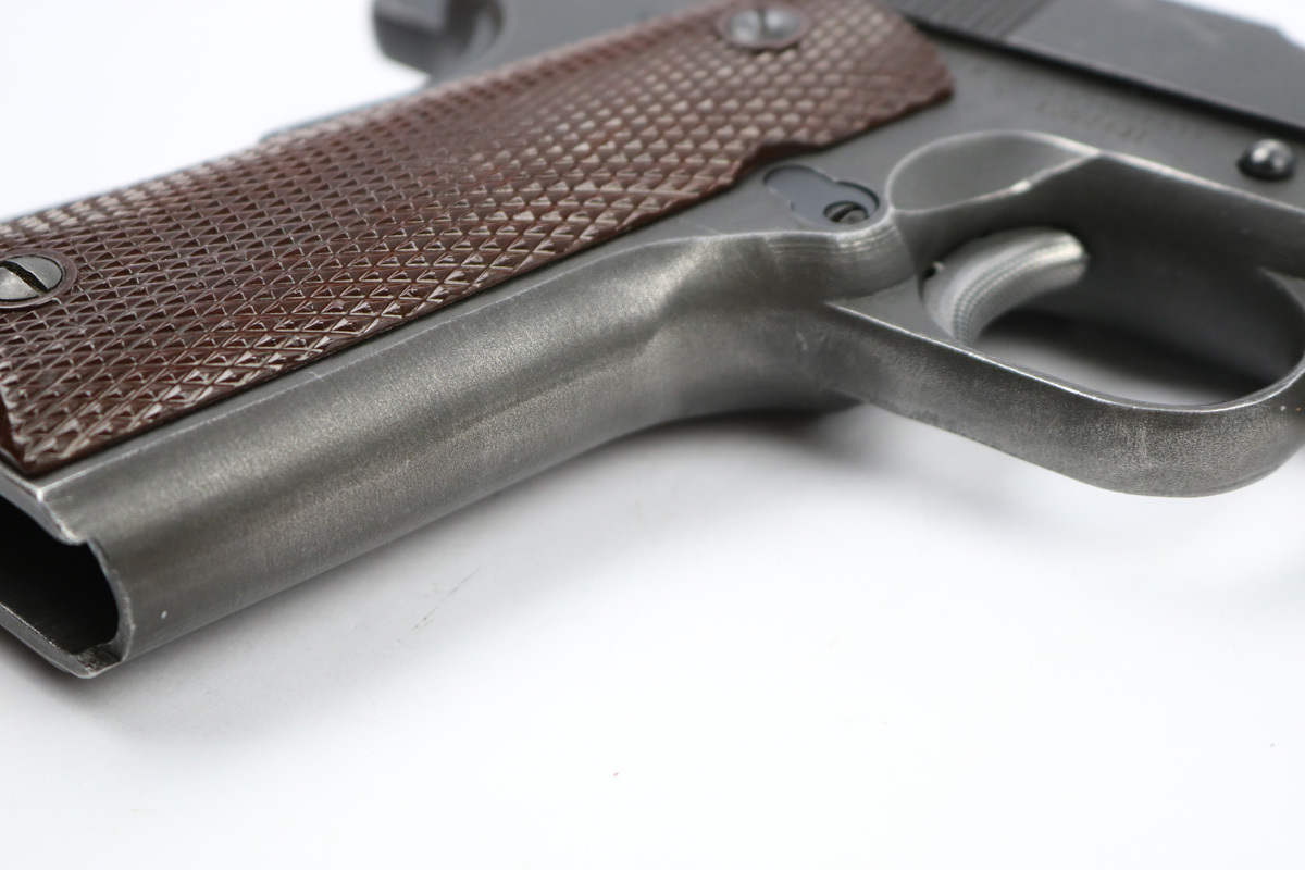 6/15/18 – This is an original World War II era Ithaca 1911A1, manufactured in 1943. The original parkerized finish rates at 92% with some general dulling of the finish, edge wear, and some finish thinning on the front strap. Most of the wear is general thinning on the slide – and makes the overall condition rating difficult (the gun looks very nice overall). HS marked barrel is correct and has excellent bore with some minor signs of use. Guaranteed original and fully functional.