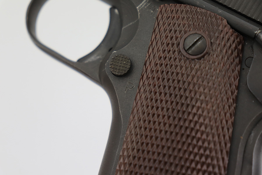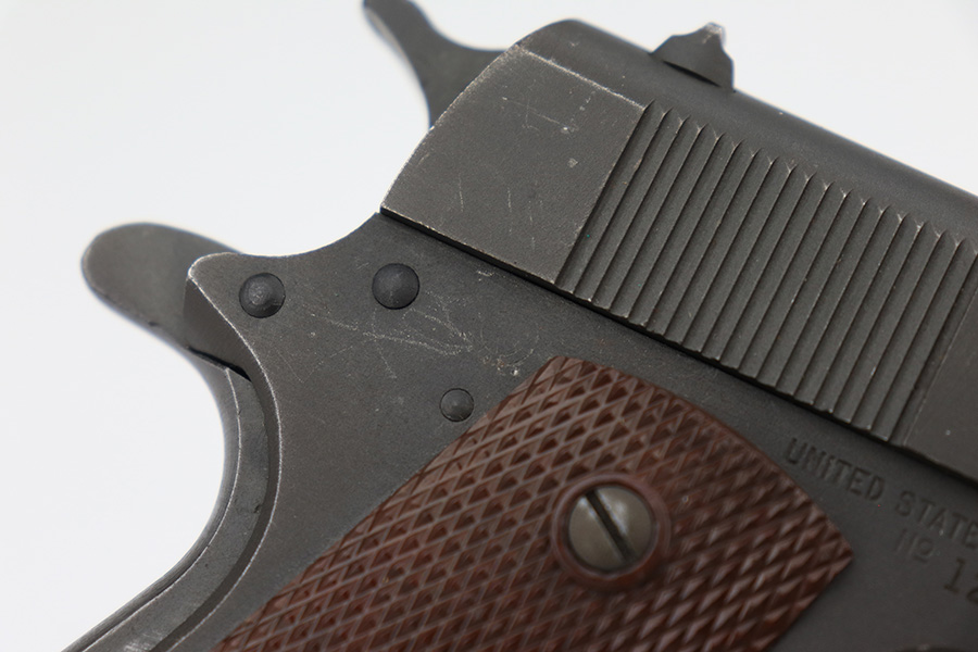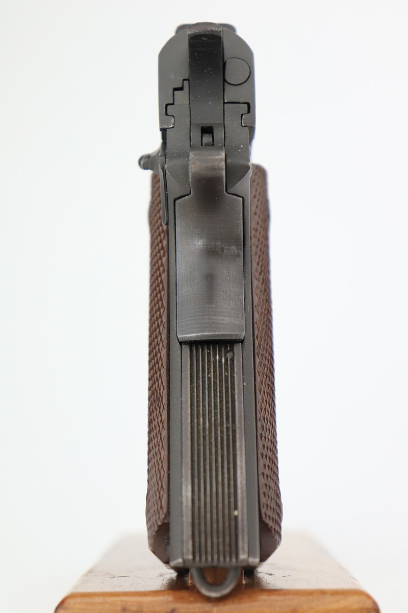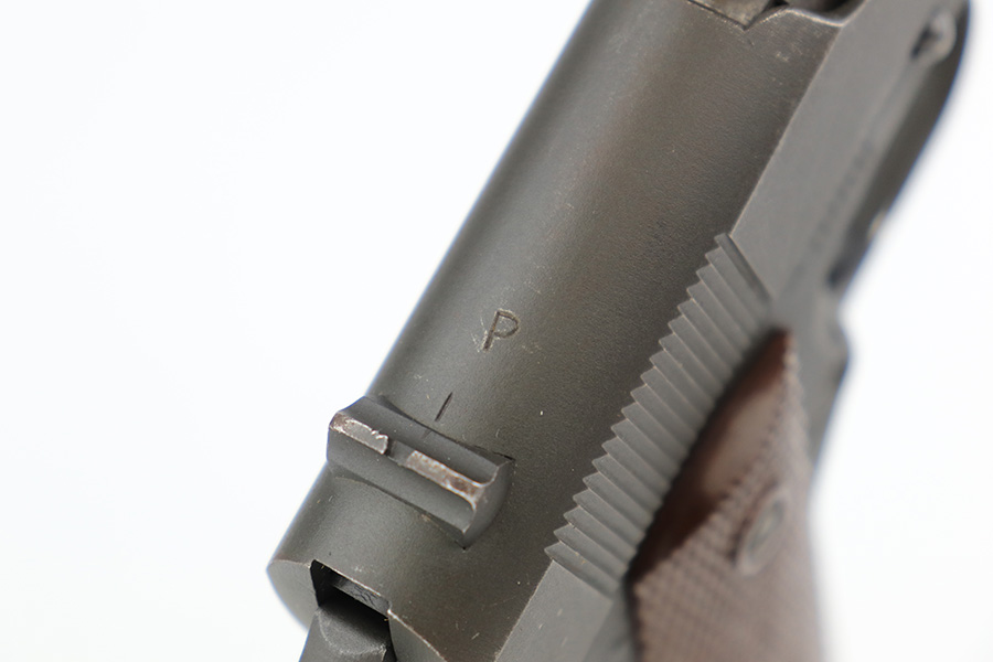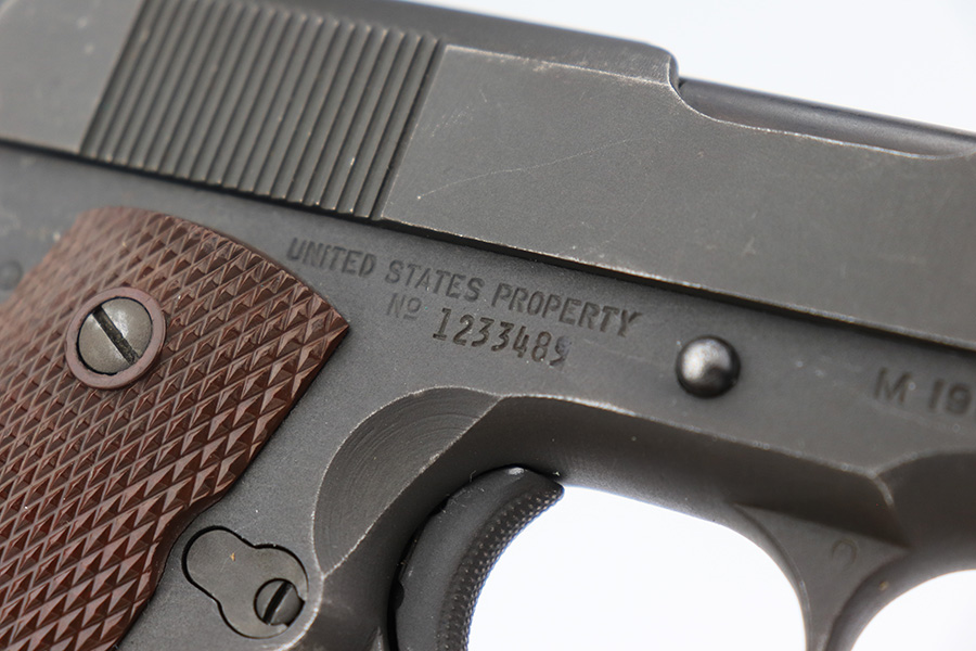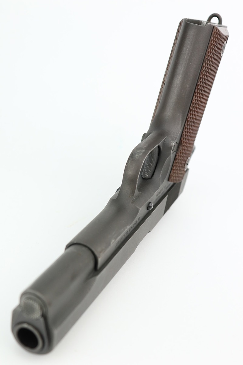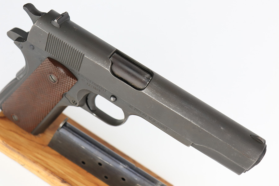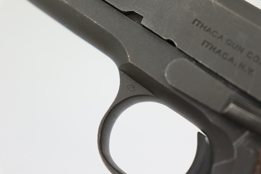4/10/23 – This is an excellent, original Ithaca 1911A1 that was issued to the U.S. military at either the very end of 1943, or very start of 1944. Ithaca frame and slide with proper HS barrel. FJA inspector’s mark on frame. The finish rates at around 95% with most of the wear on the left side of the slide and front frame edge. Minty bore. Excellent grips with sharp checkering. Scoville mag.